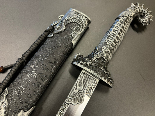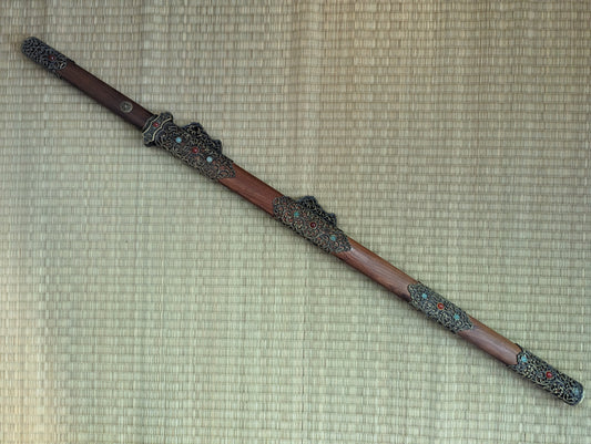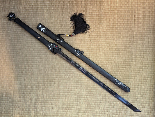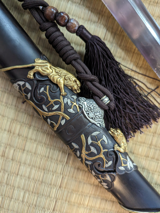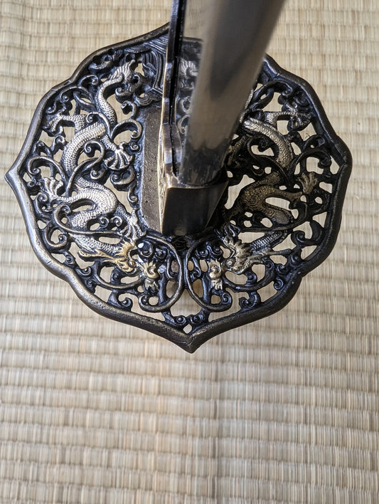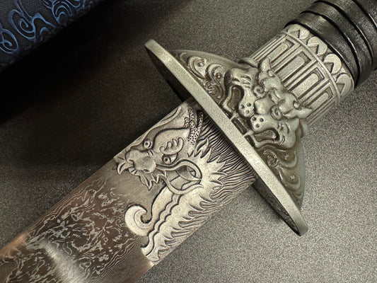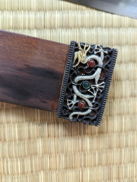 Ming Saber- Dragon Fittings, Clay Tempered Damascus Steel, rectangular profile scabbard