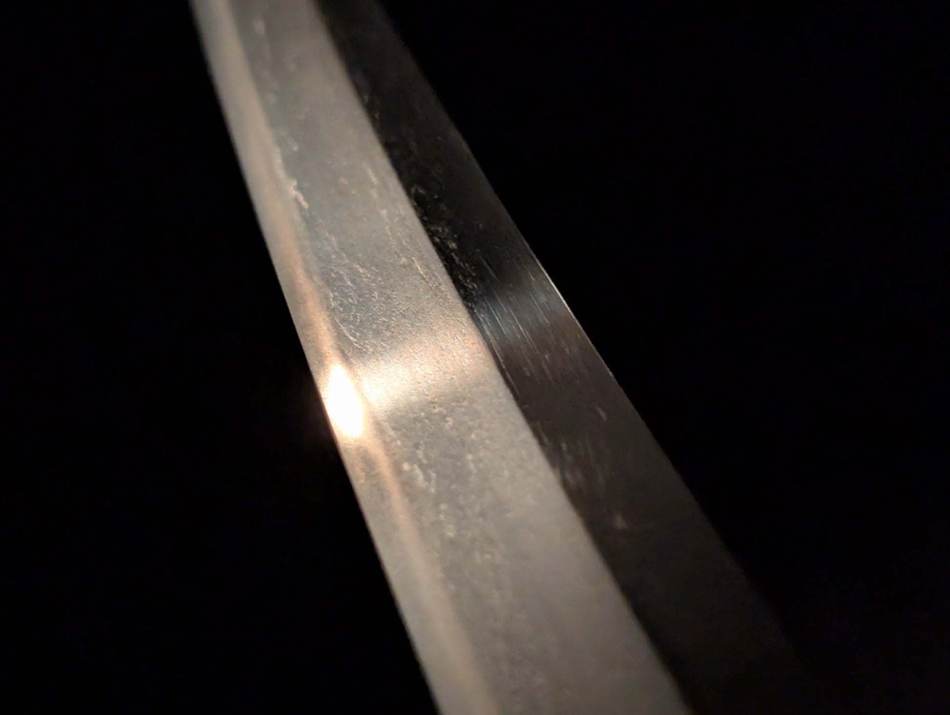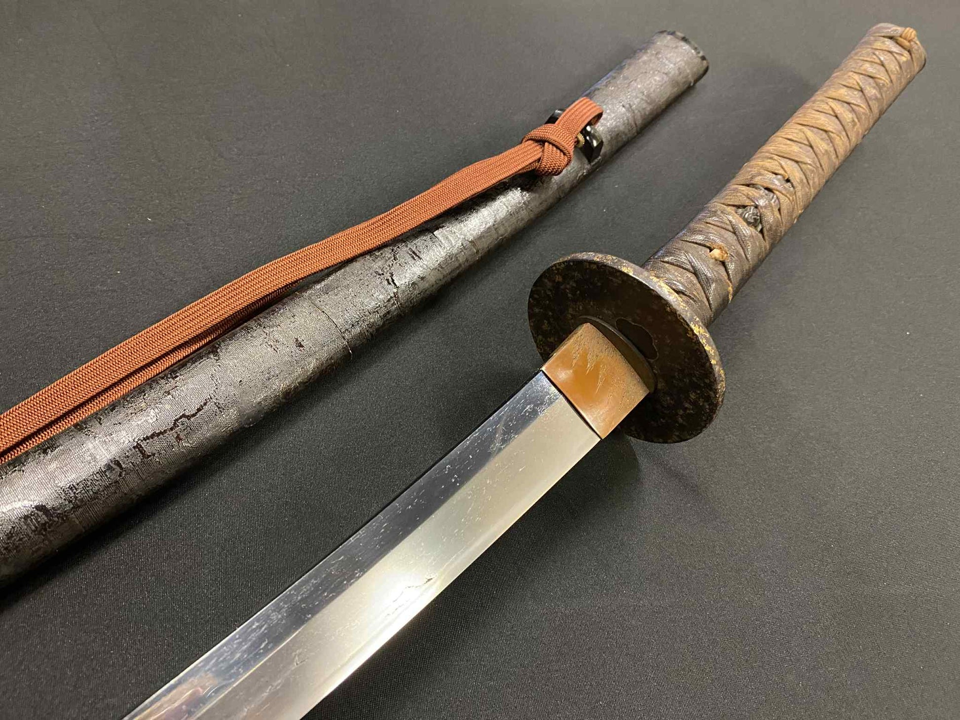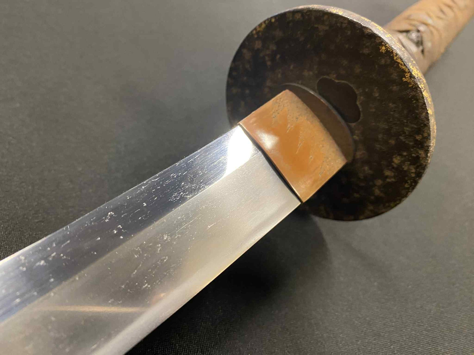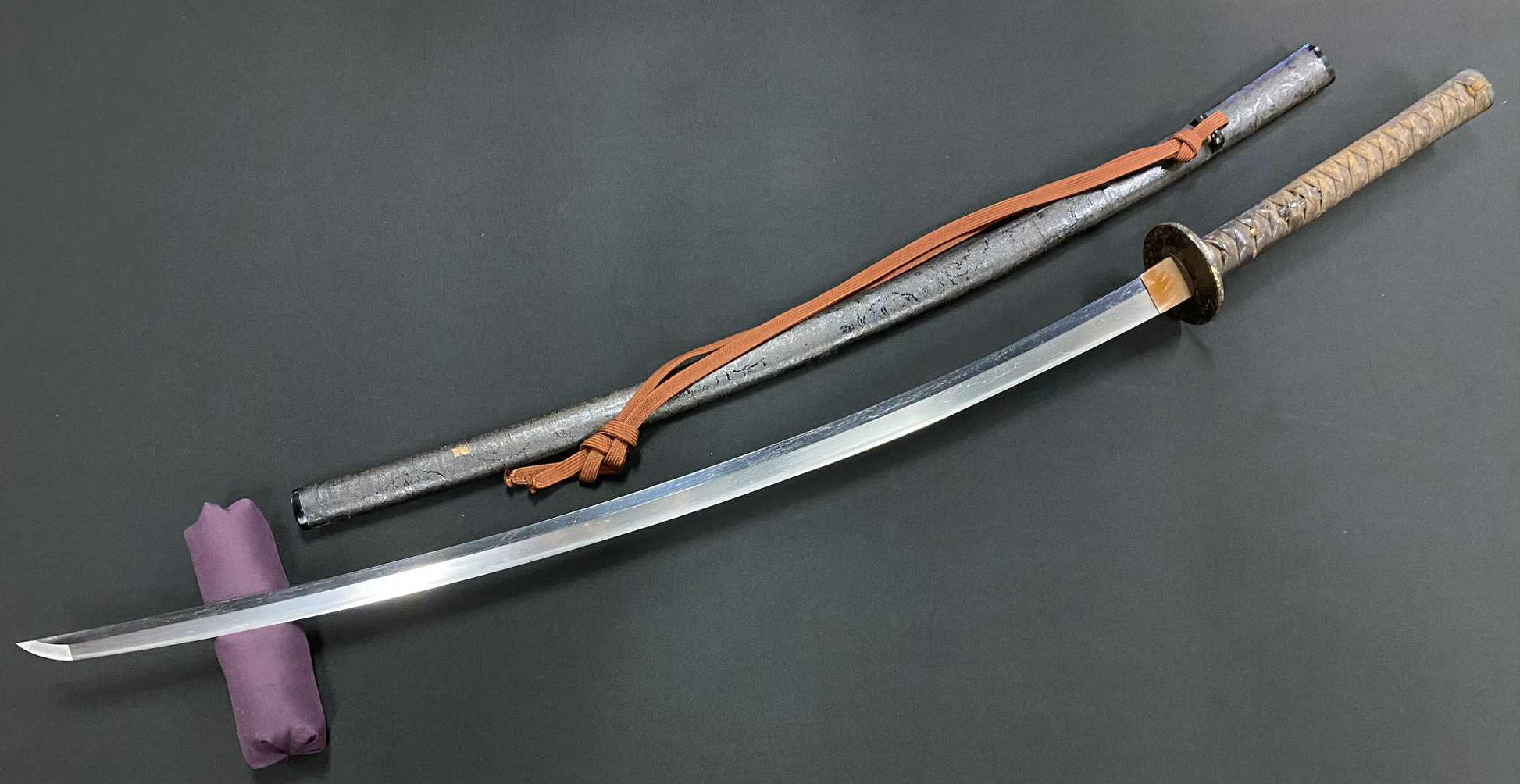 This particular sword was shortened from an event longer blades and has been polished several times, exposing several kitae ware. Still, at 84.1cm cutting edge and 3.1cm curve, it has an imposing or presence.