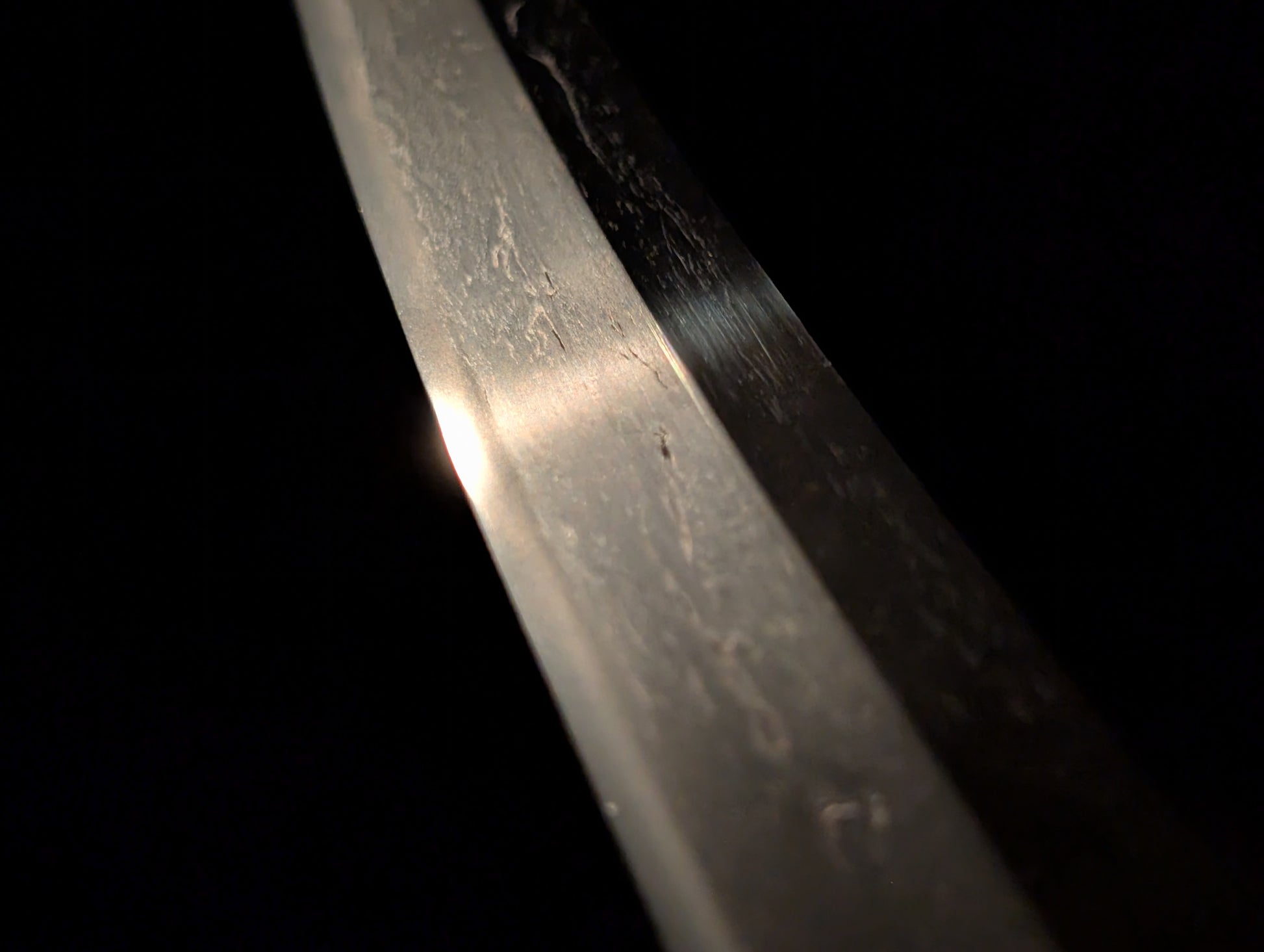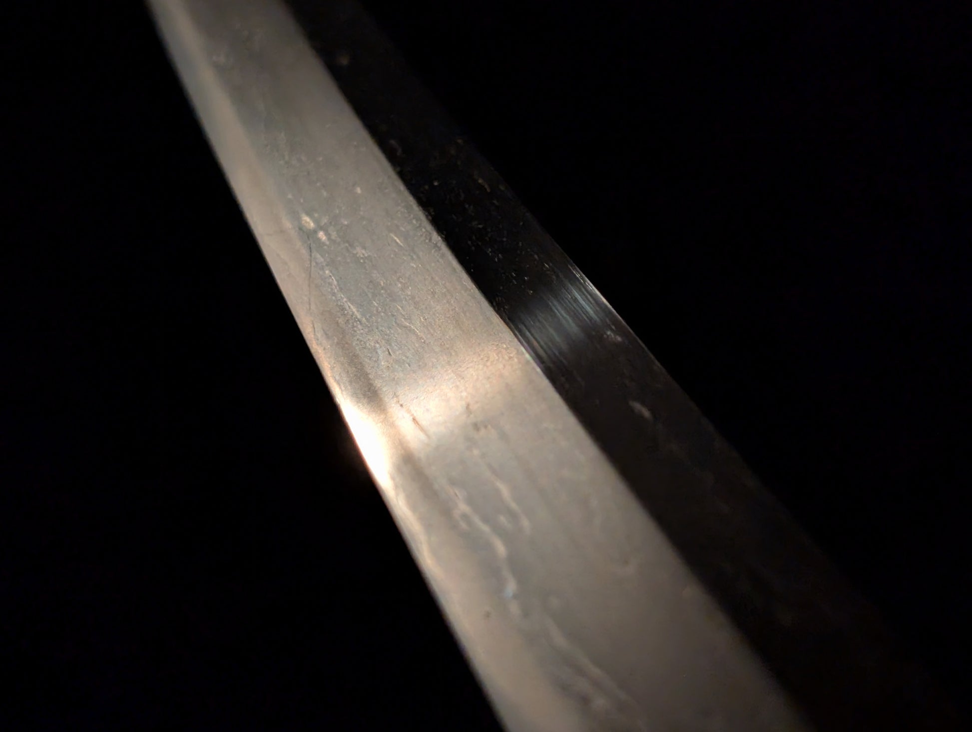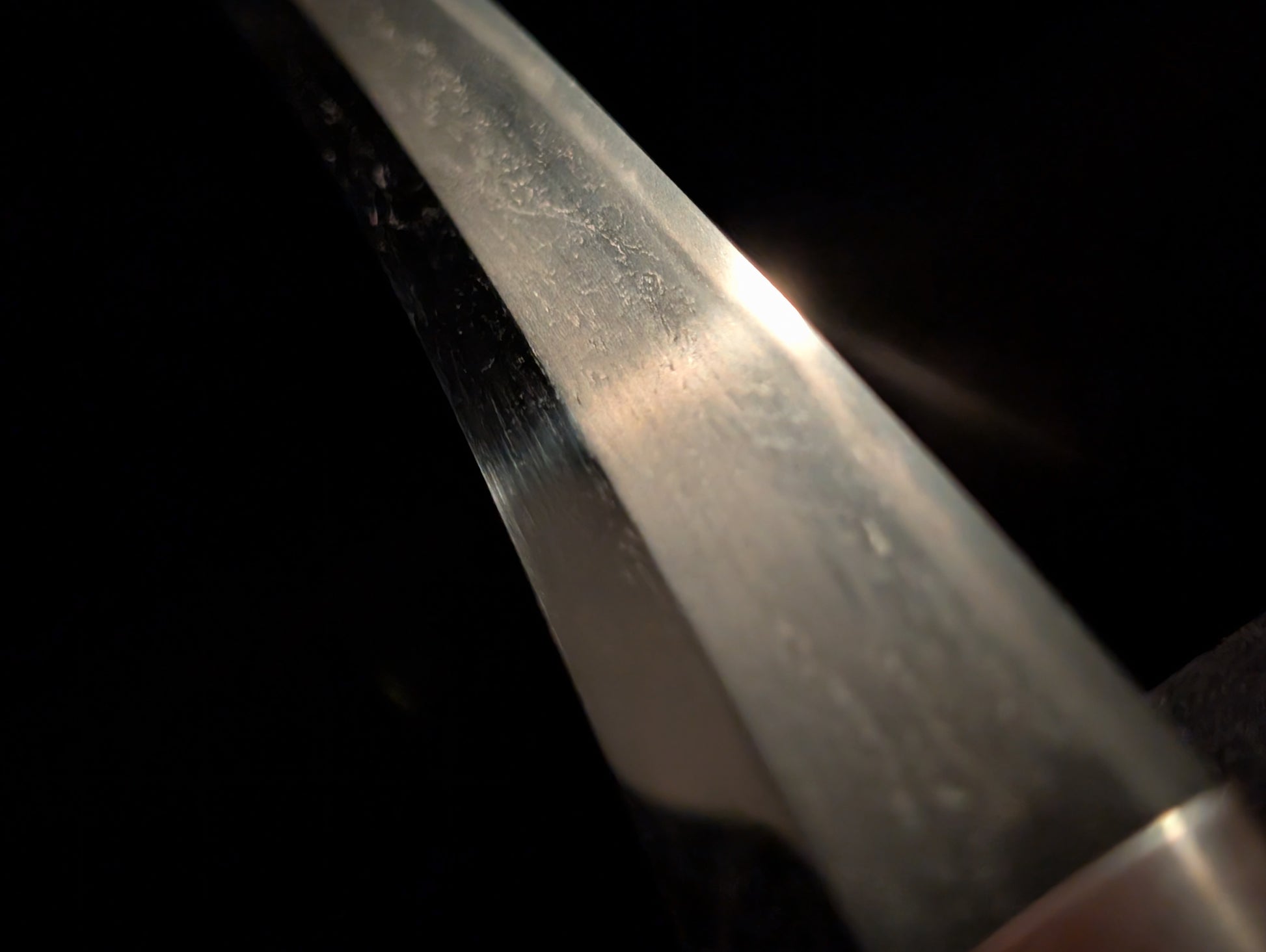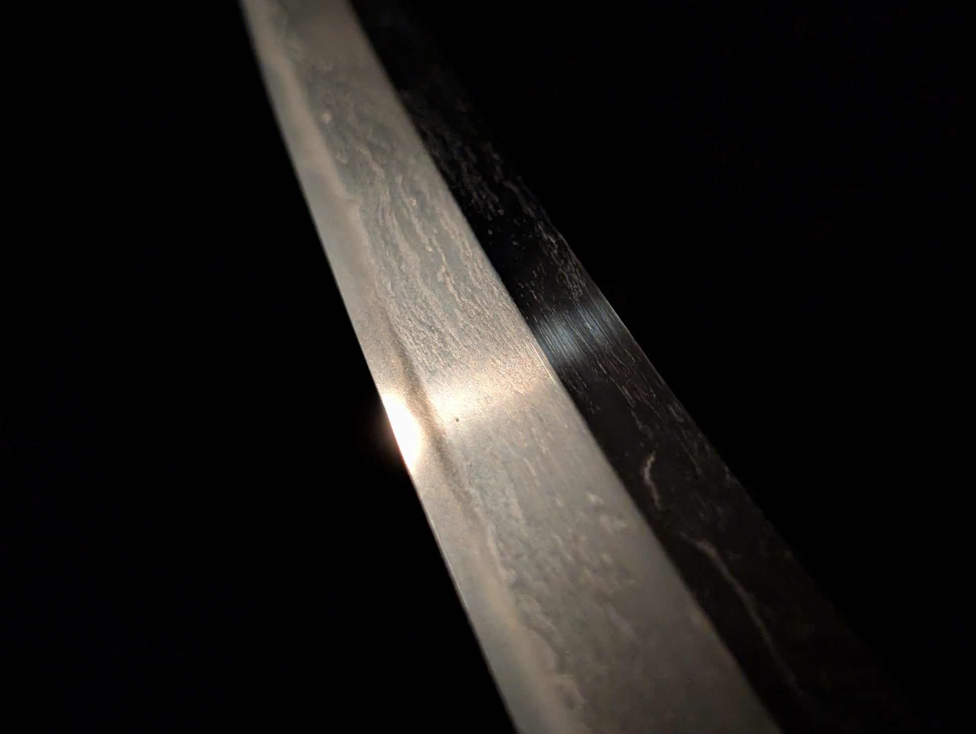 This particular sword was shortened from an event longer blades and has been polished several times, exposing several kitae ware. Still, at 84.1cm cutting edge and 3.1cm curve, it has an imposing or presence.