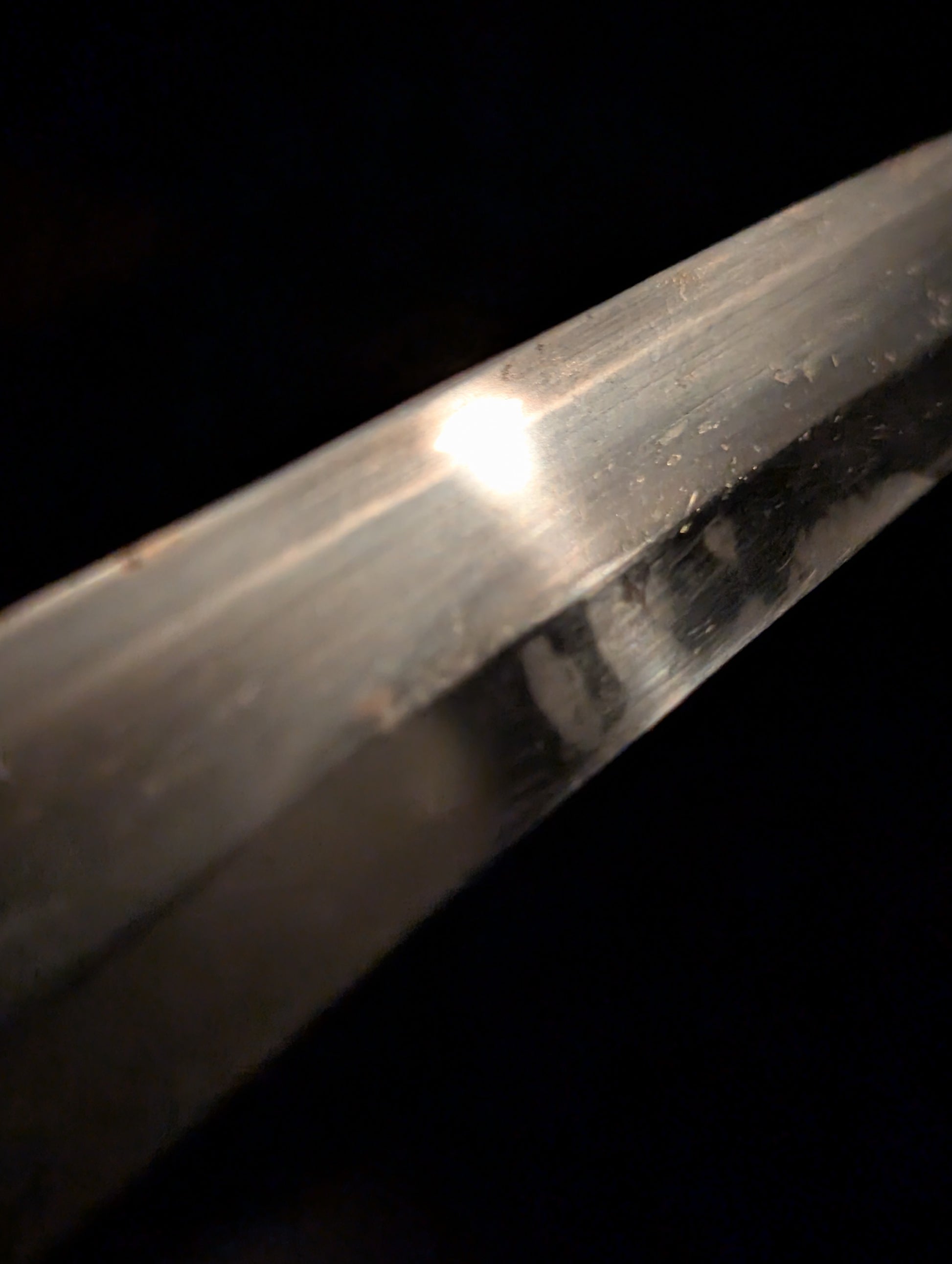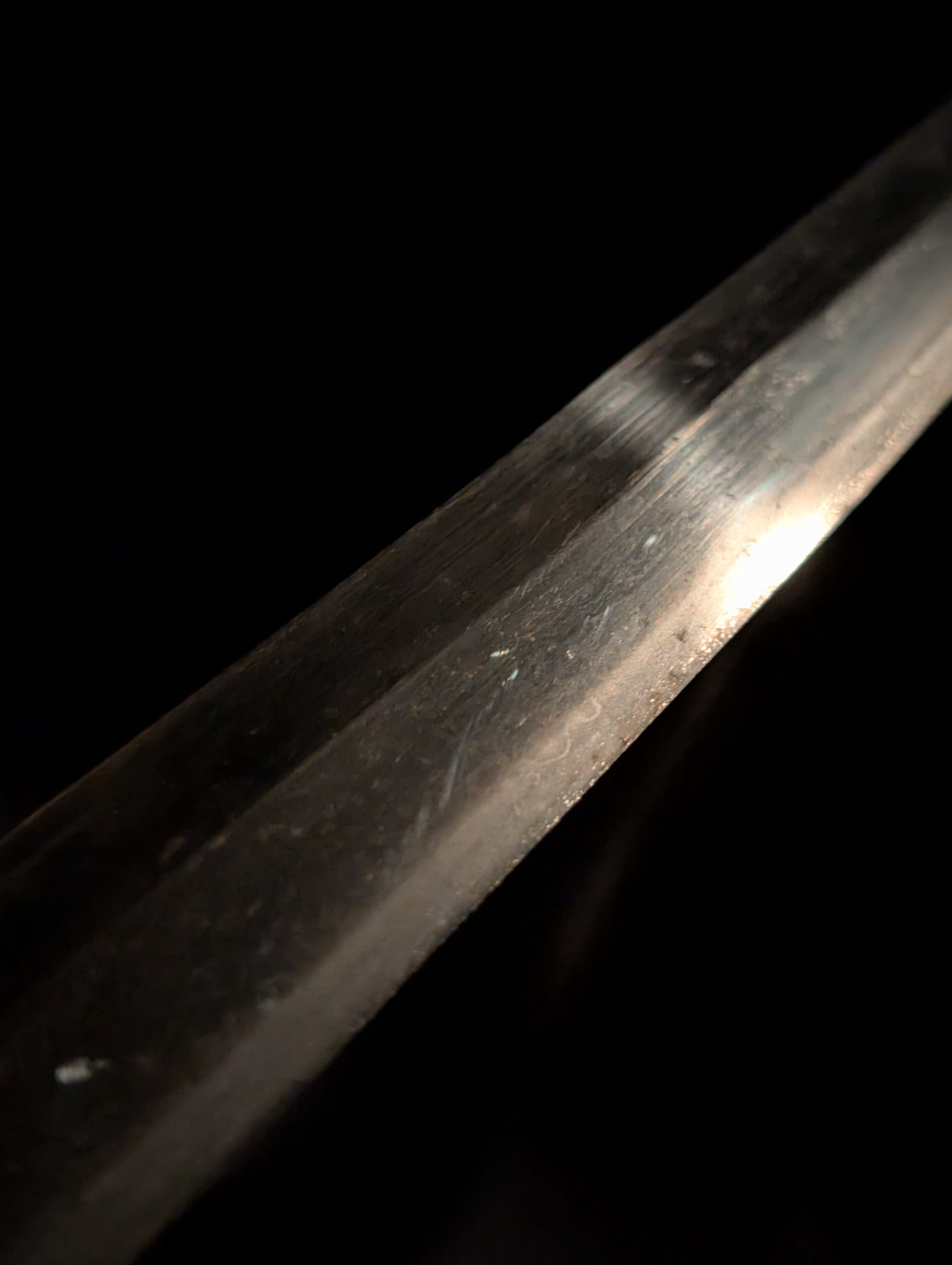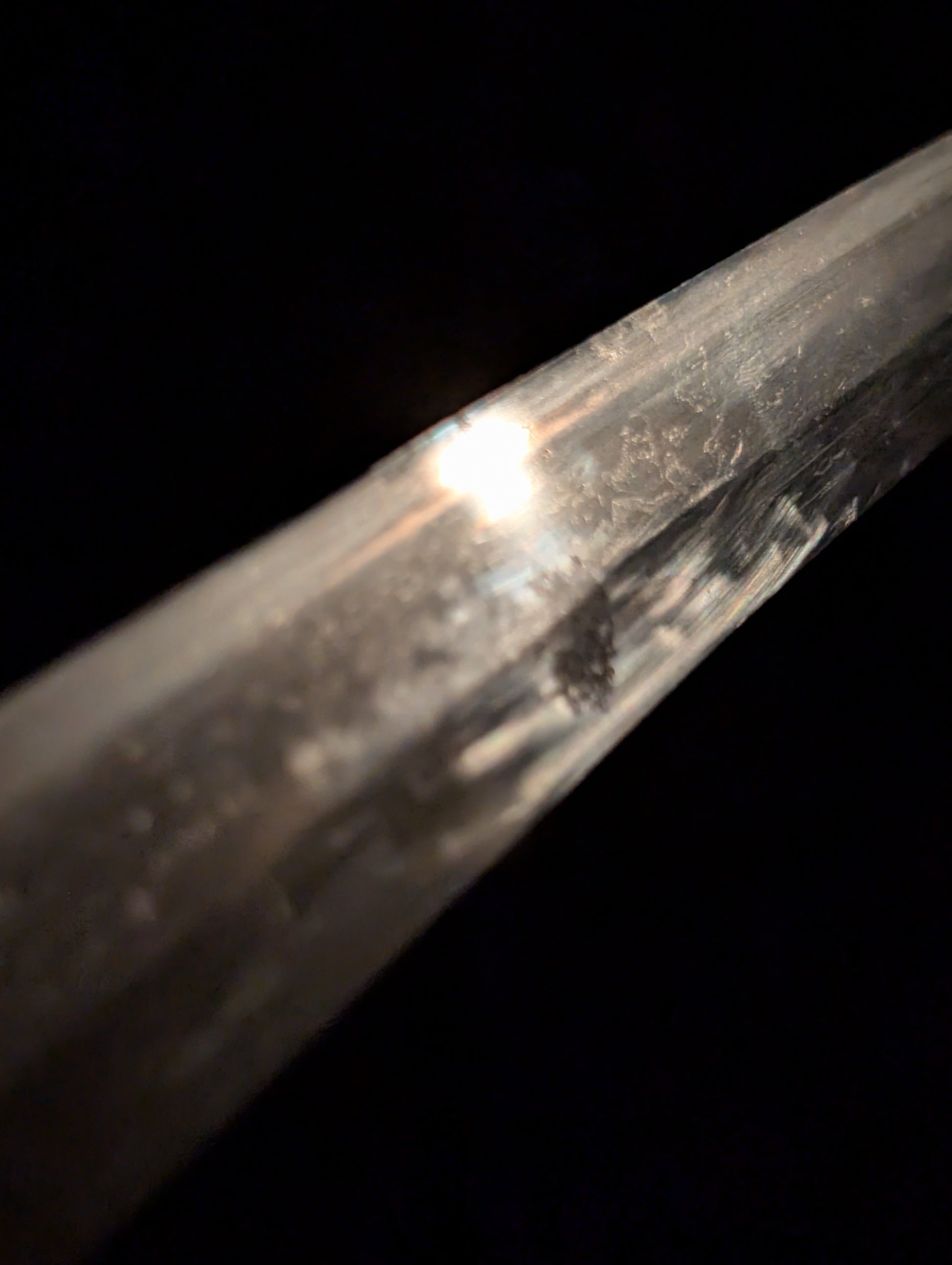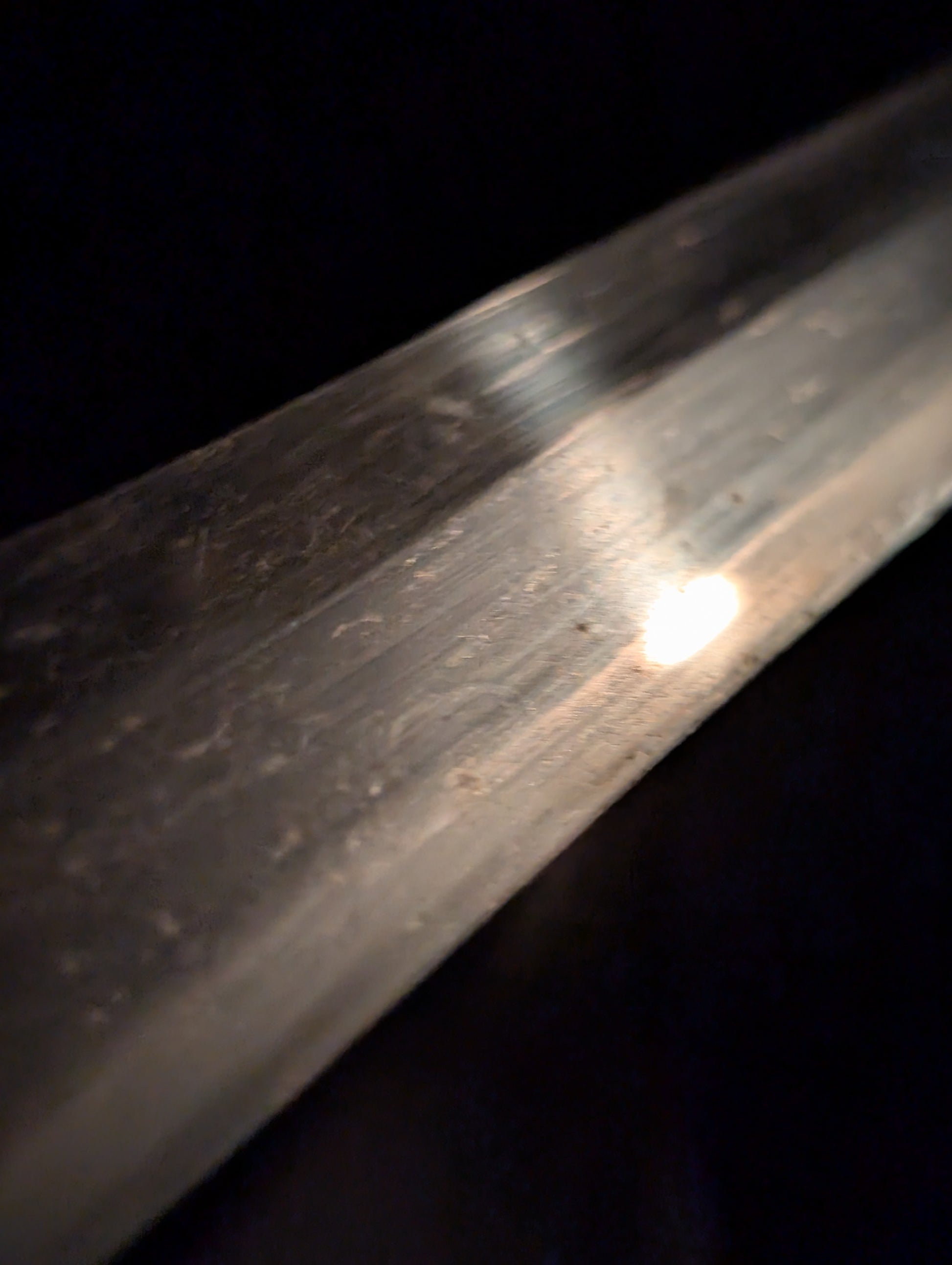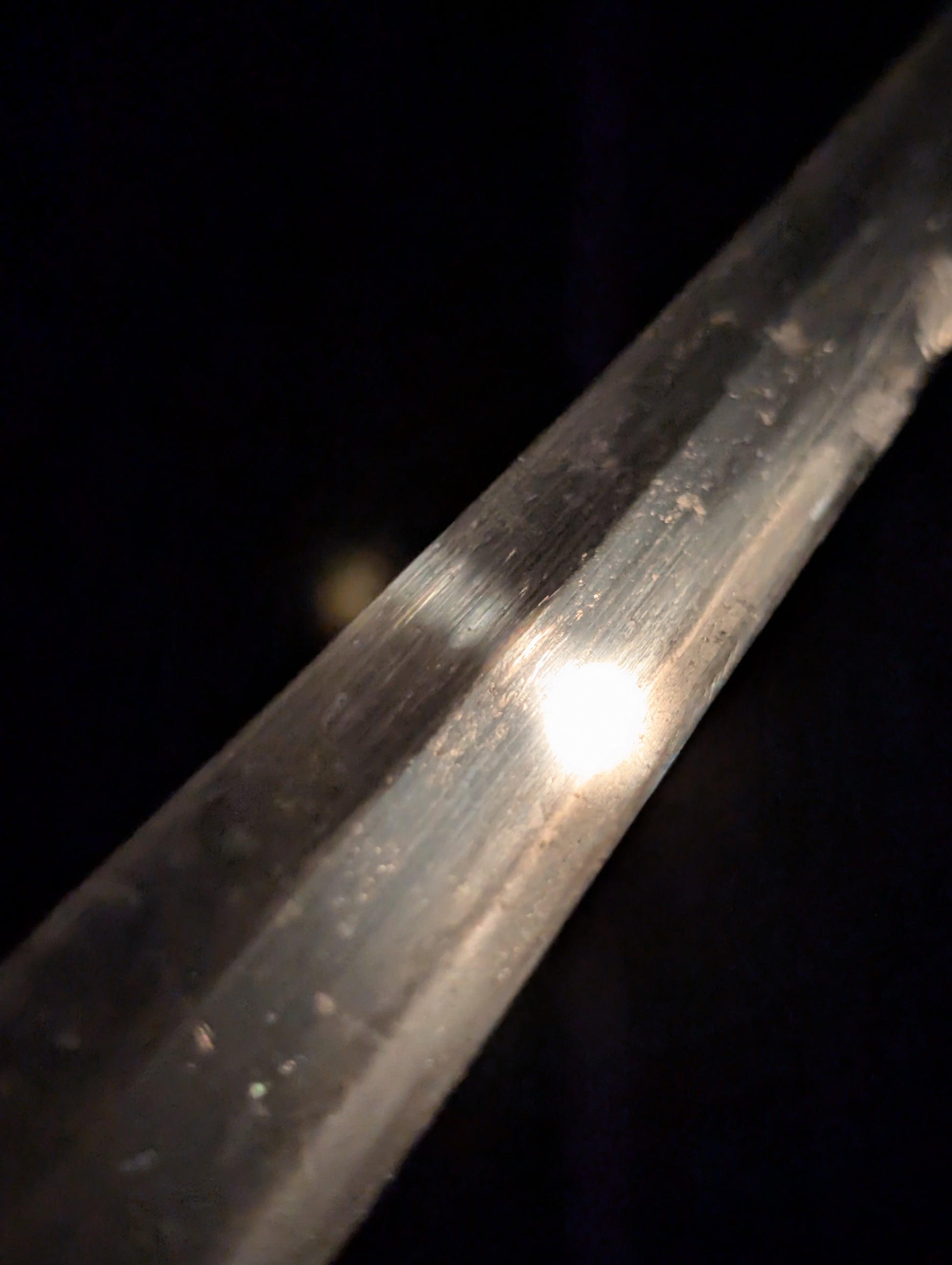 This katana is a thick, heavy blade. The polish is corroded in several places.