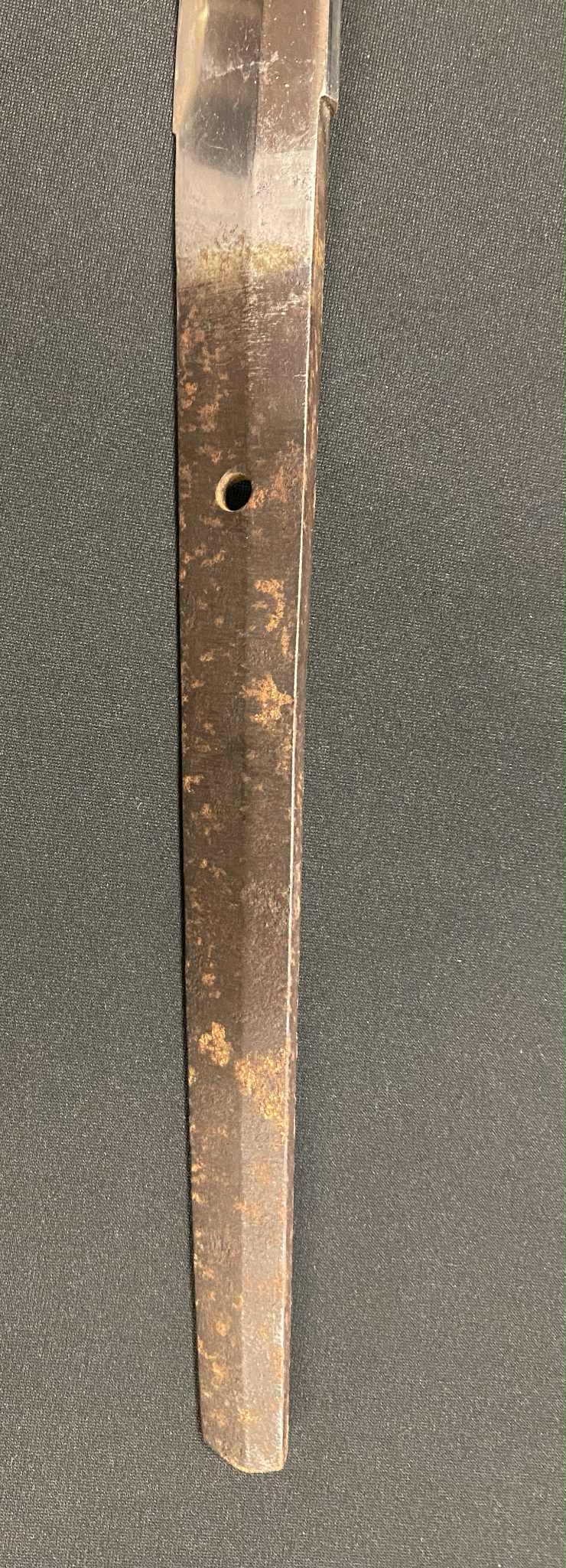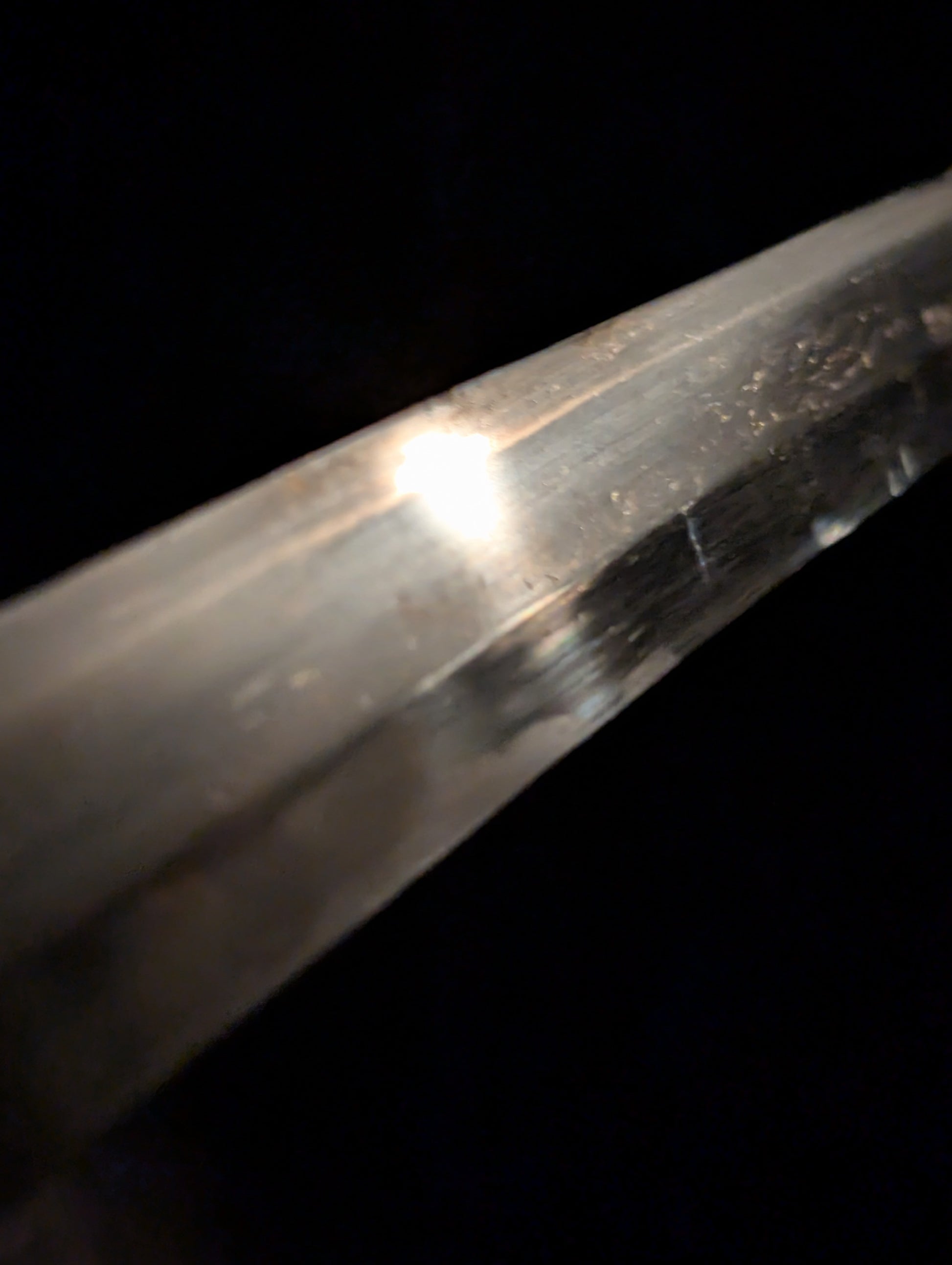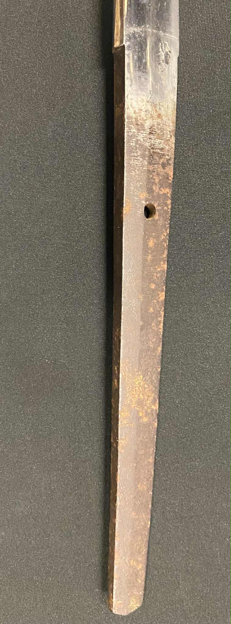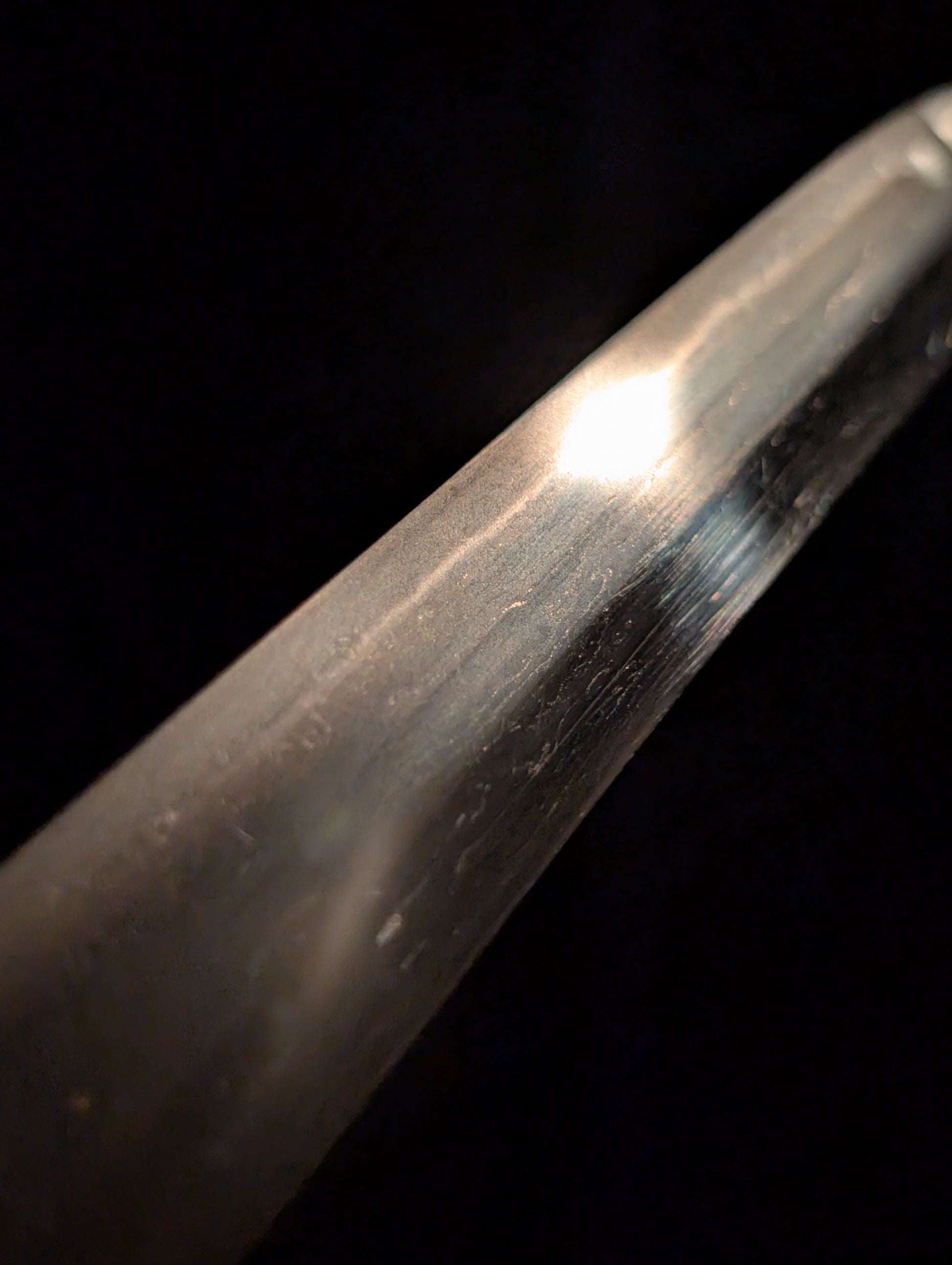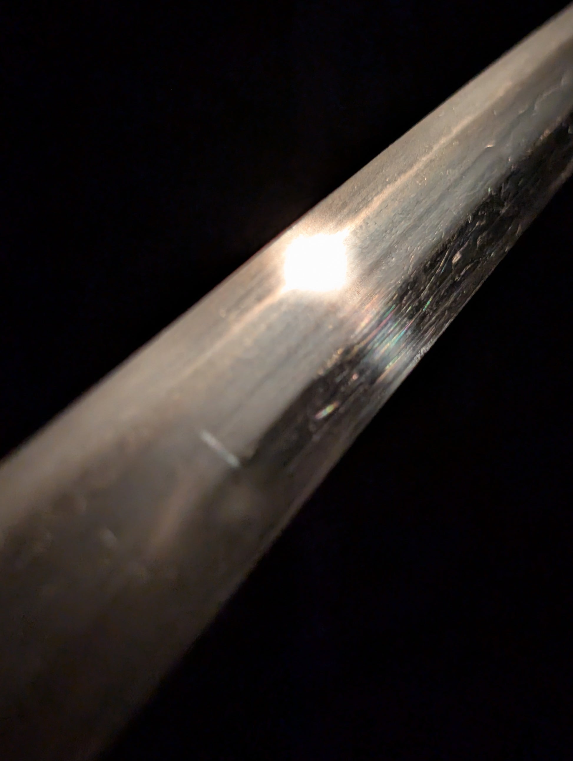 This katana is a thick, heavy blade. The polish is corroded in several places.