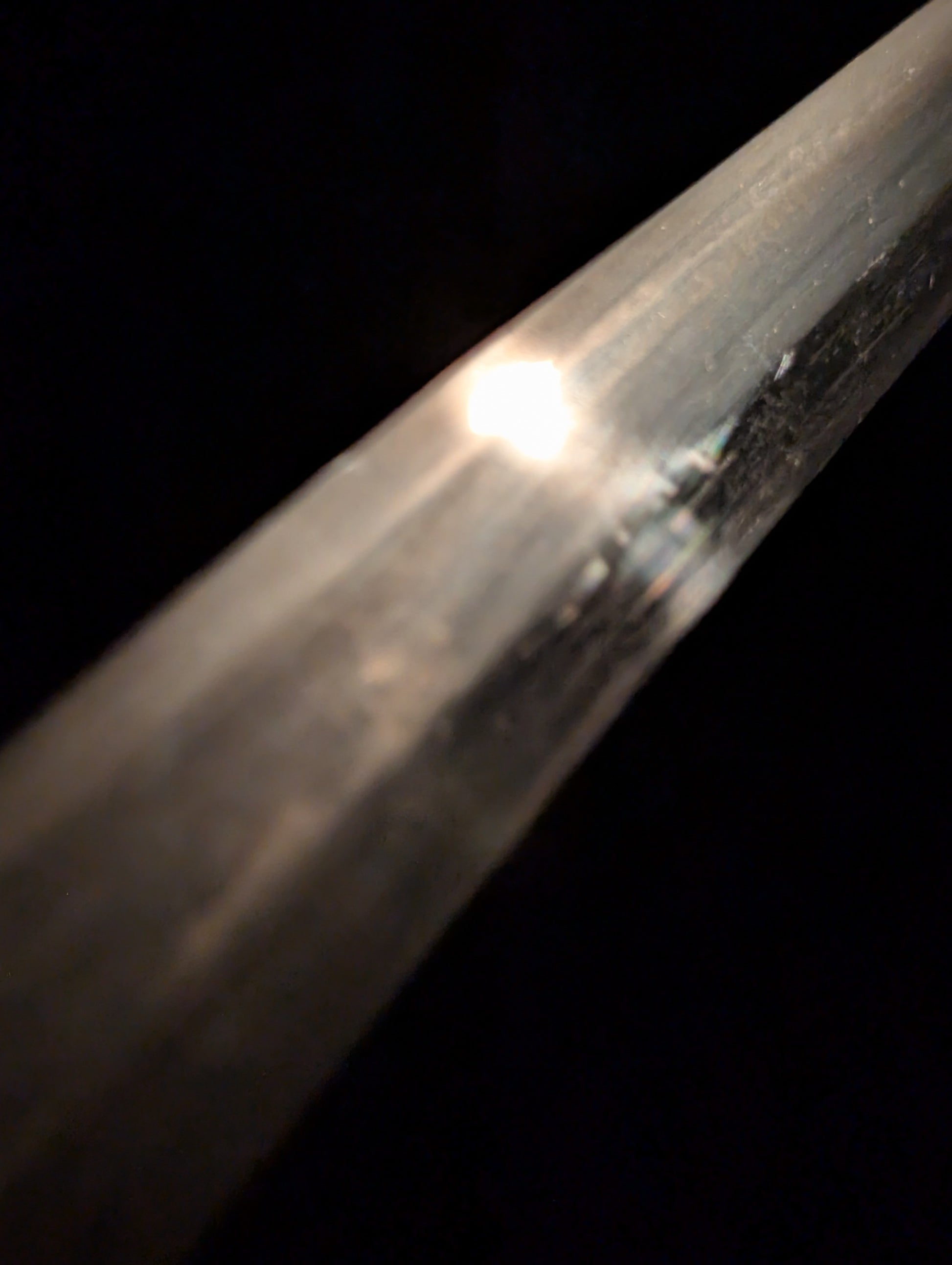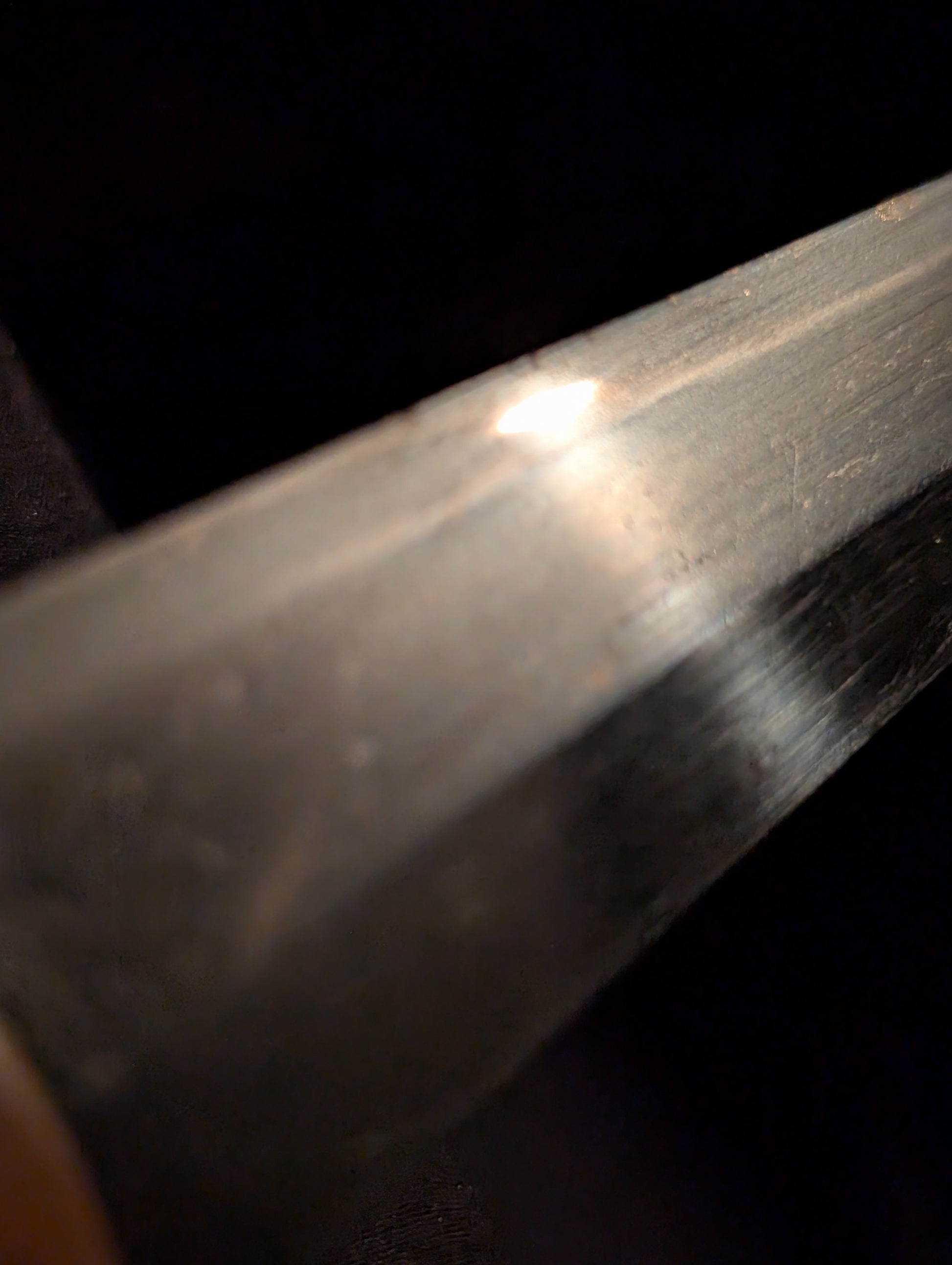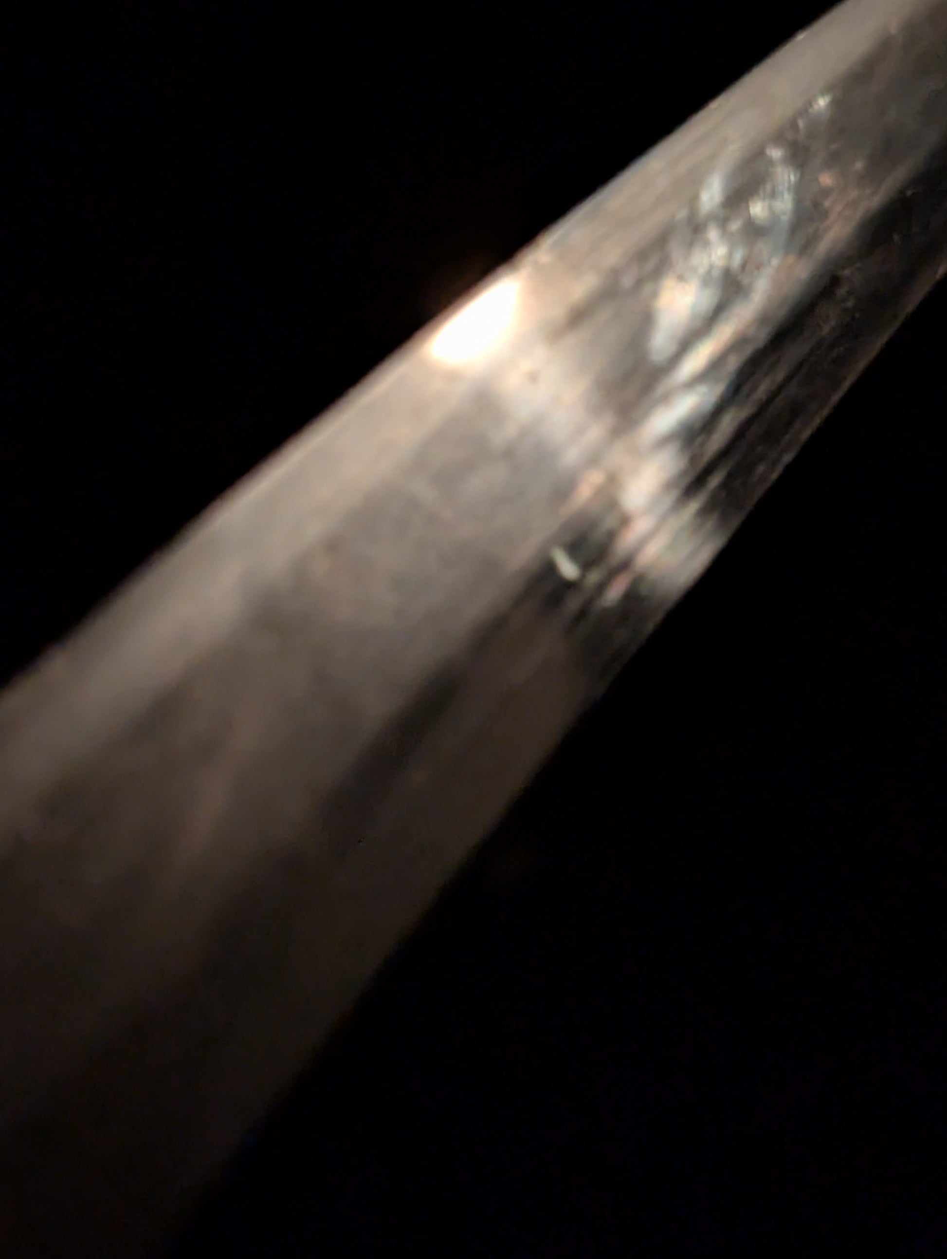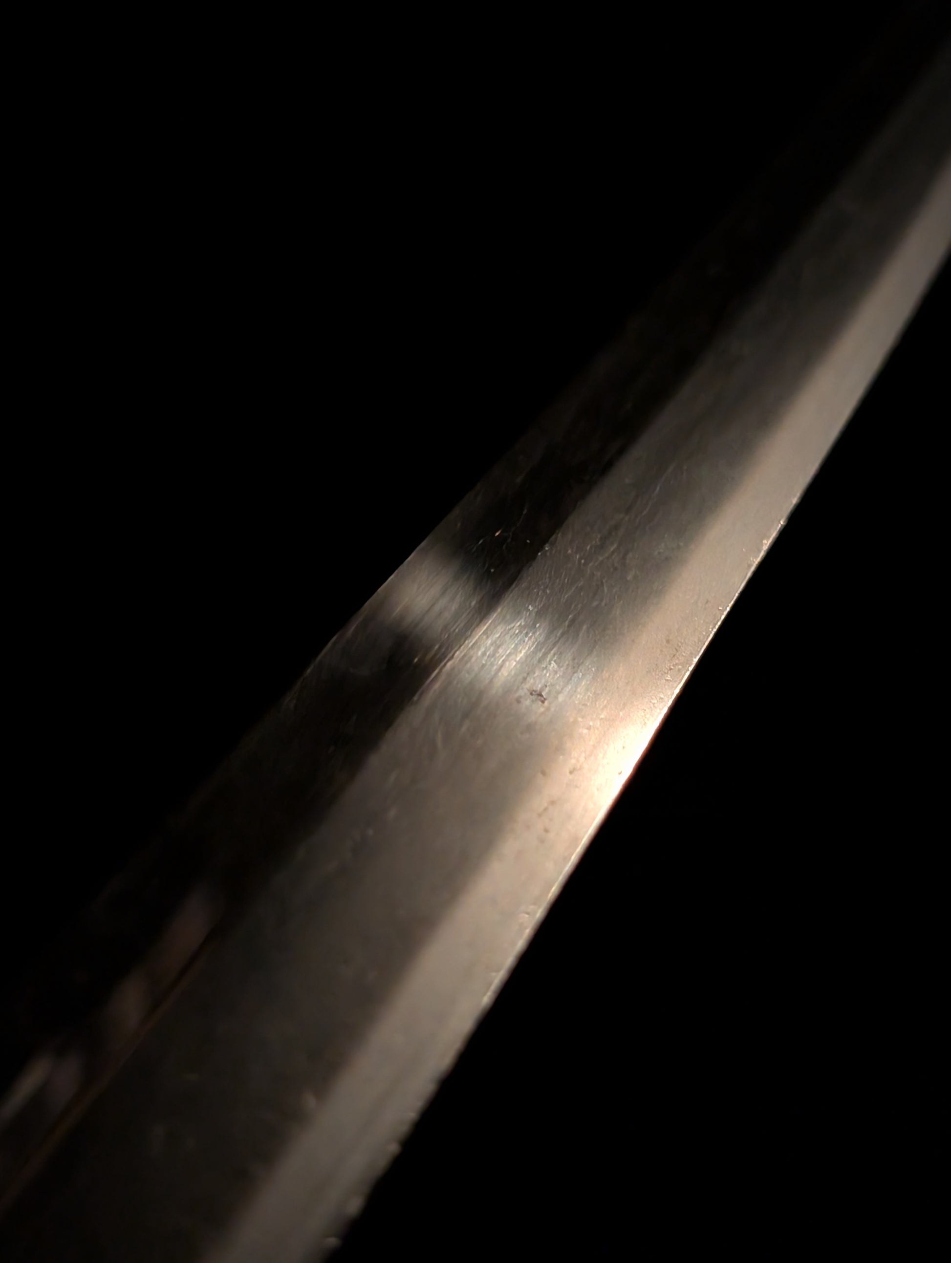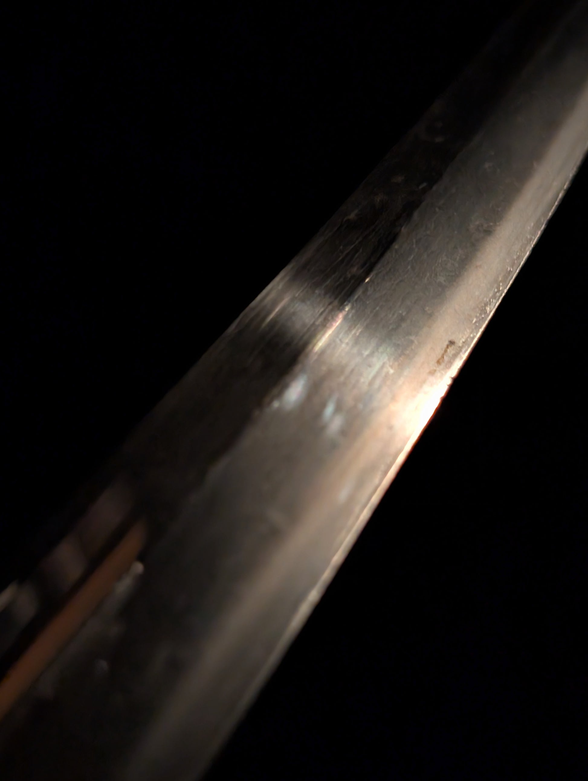 This katana is a thick, heavy blade. The polish is corroded in several places.