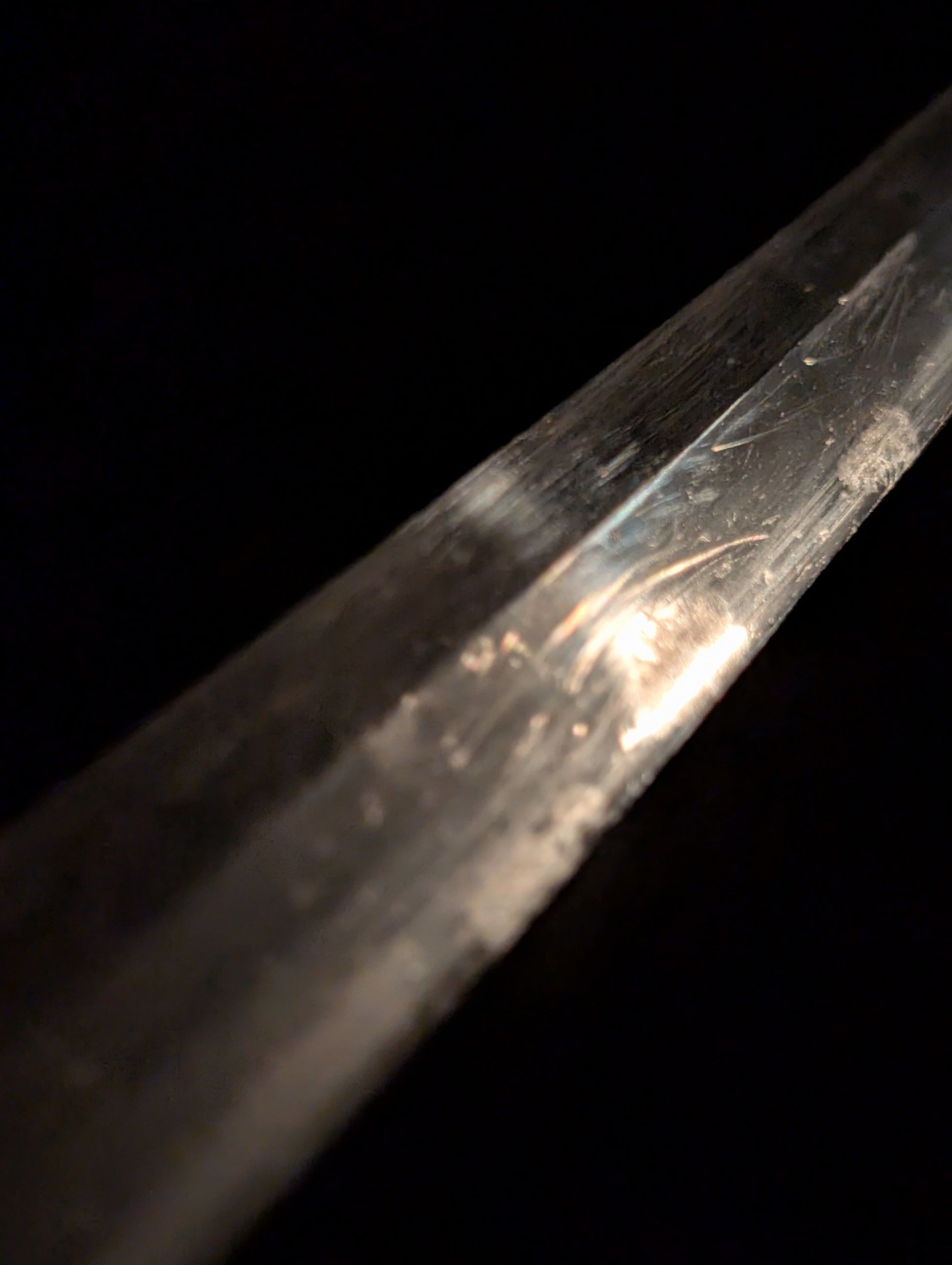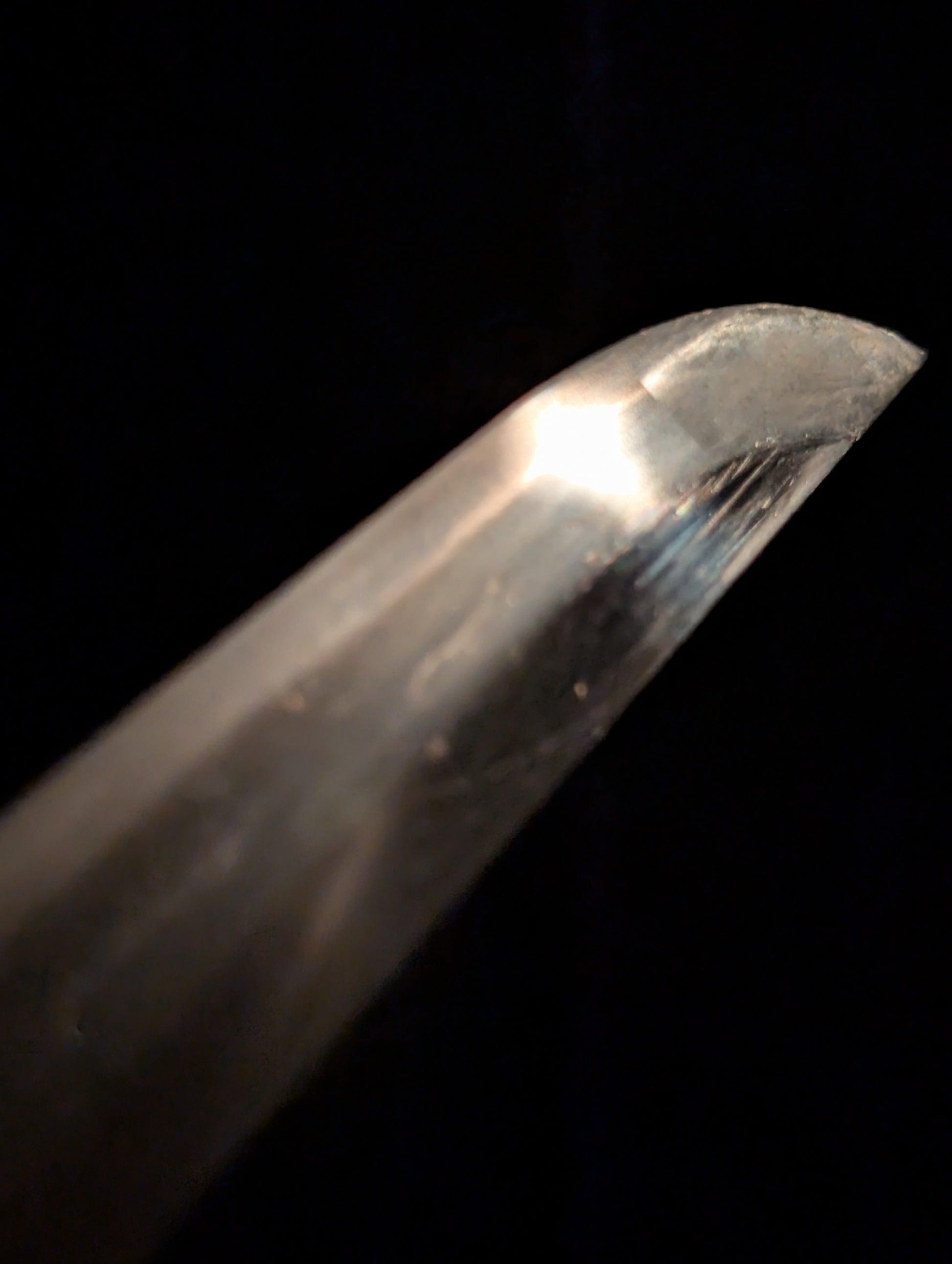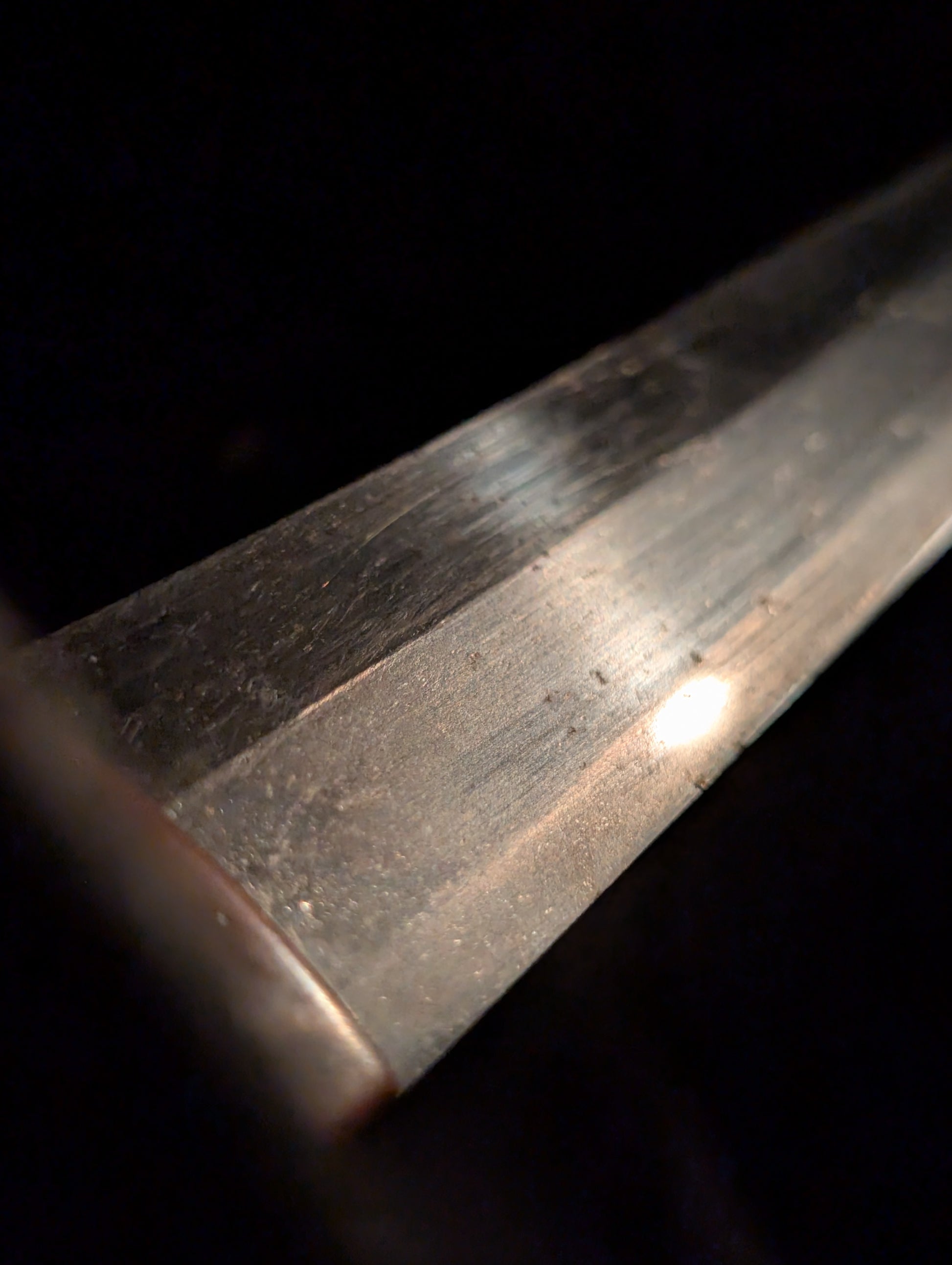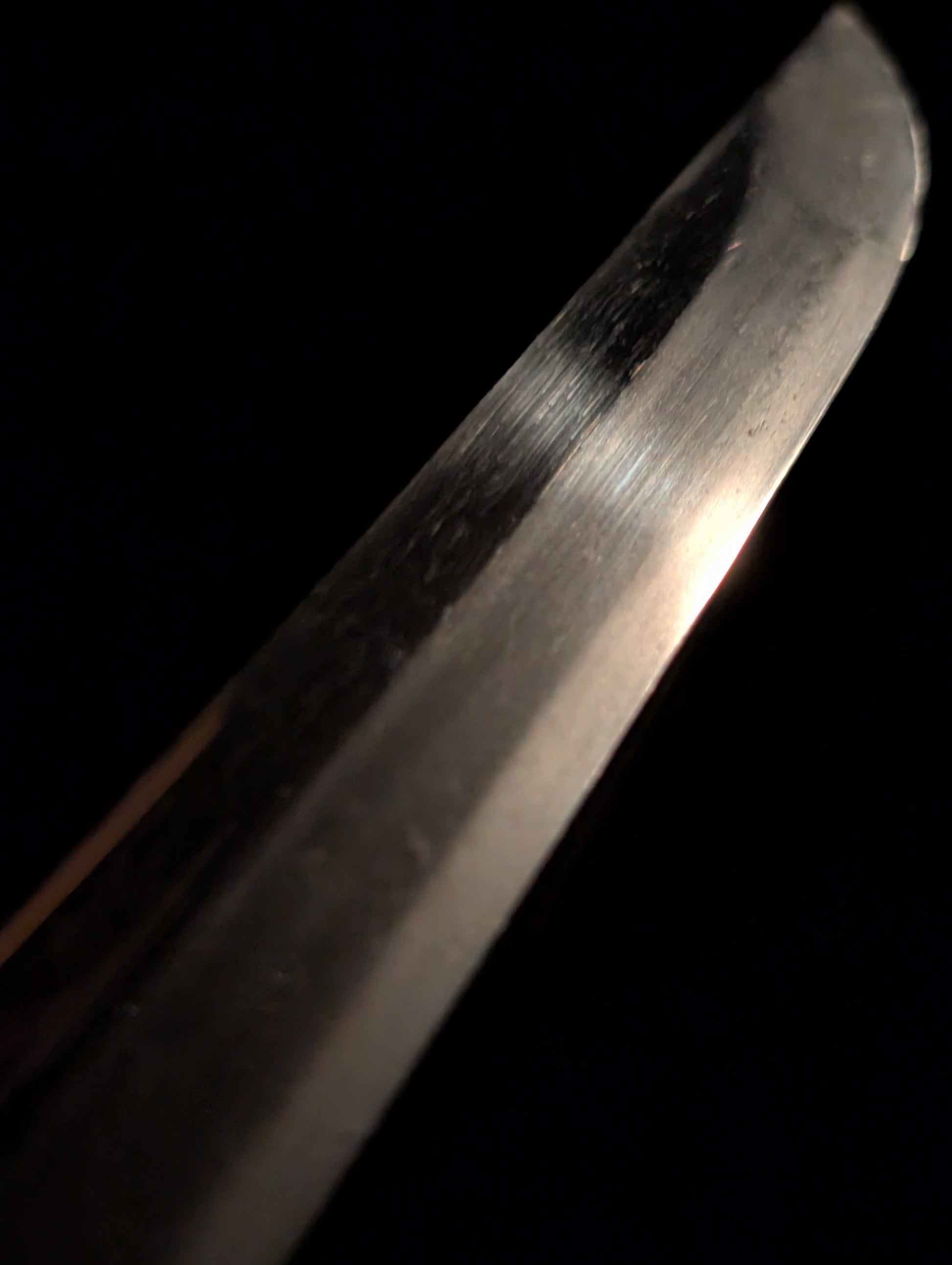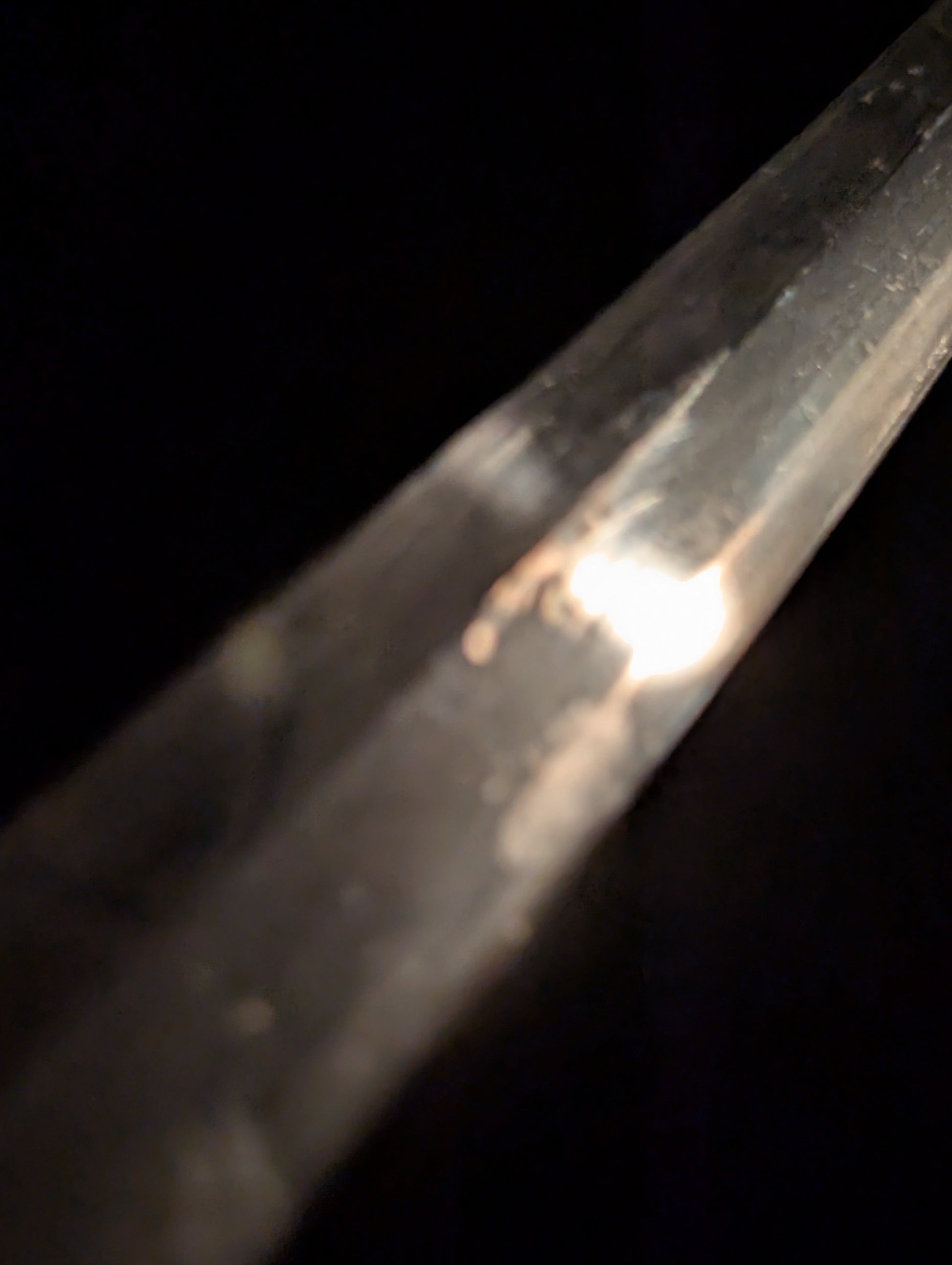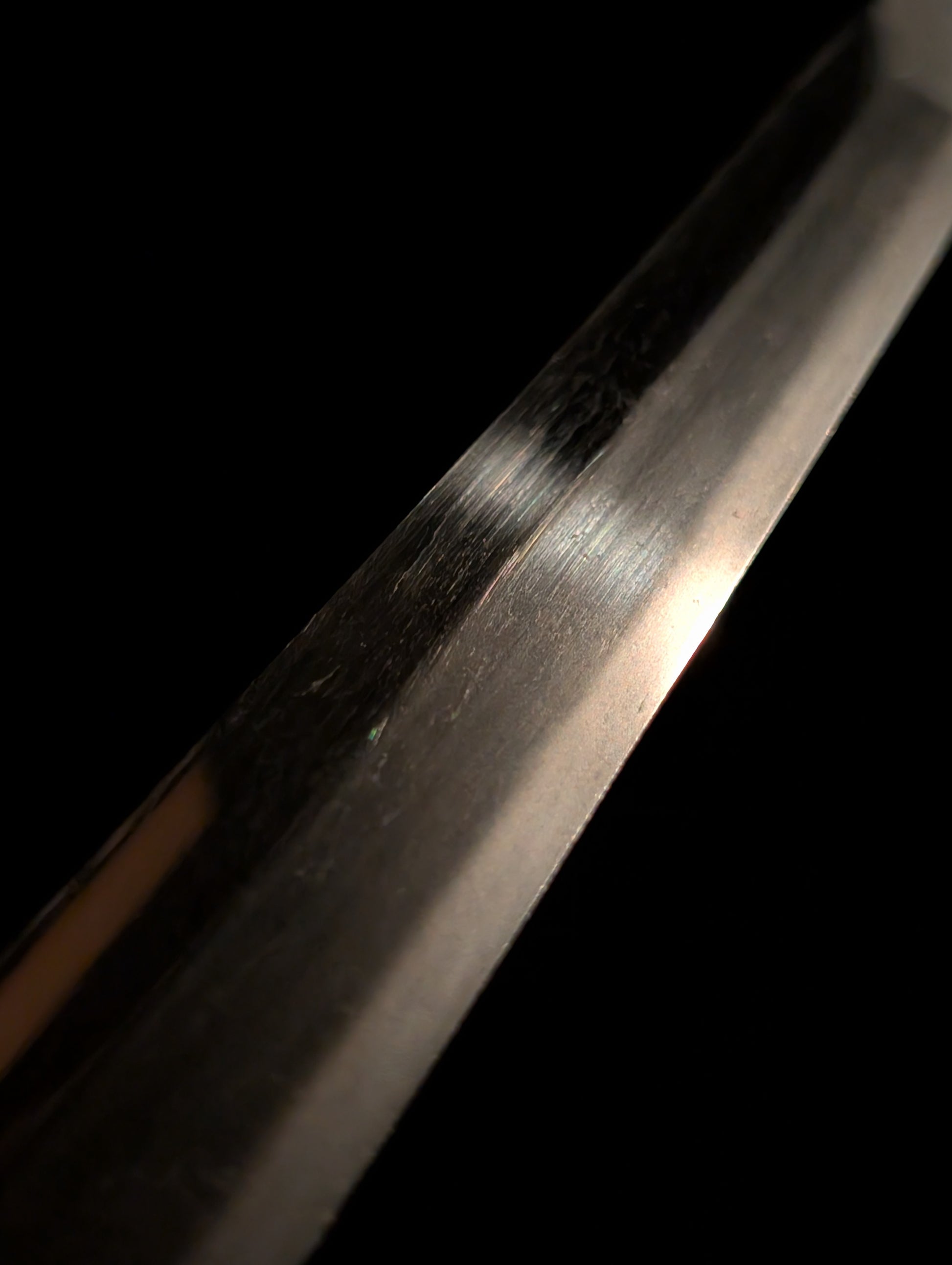 This katana is a thick, heavy blade. The polish is corroded in several places.