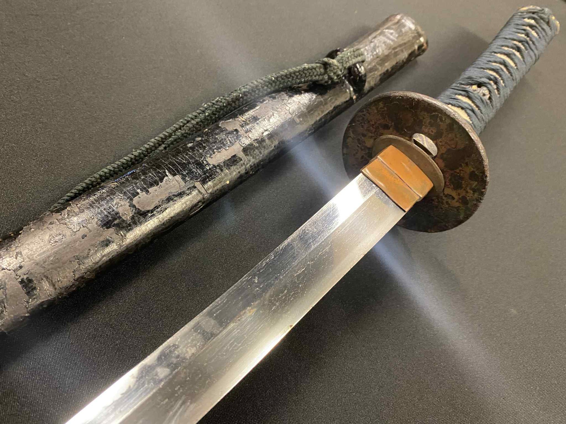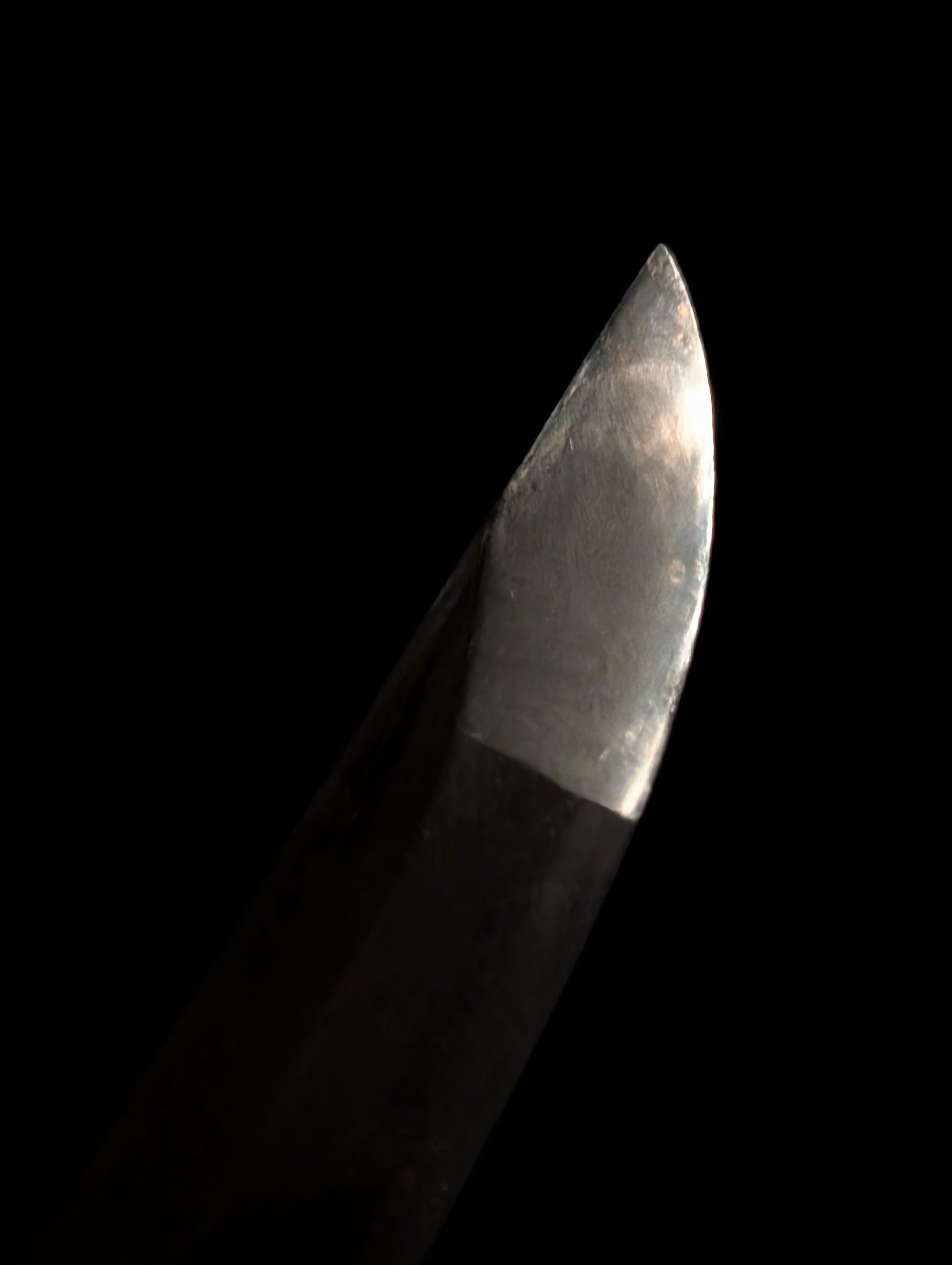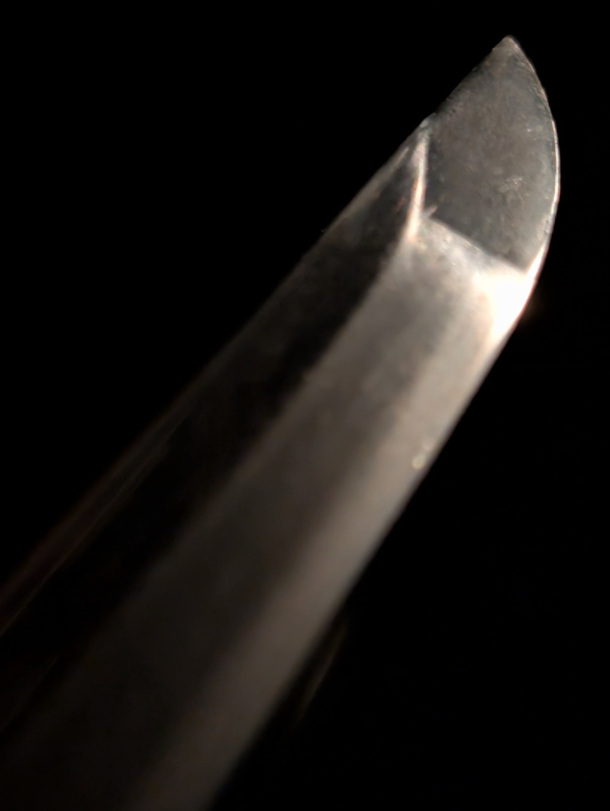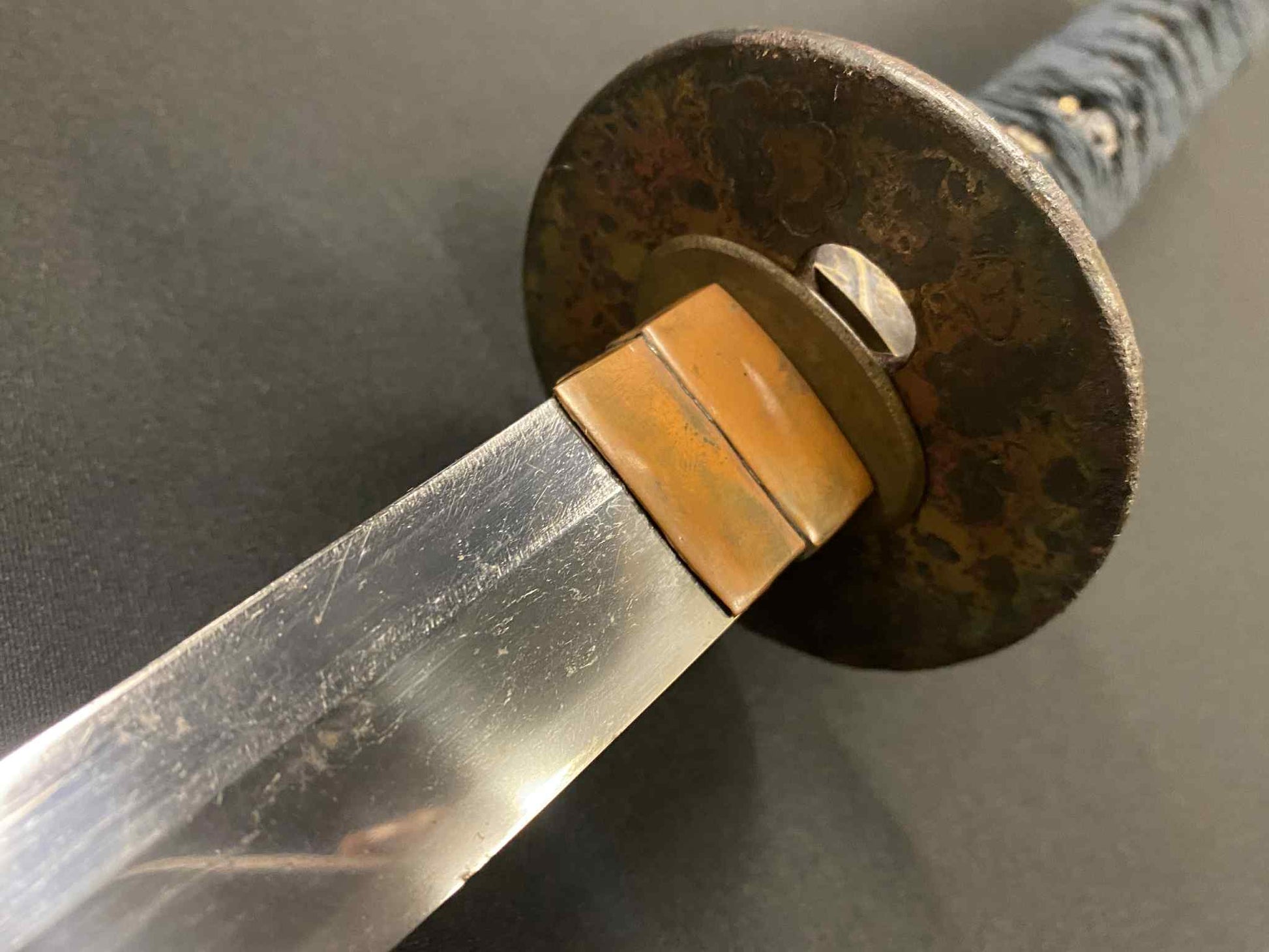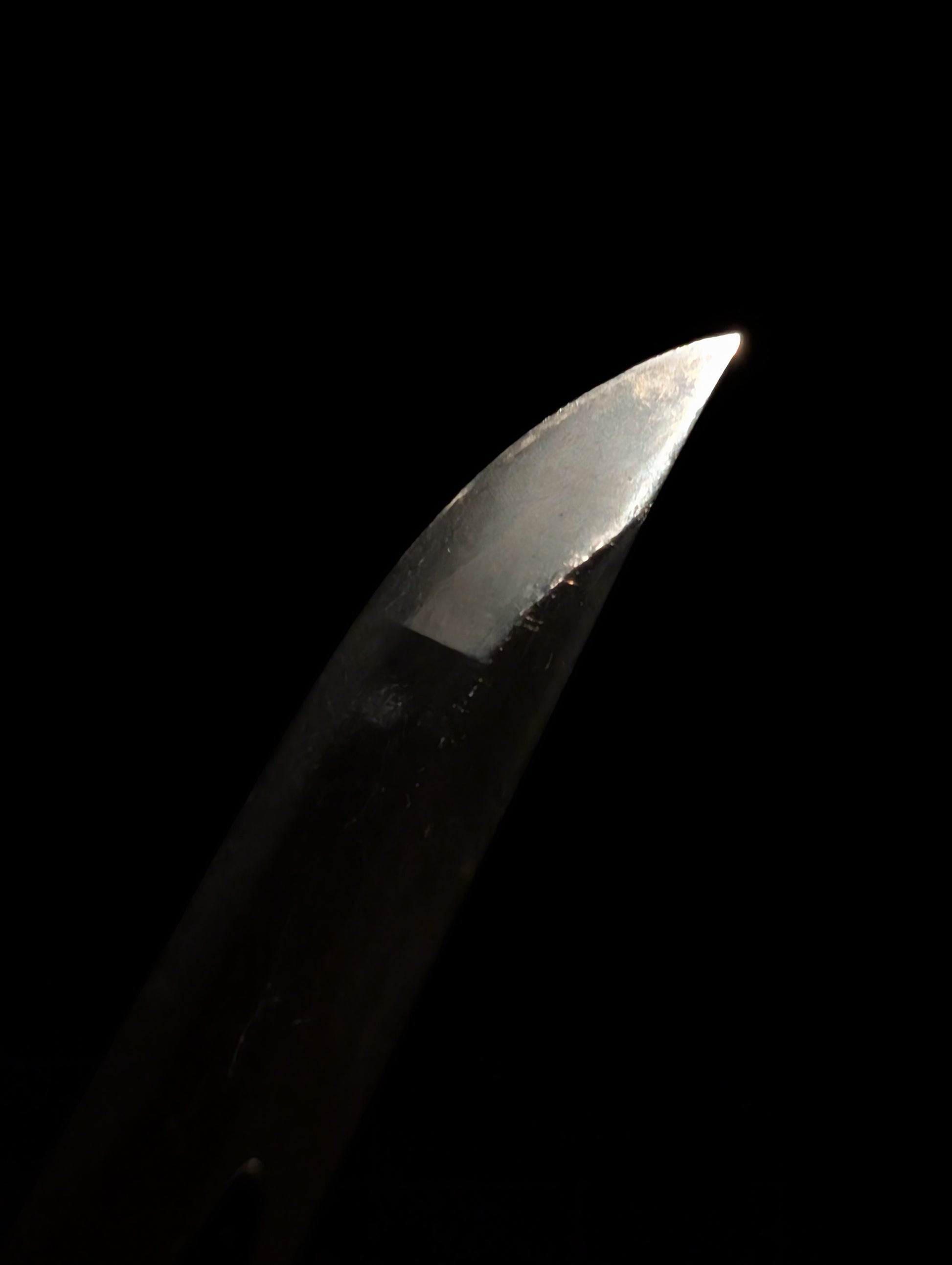 This katana is a thick, heavy blade. The polish is corroded in several places.