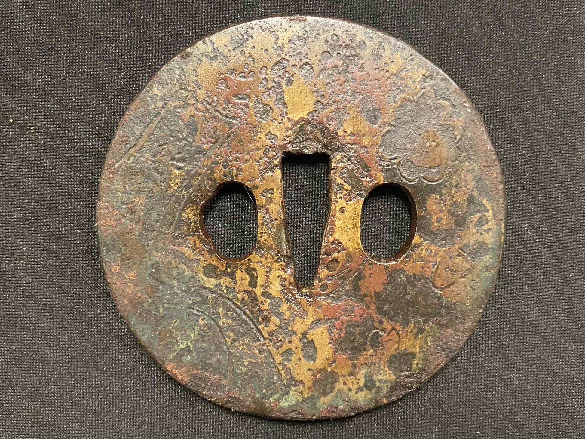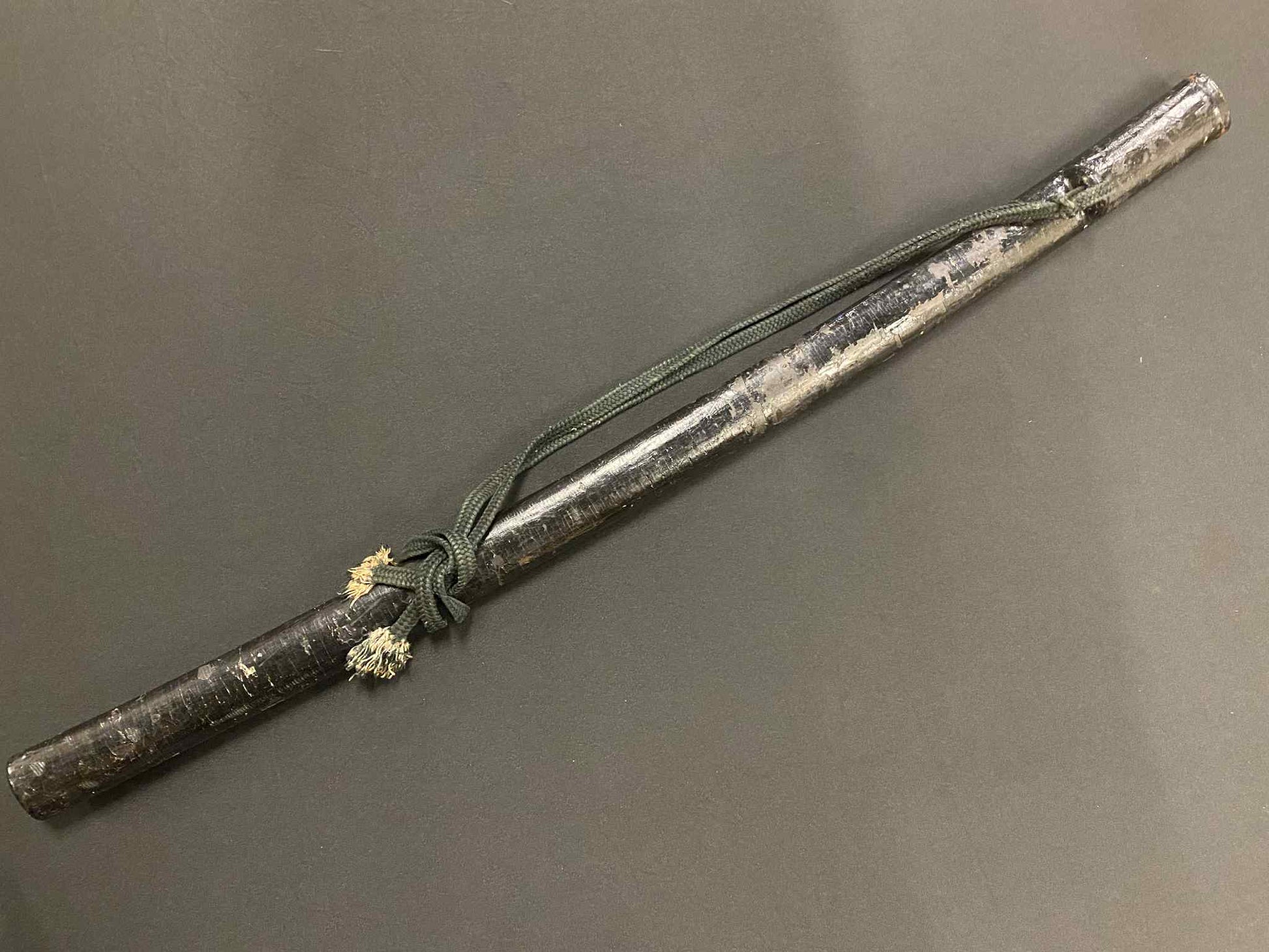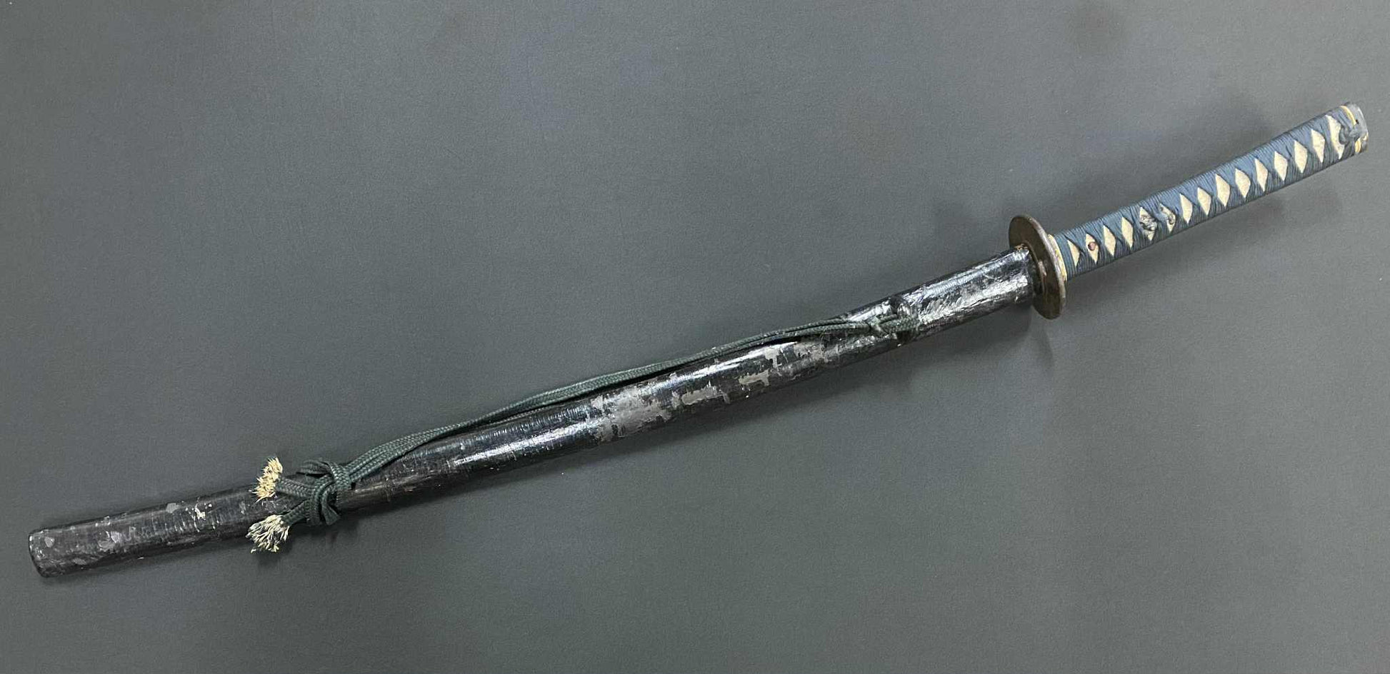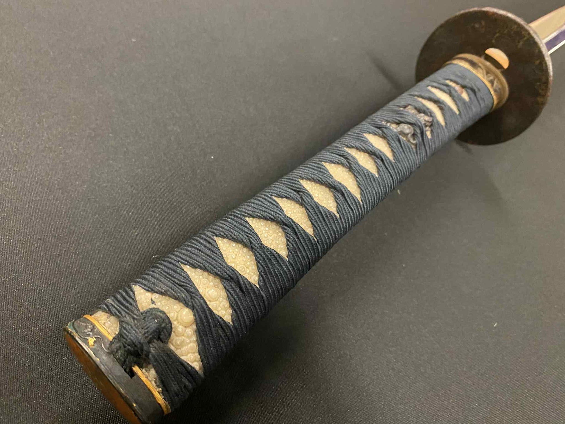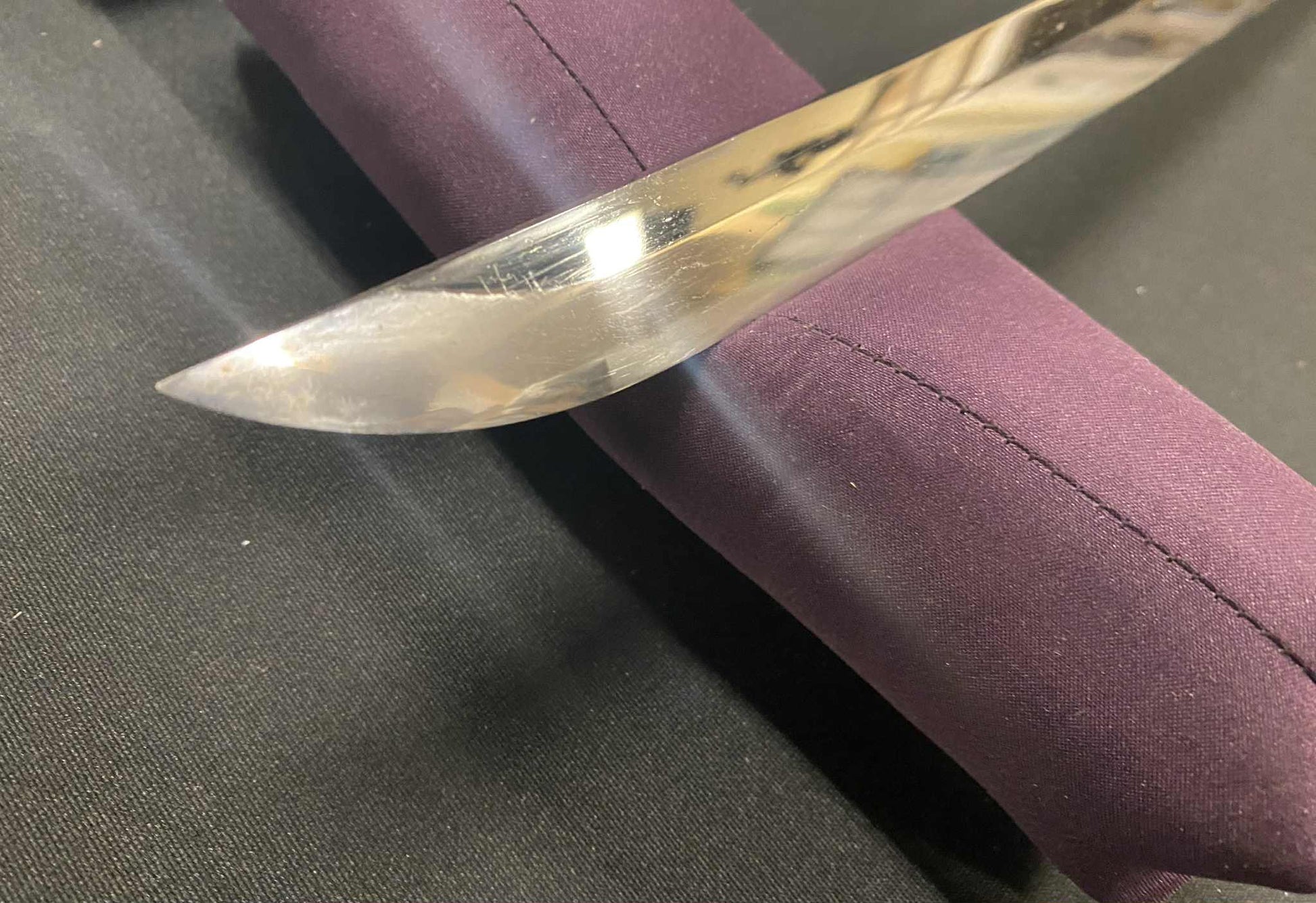 This katana is a thick, heavy blade. The polish is corroded in several places.