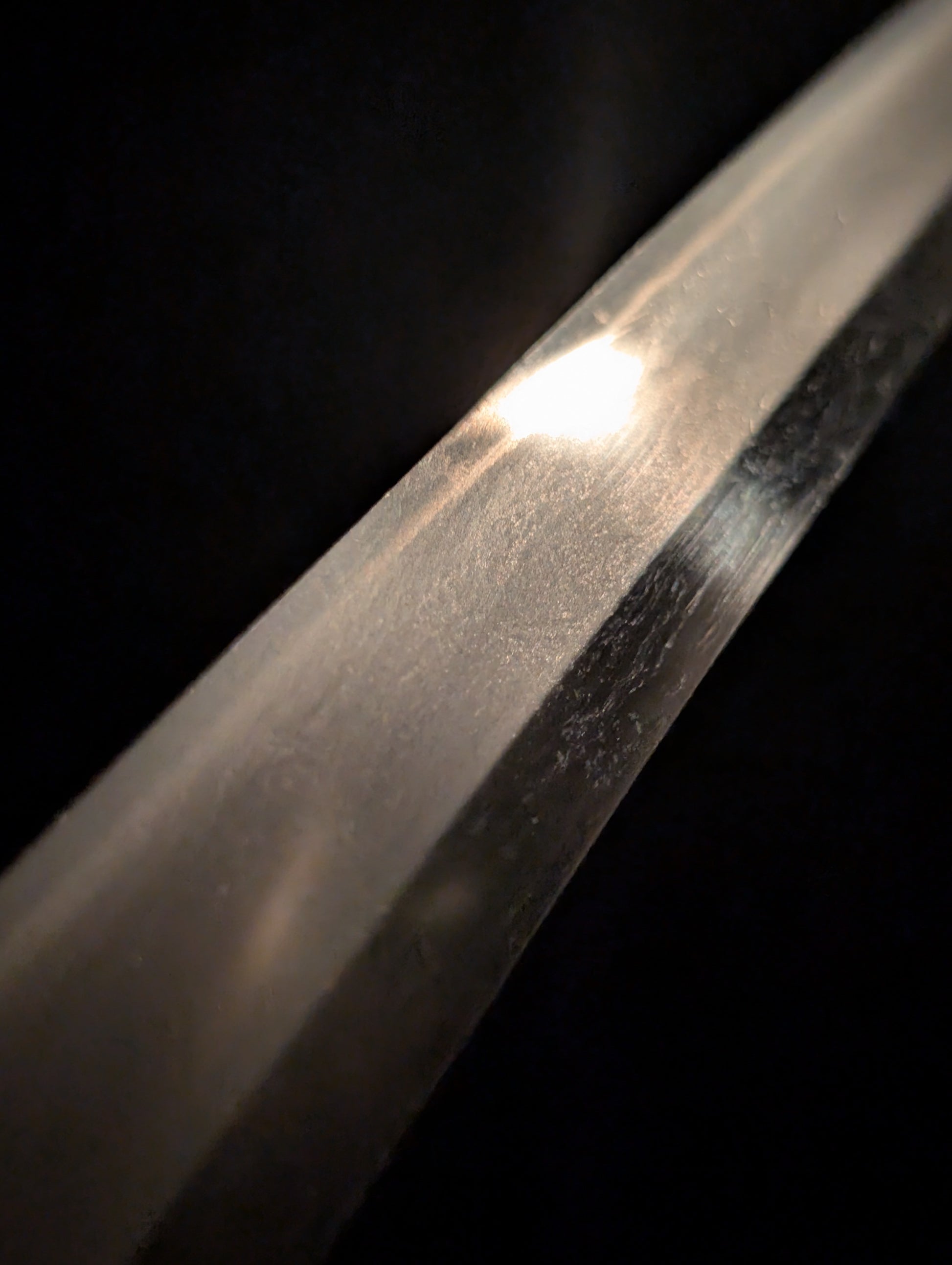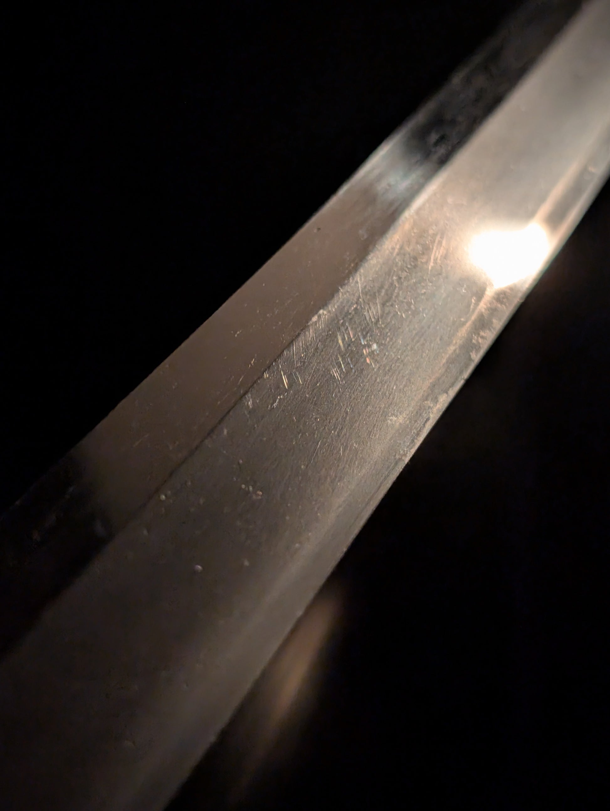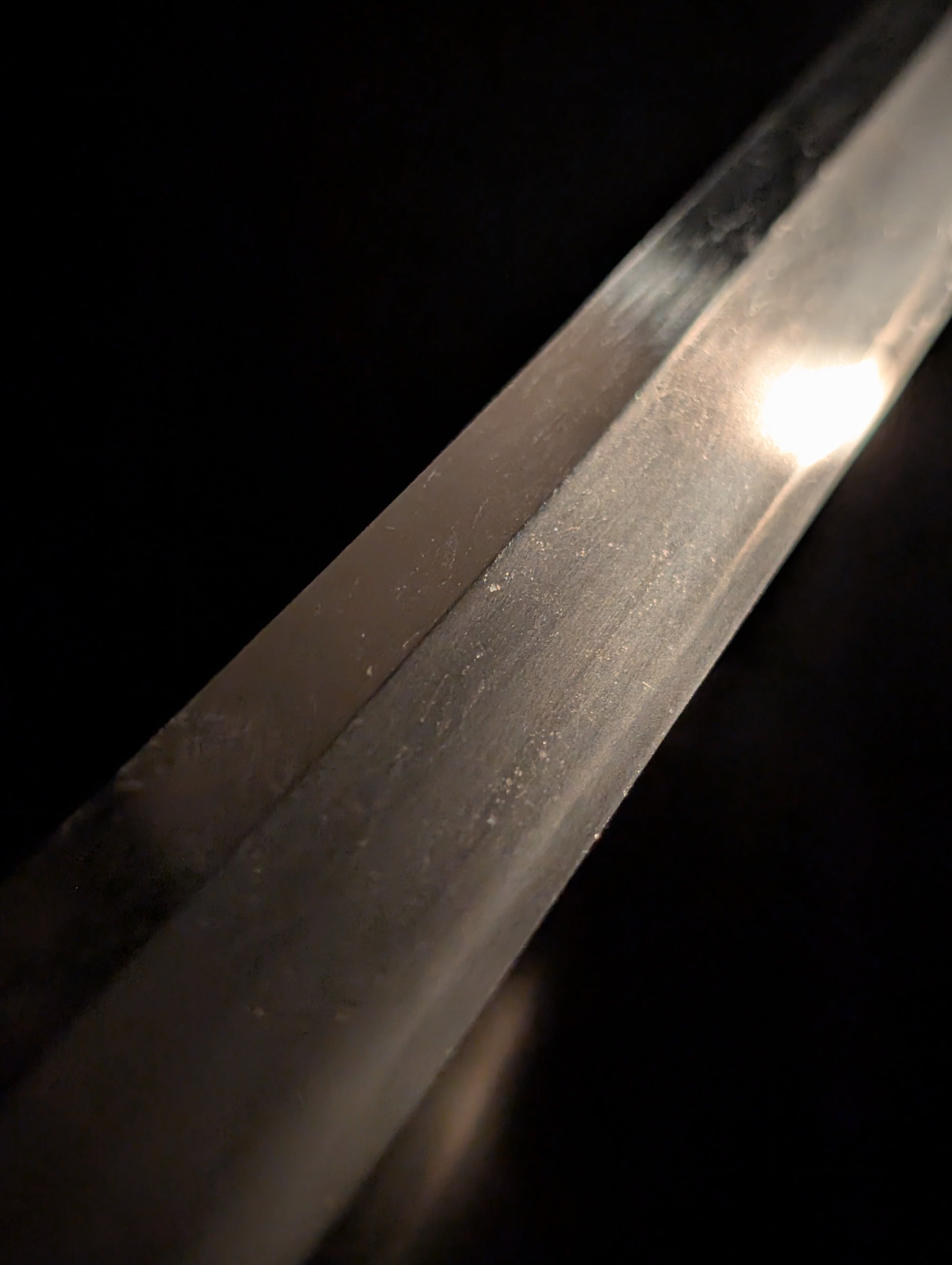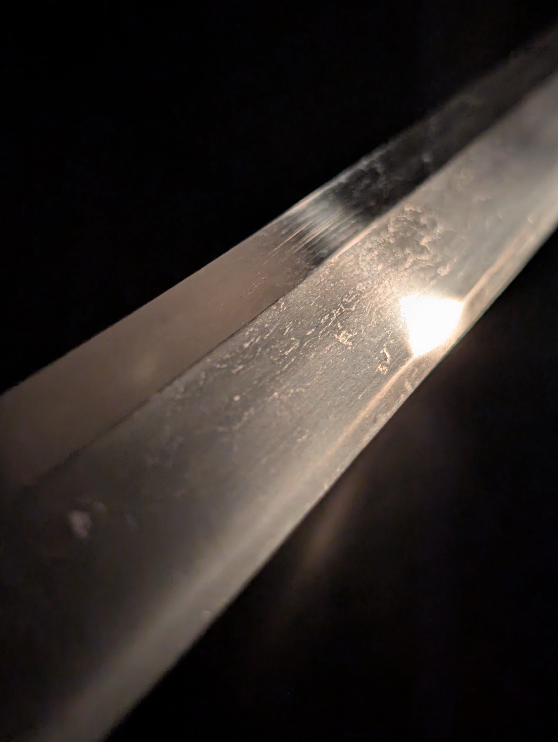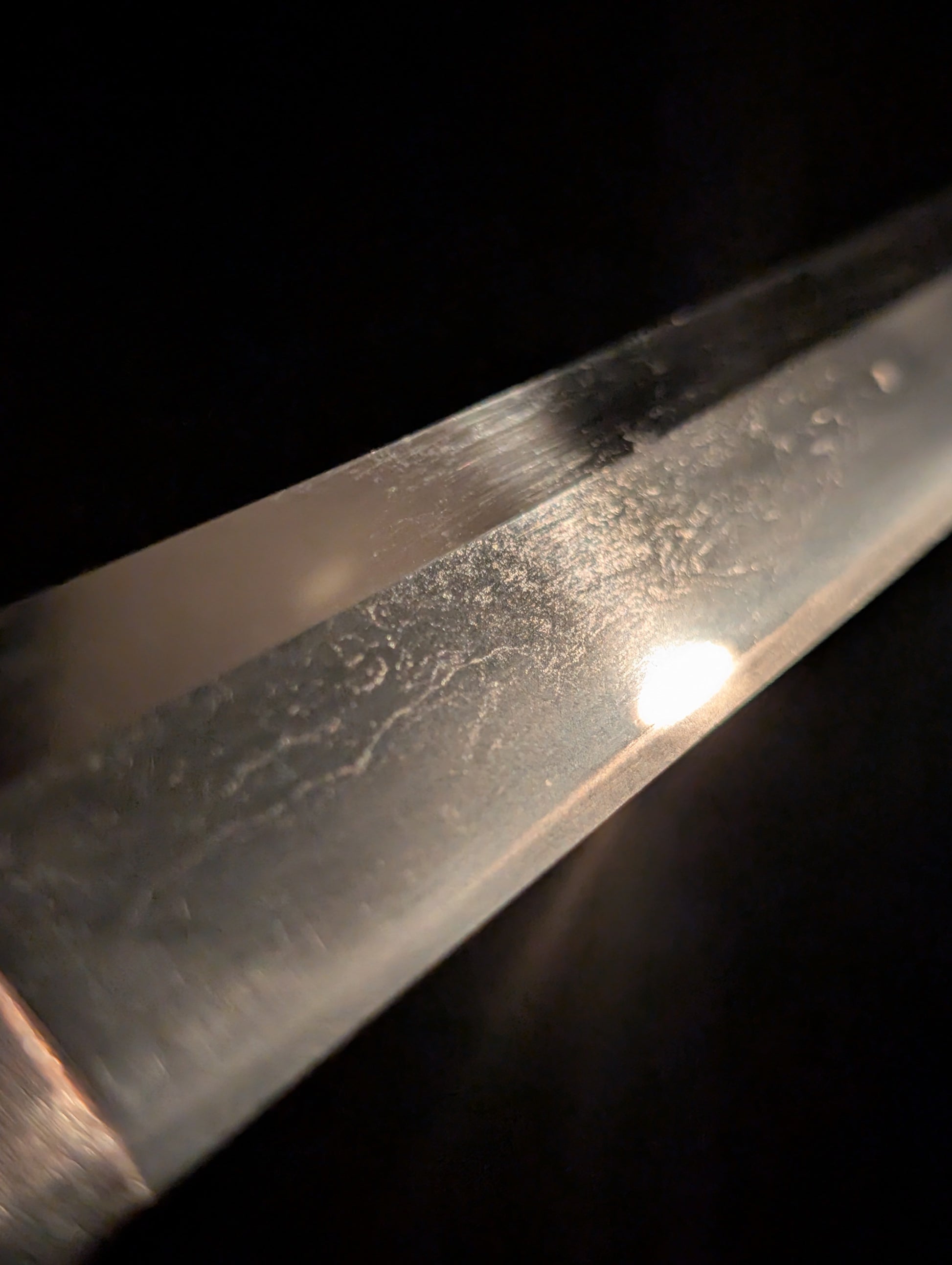 With five mekugi holes in the nakago, this late Muromachi katana has worn man different fittings ove its five centuries.