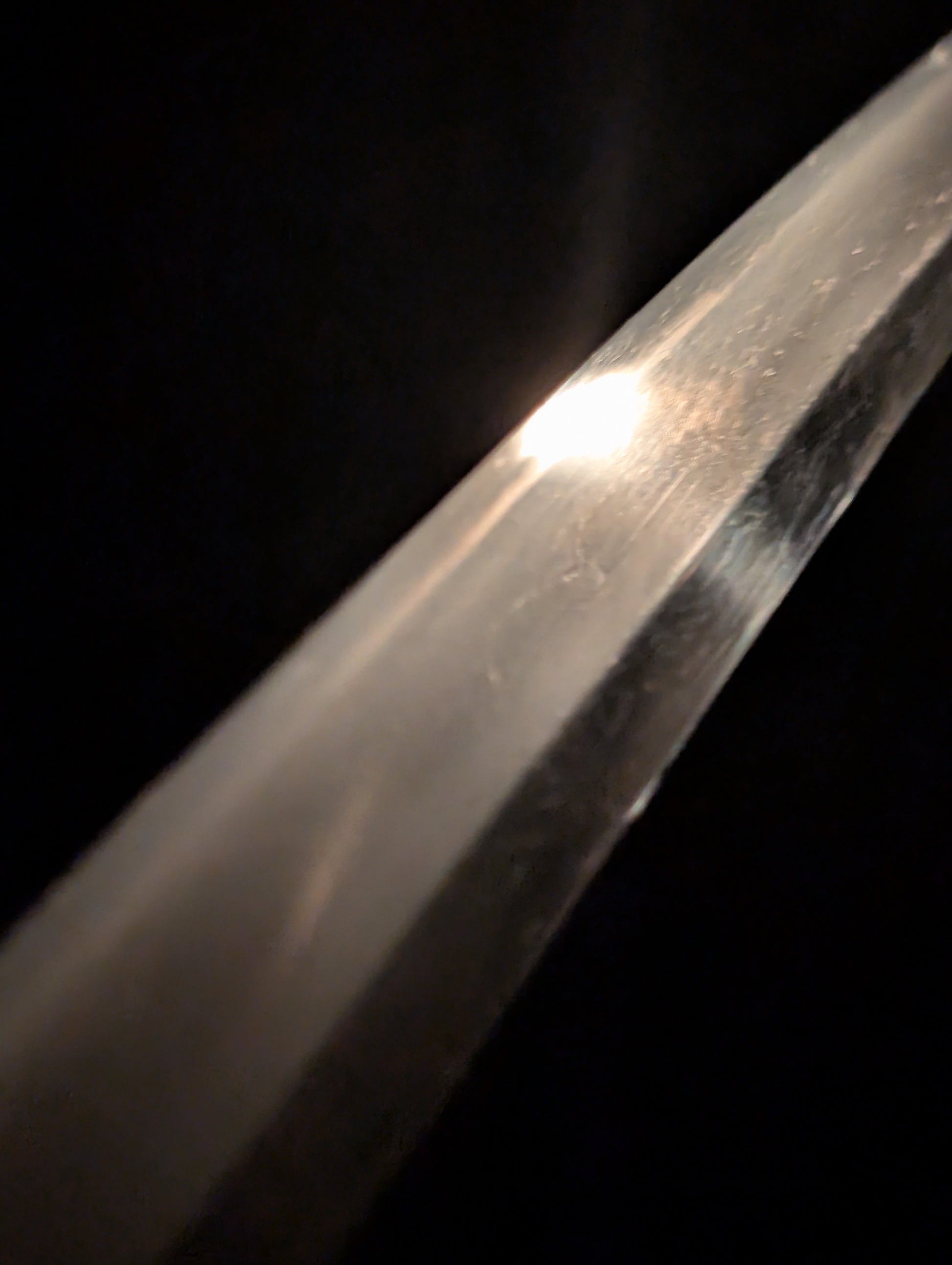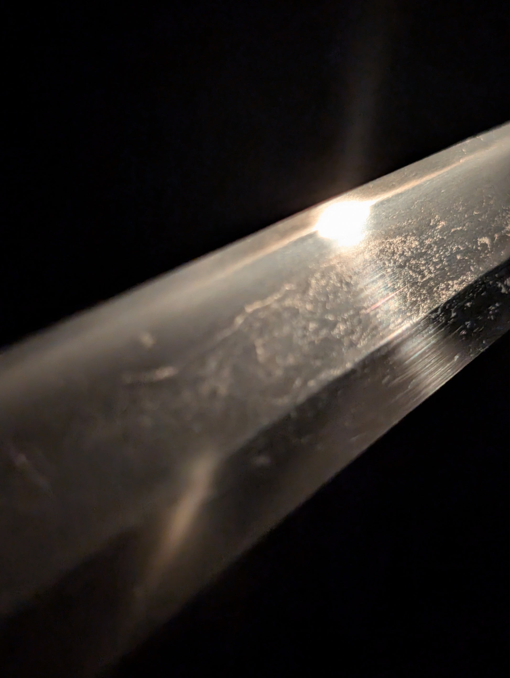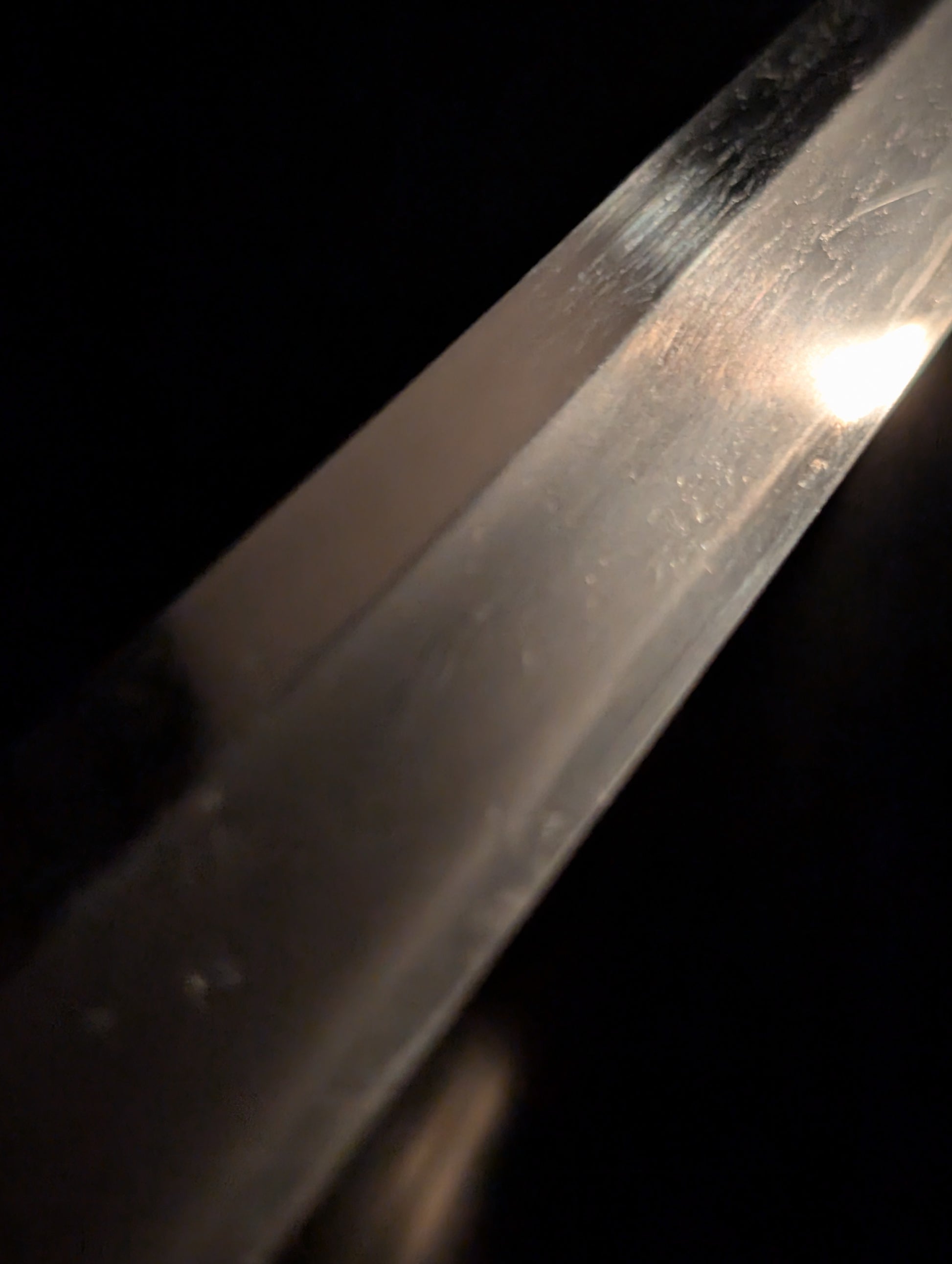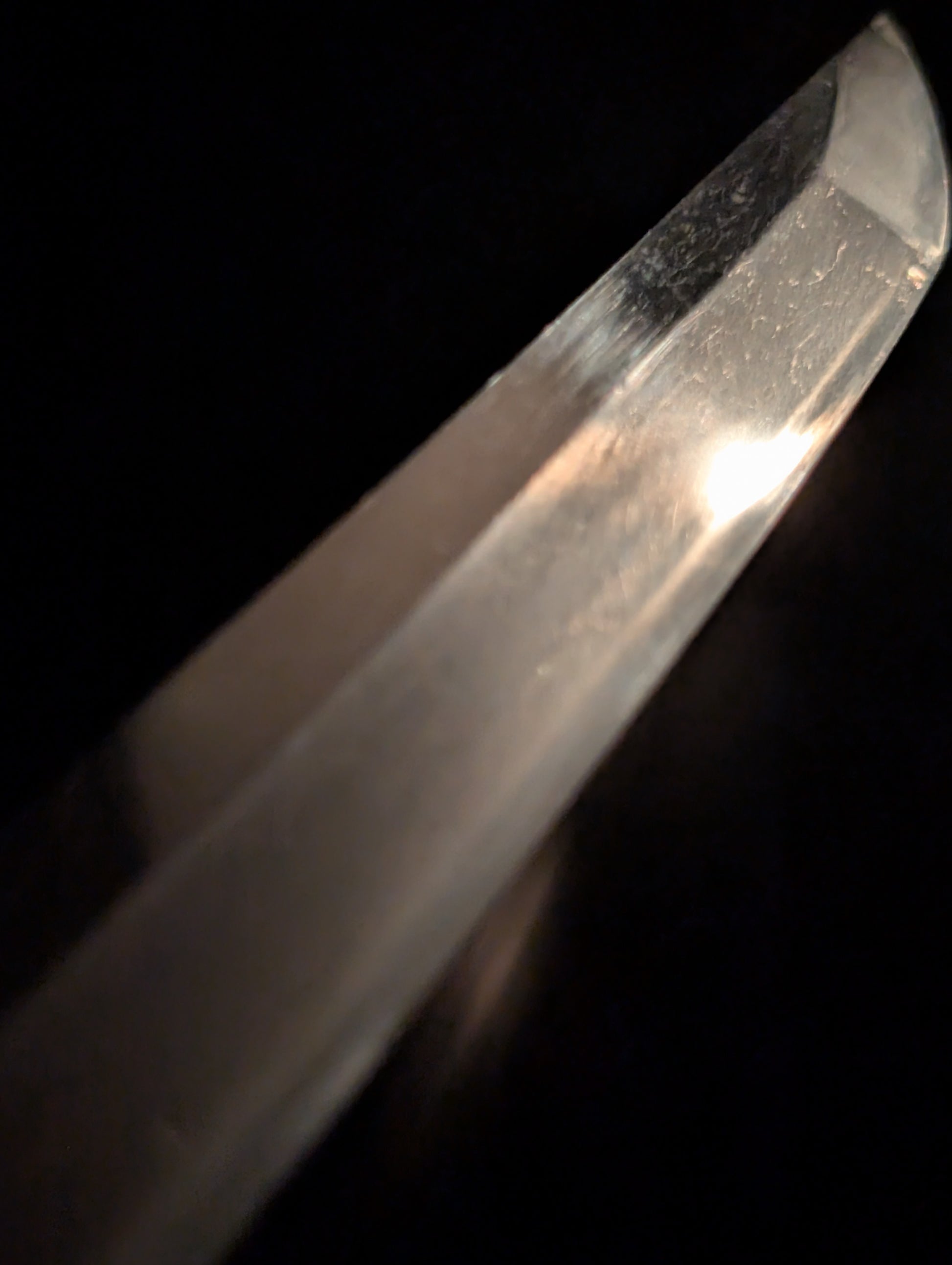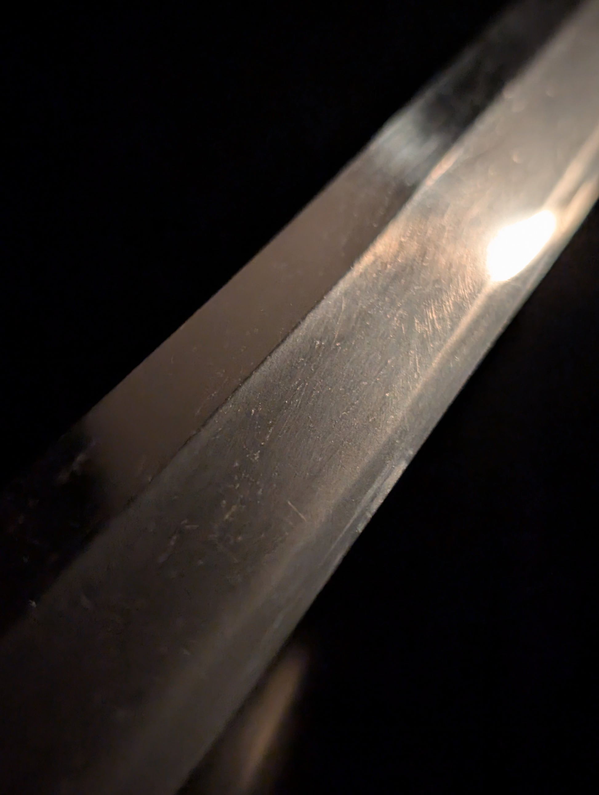 With five mekugi holes in the nakago, this late Muromachi katana has worn man different fittings ove its five centuries.