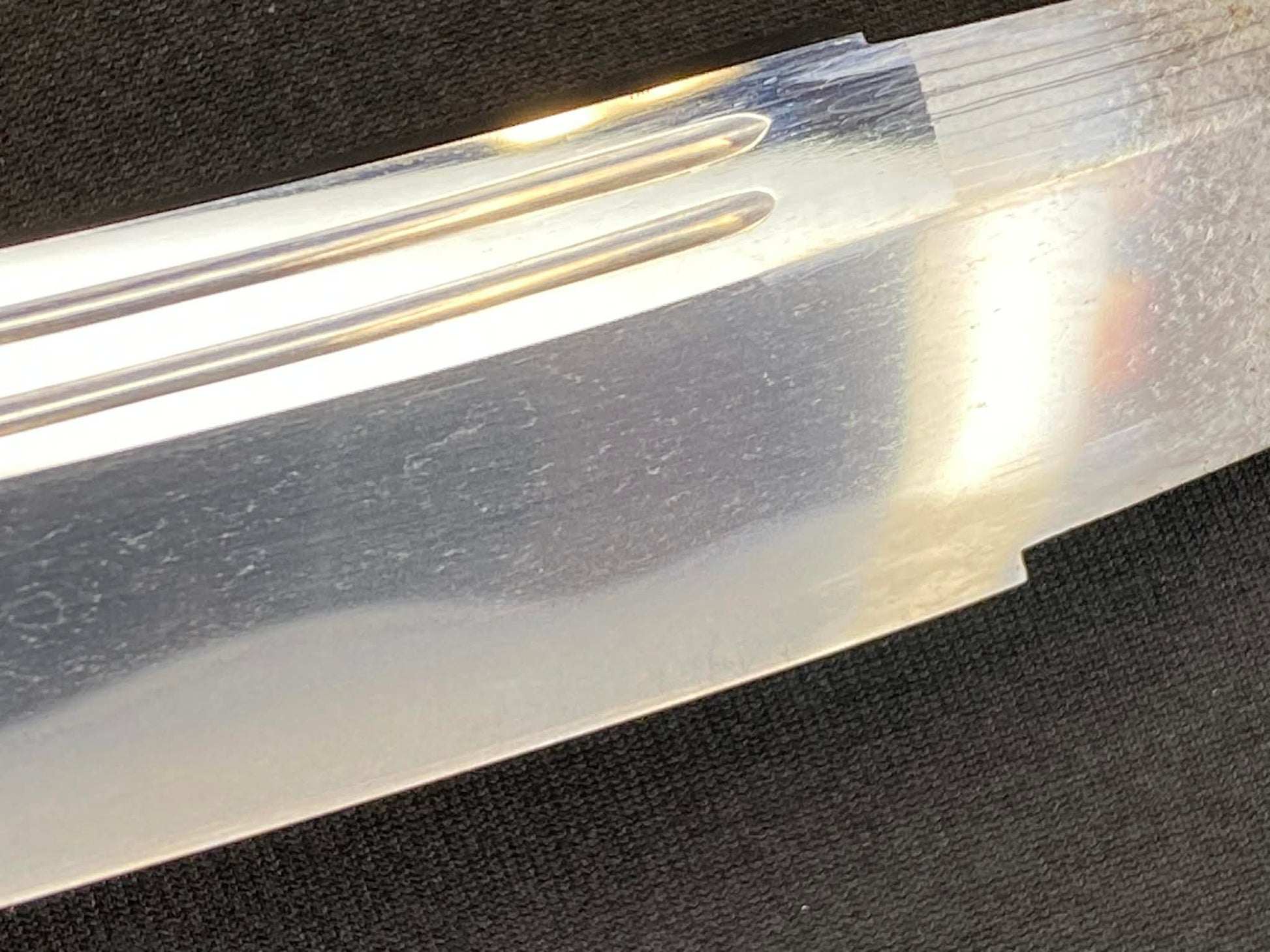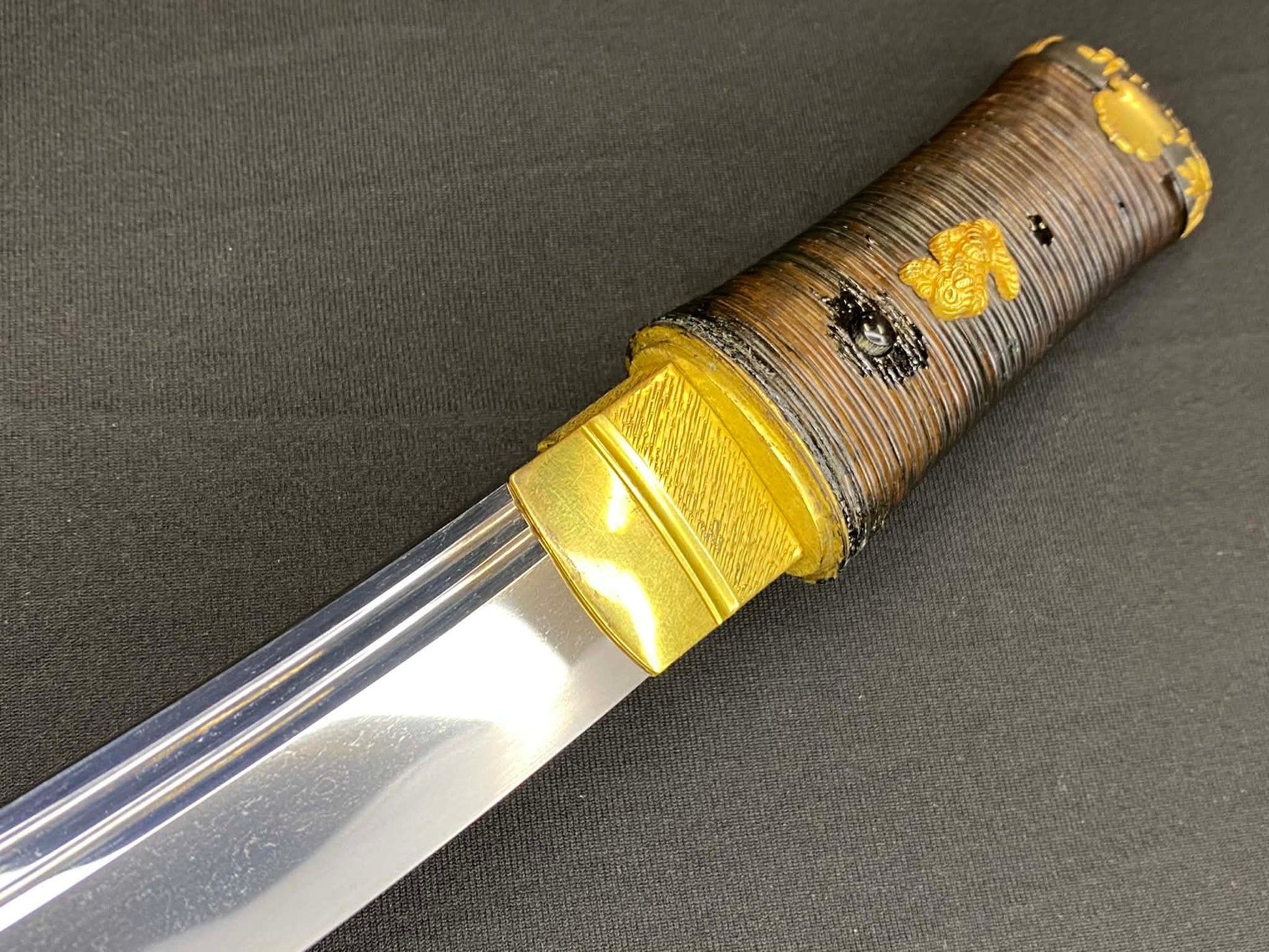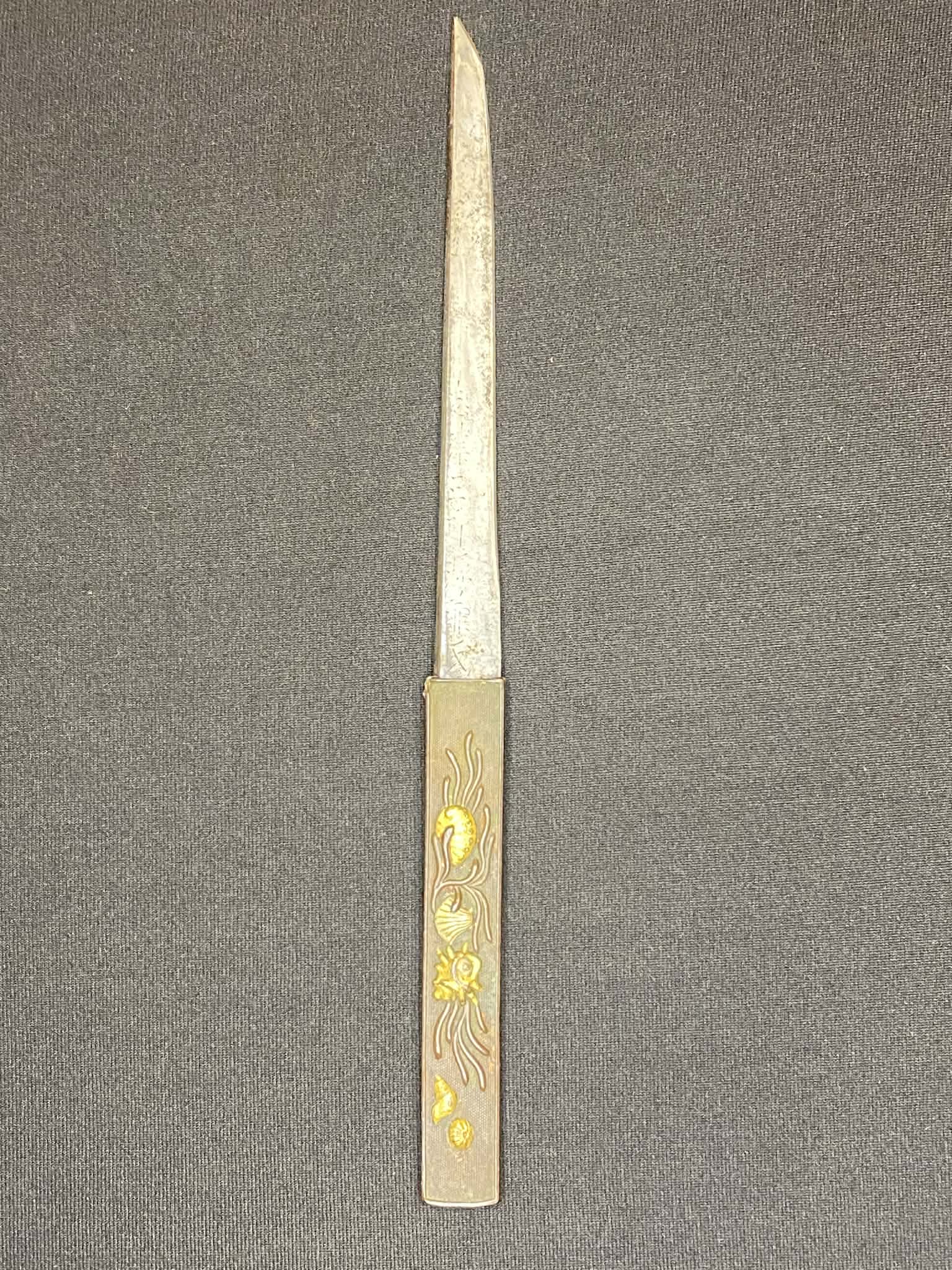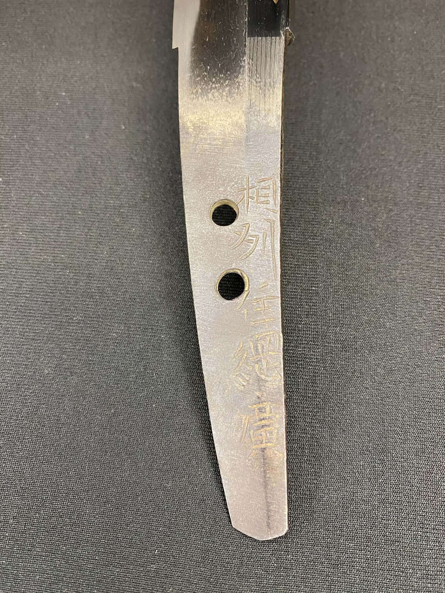This Osoraku Tanto is signed Soshu Ju Tsunahiro. There are seventeen generations with this name, starting in the 1500s in the lineage of Masamune. We are unclear what generation this is, though it looks to have been made during the late Edo period.