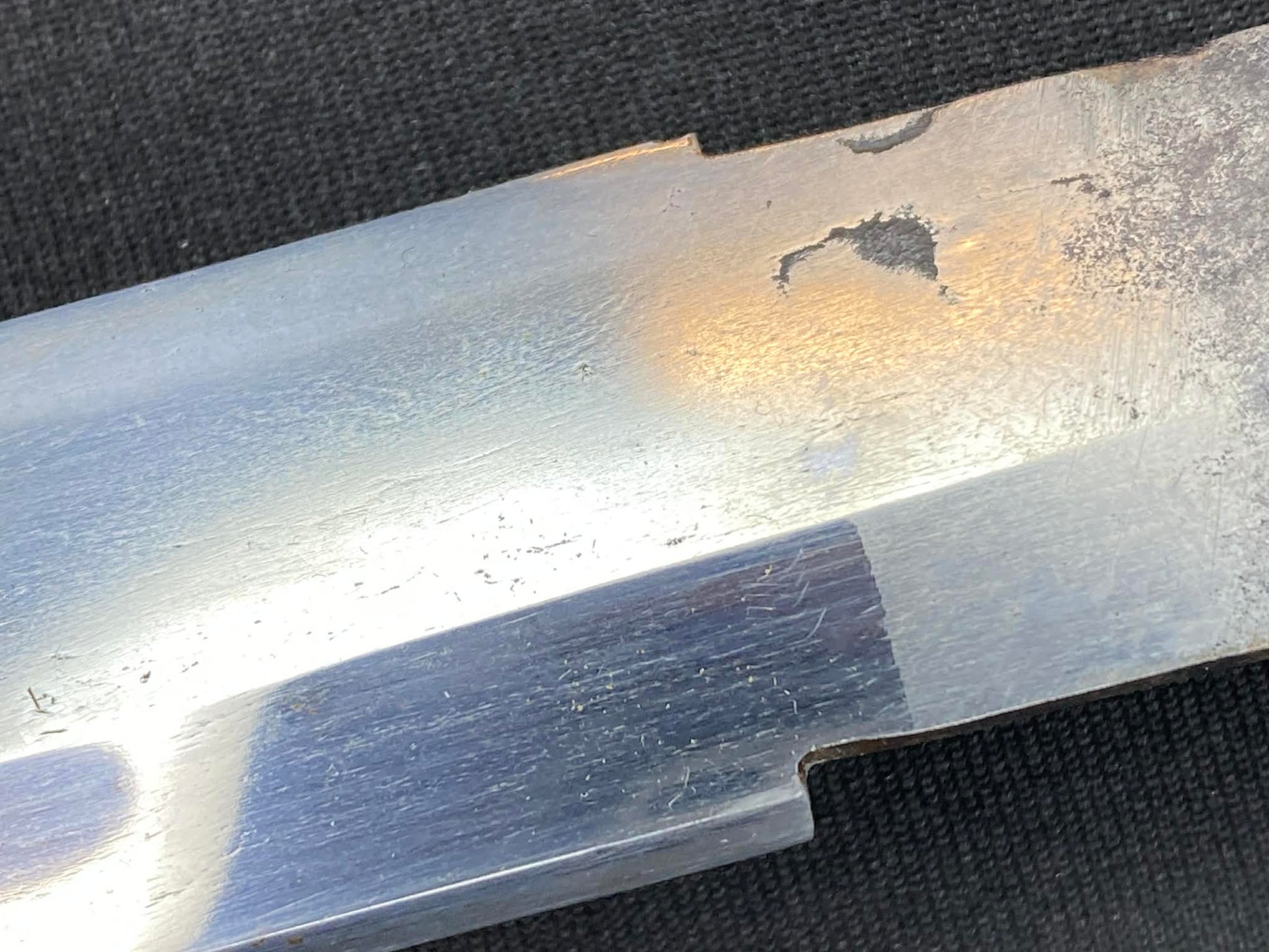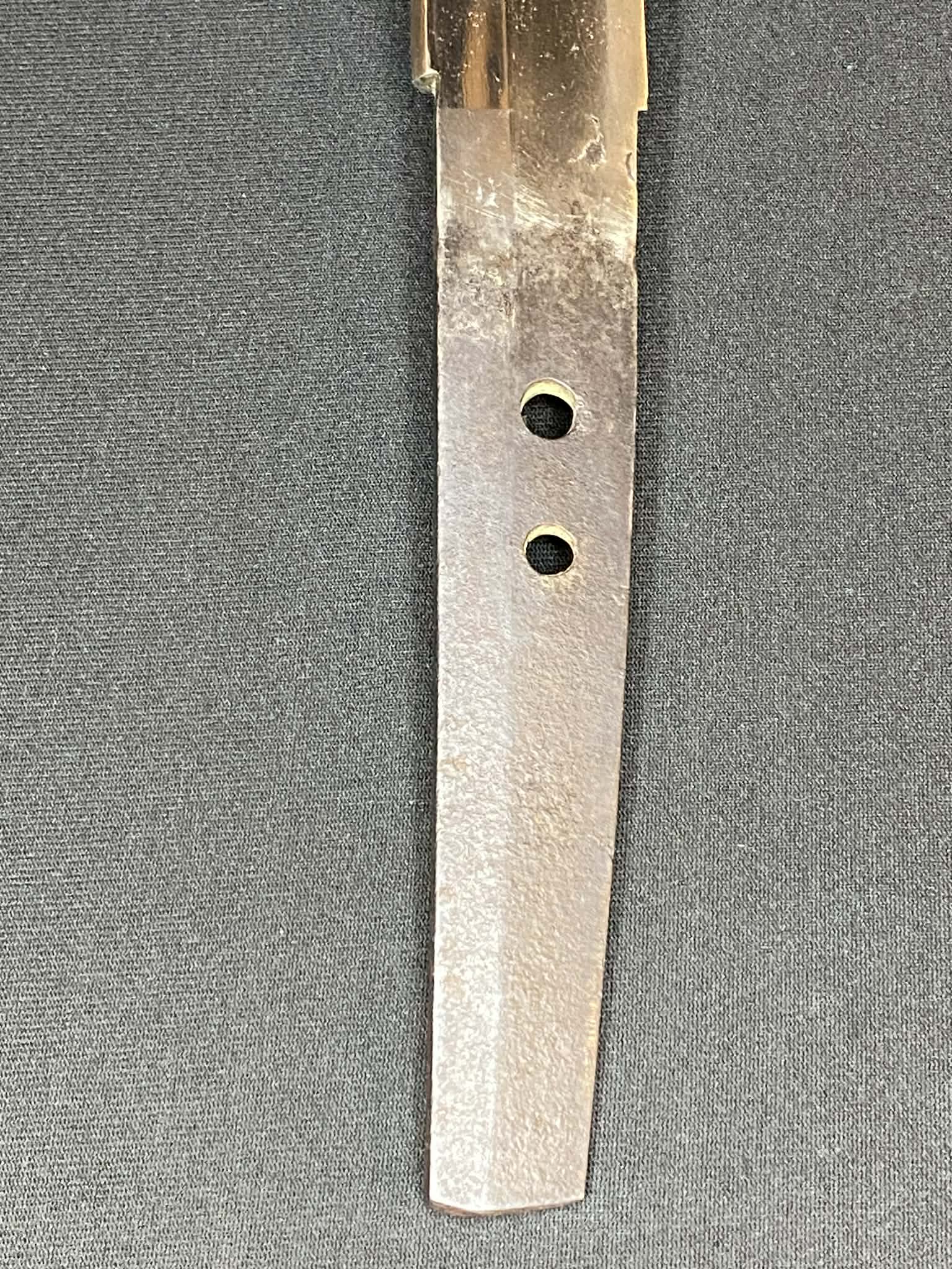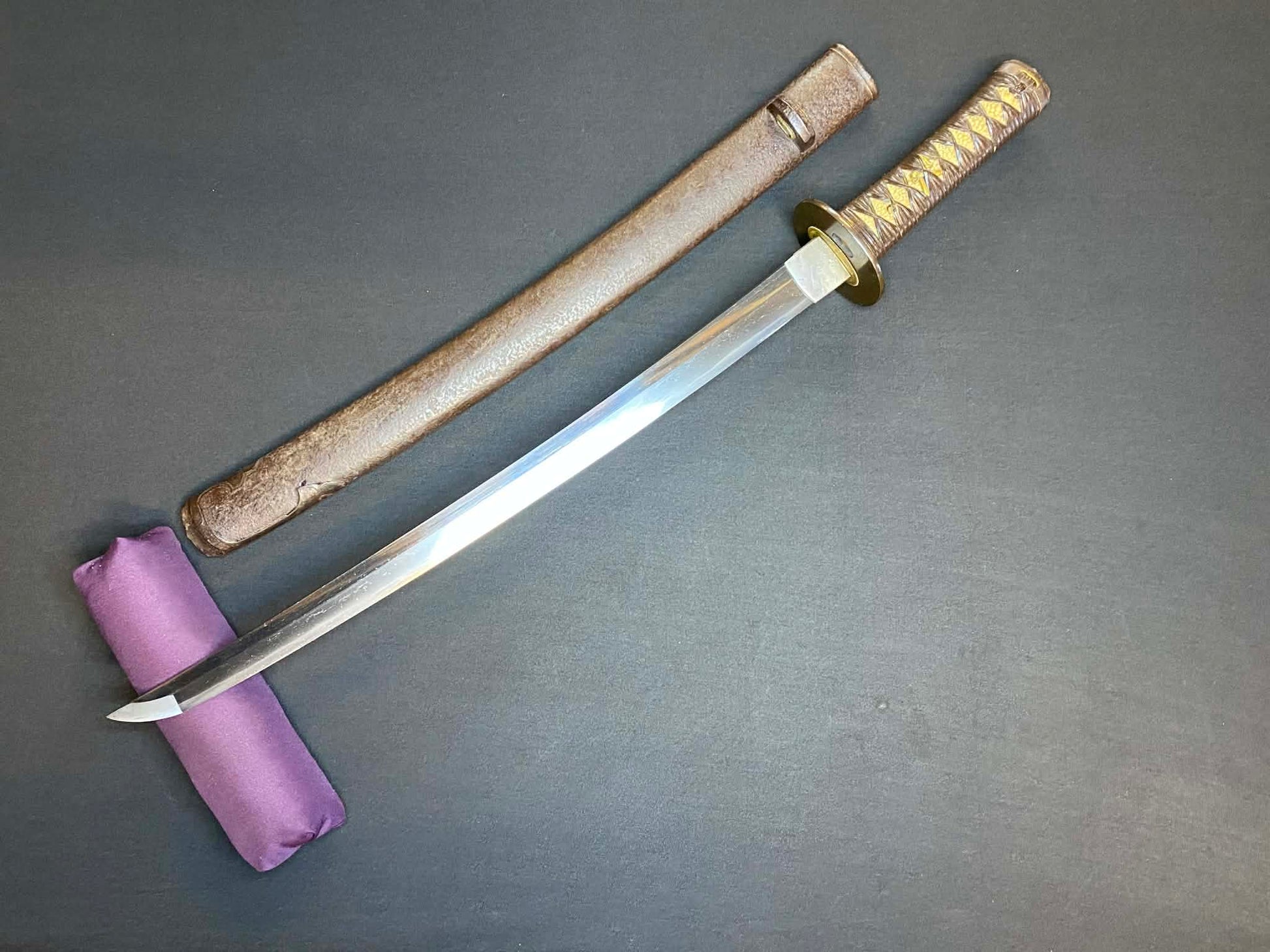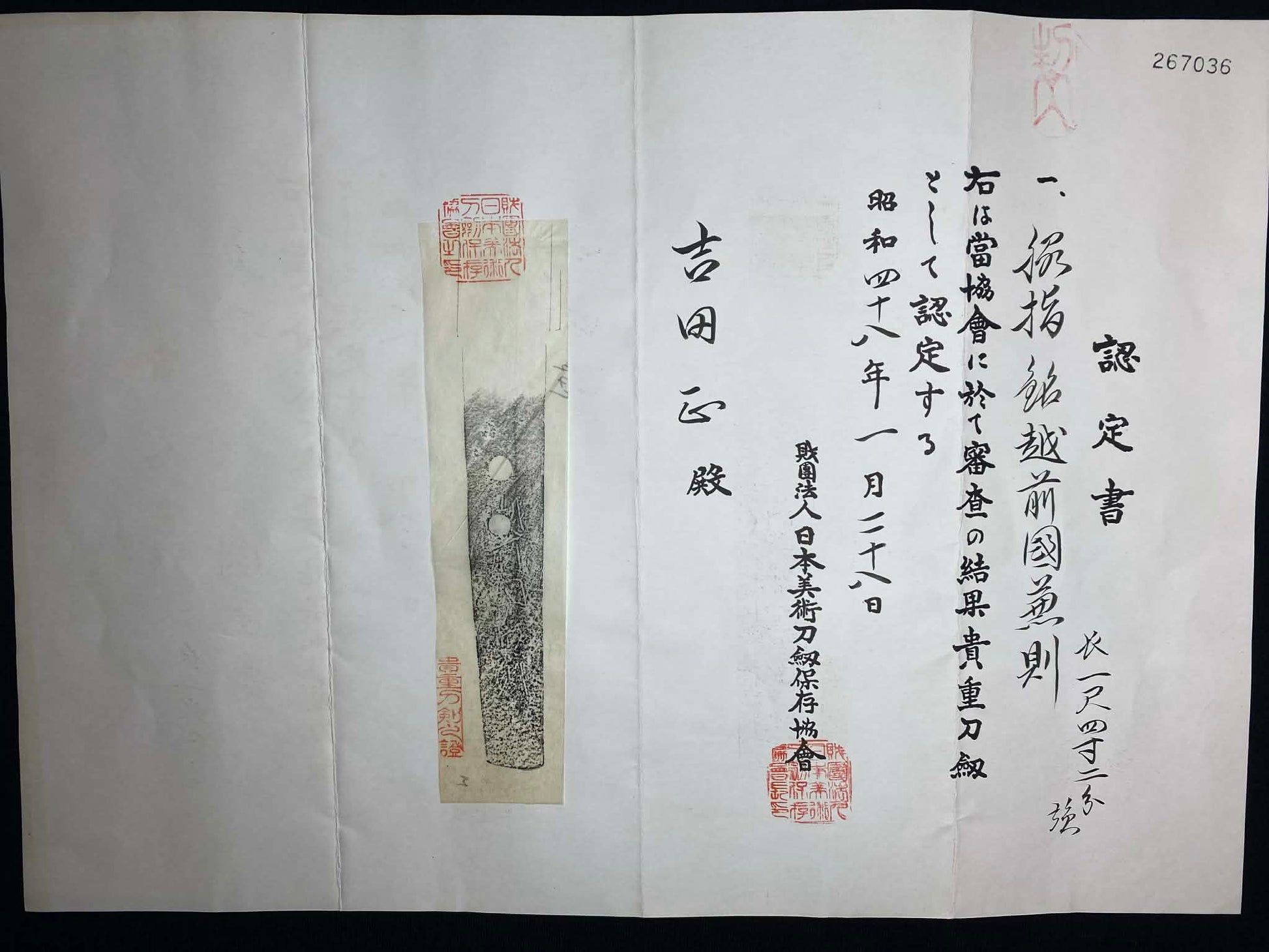 This shinogi-zukuri wakizashi is signed Echizen no Kuni Kanenori, and has been certified by the NBTHK. It is in Handachi koshirae.