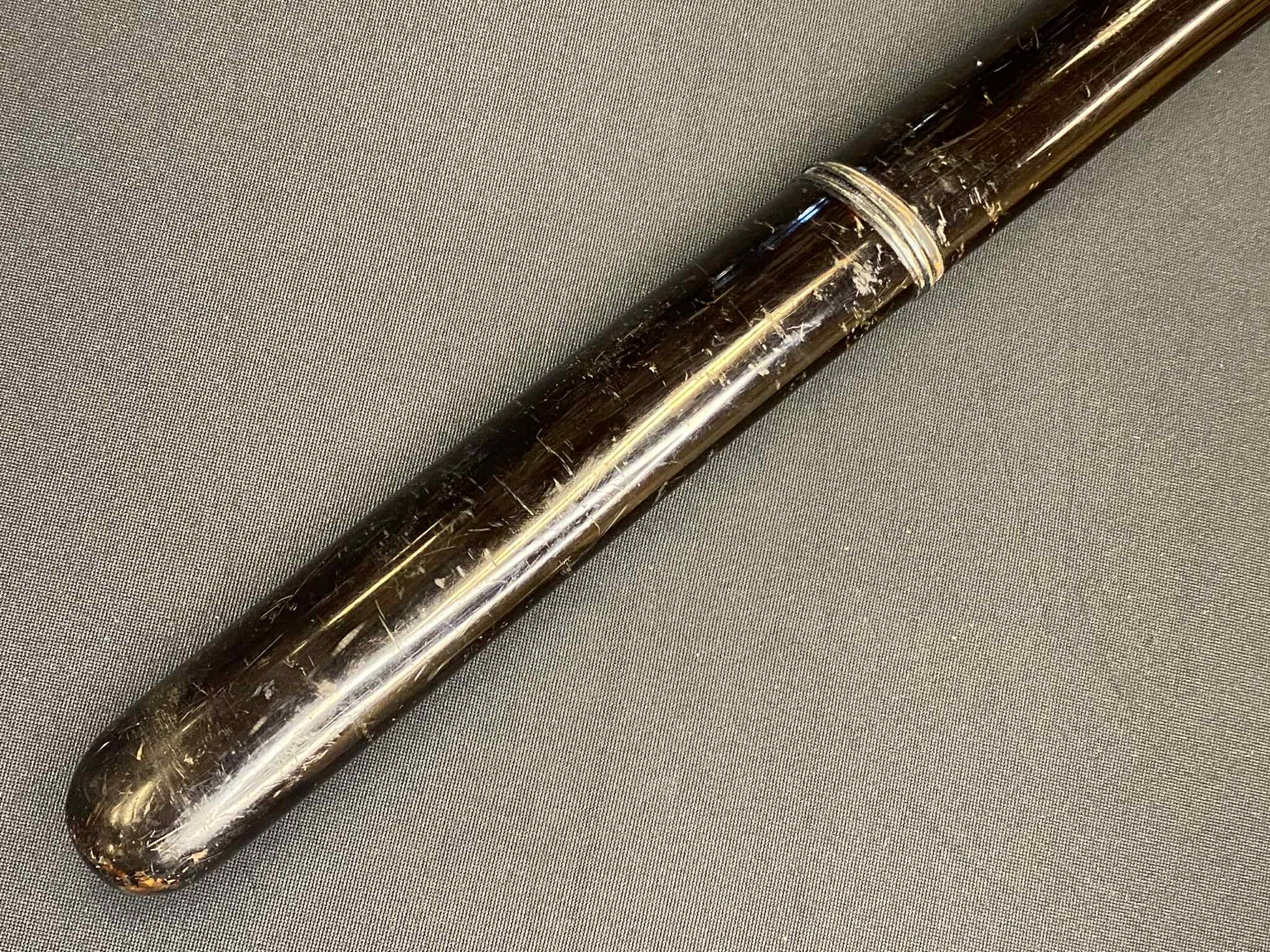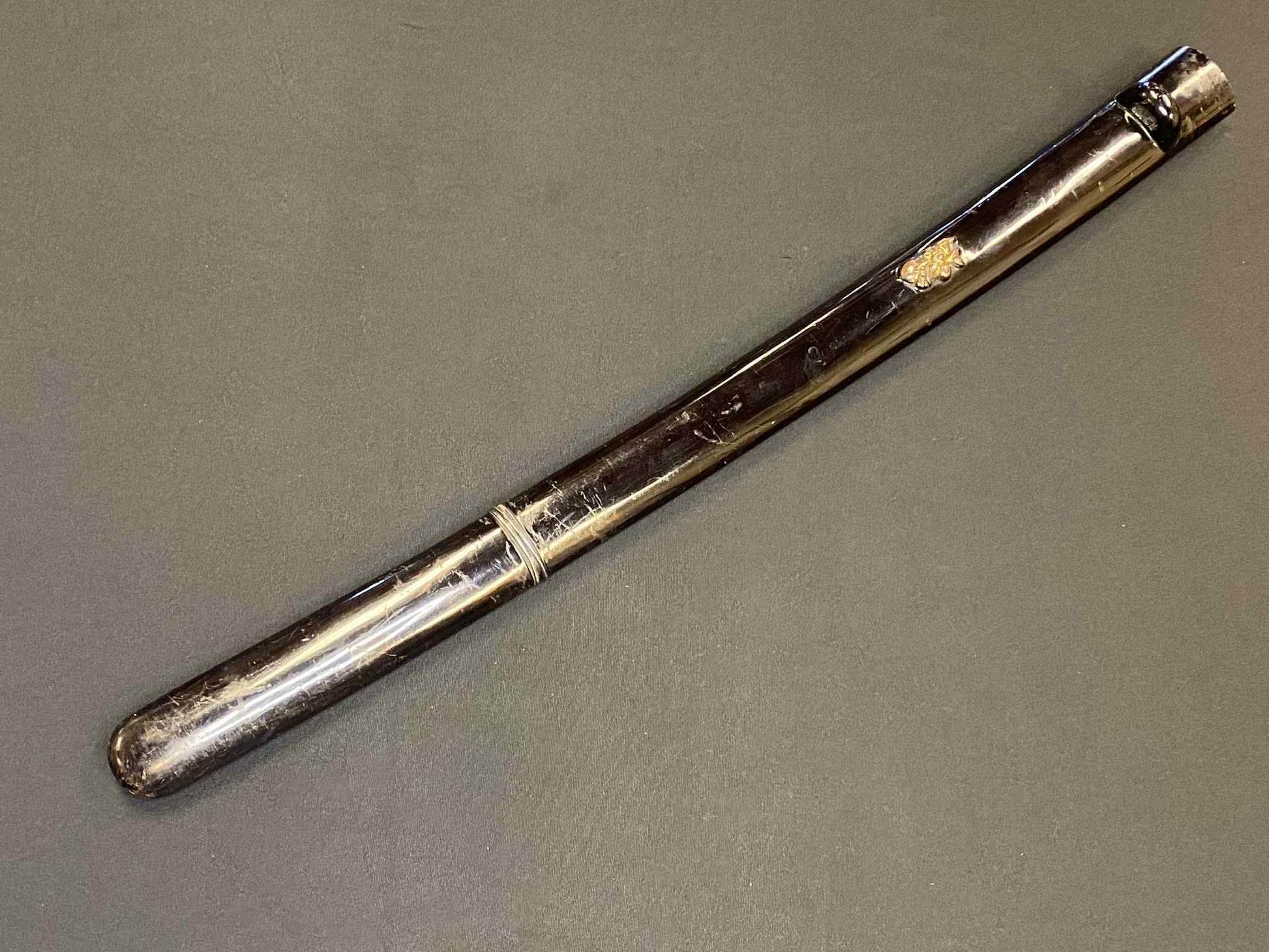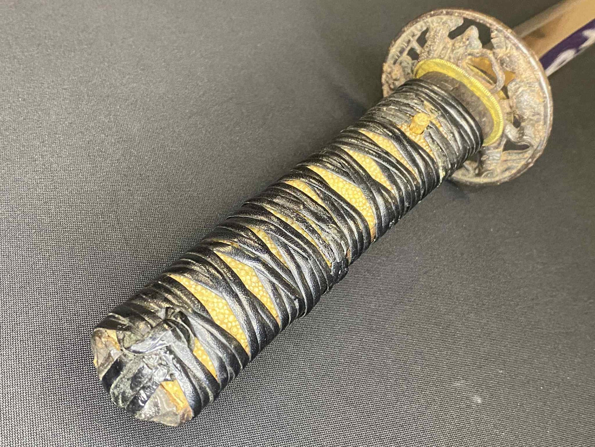 The leather jabarimaki (snake belly-style wrap) on the tsuka of this wakizashi is coming loose.
