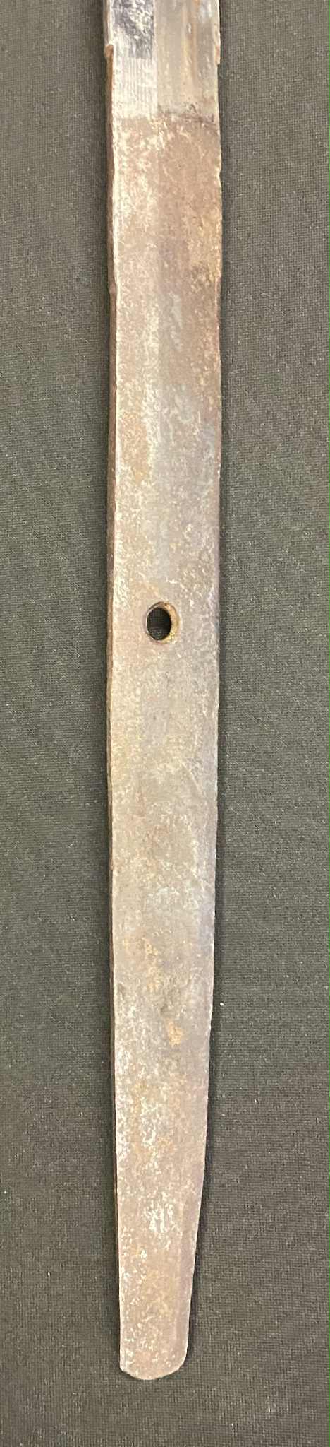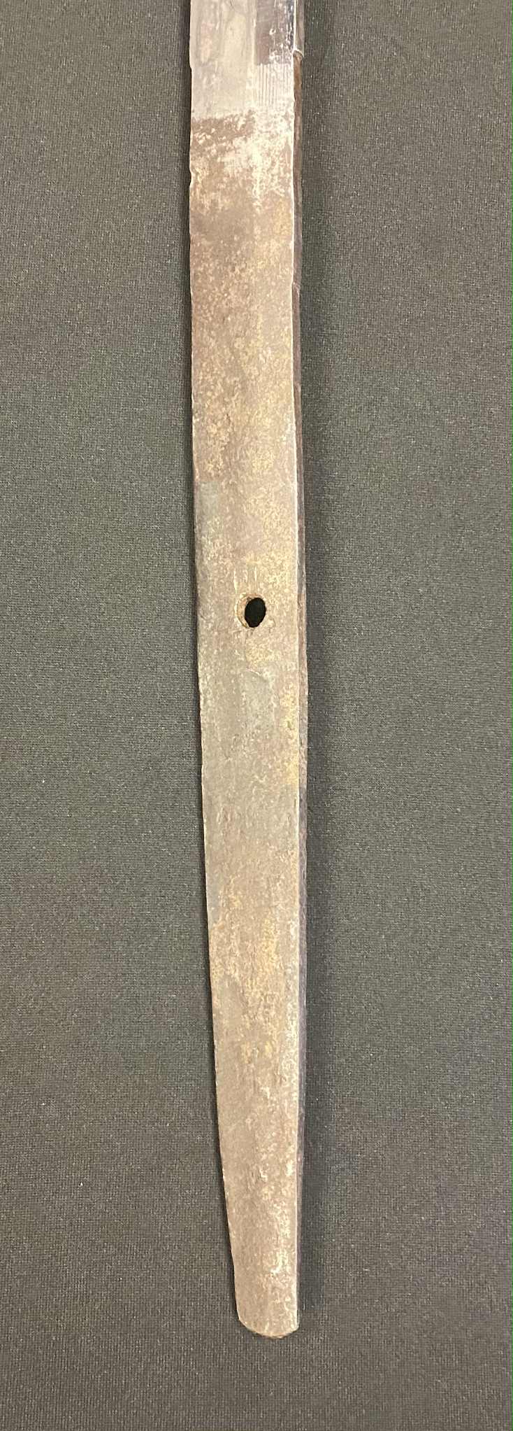 UPDATE: Charlie White, a dealer in Japan, believes this to be a Muromachi era sword made by the Hoju school. Hoju is one of the oldest lineages of swordsmiths in Japan, established by the Emishi people, who dispersed throughout Japan after their defeat in the 1000s.