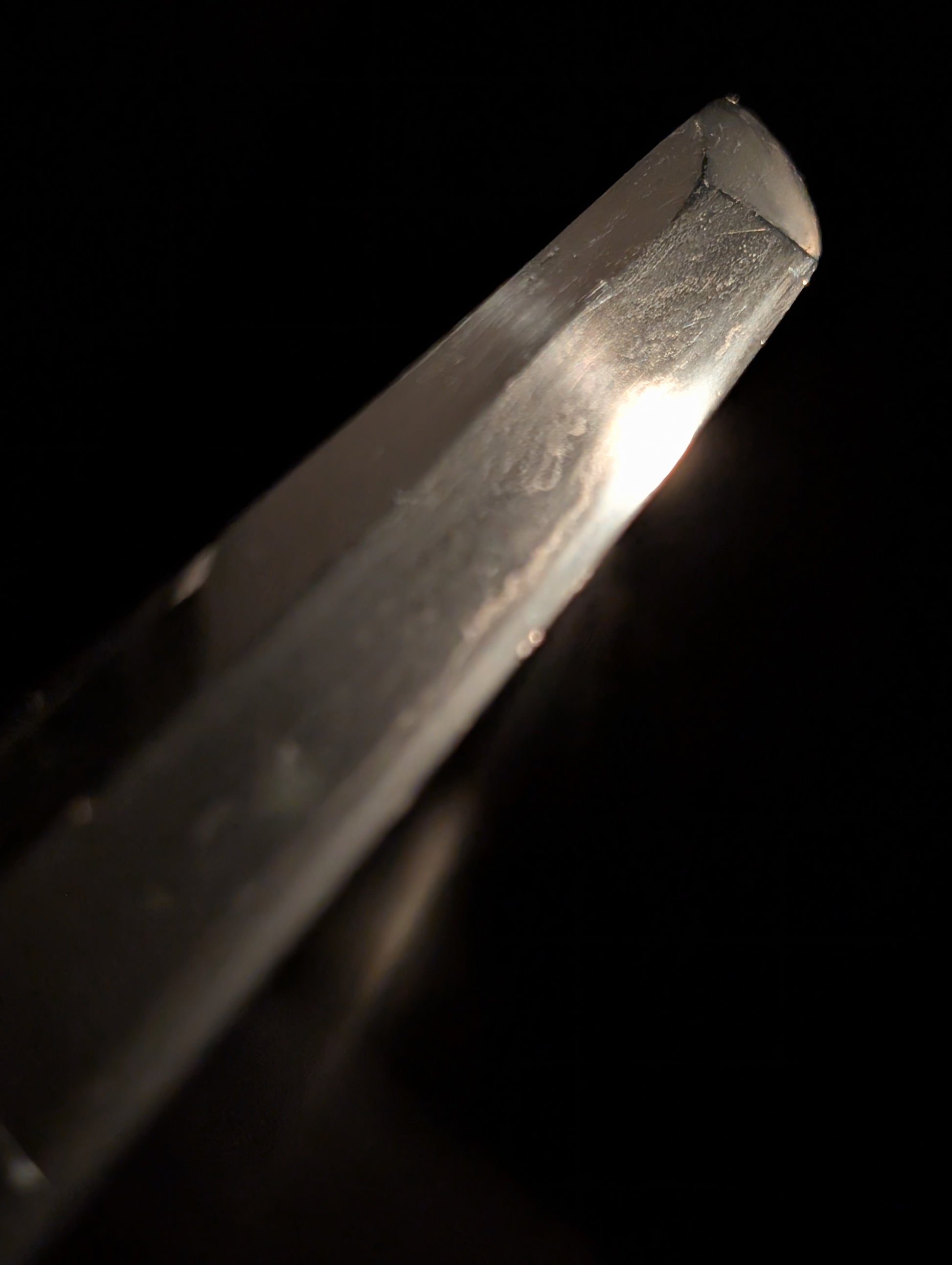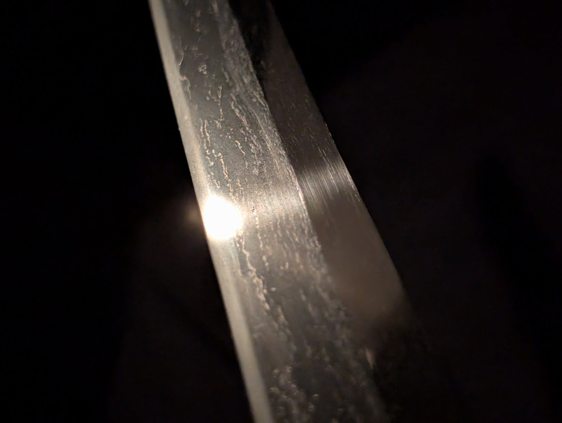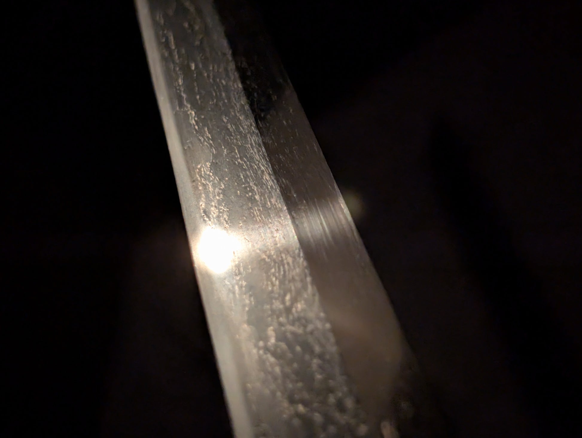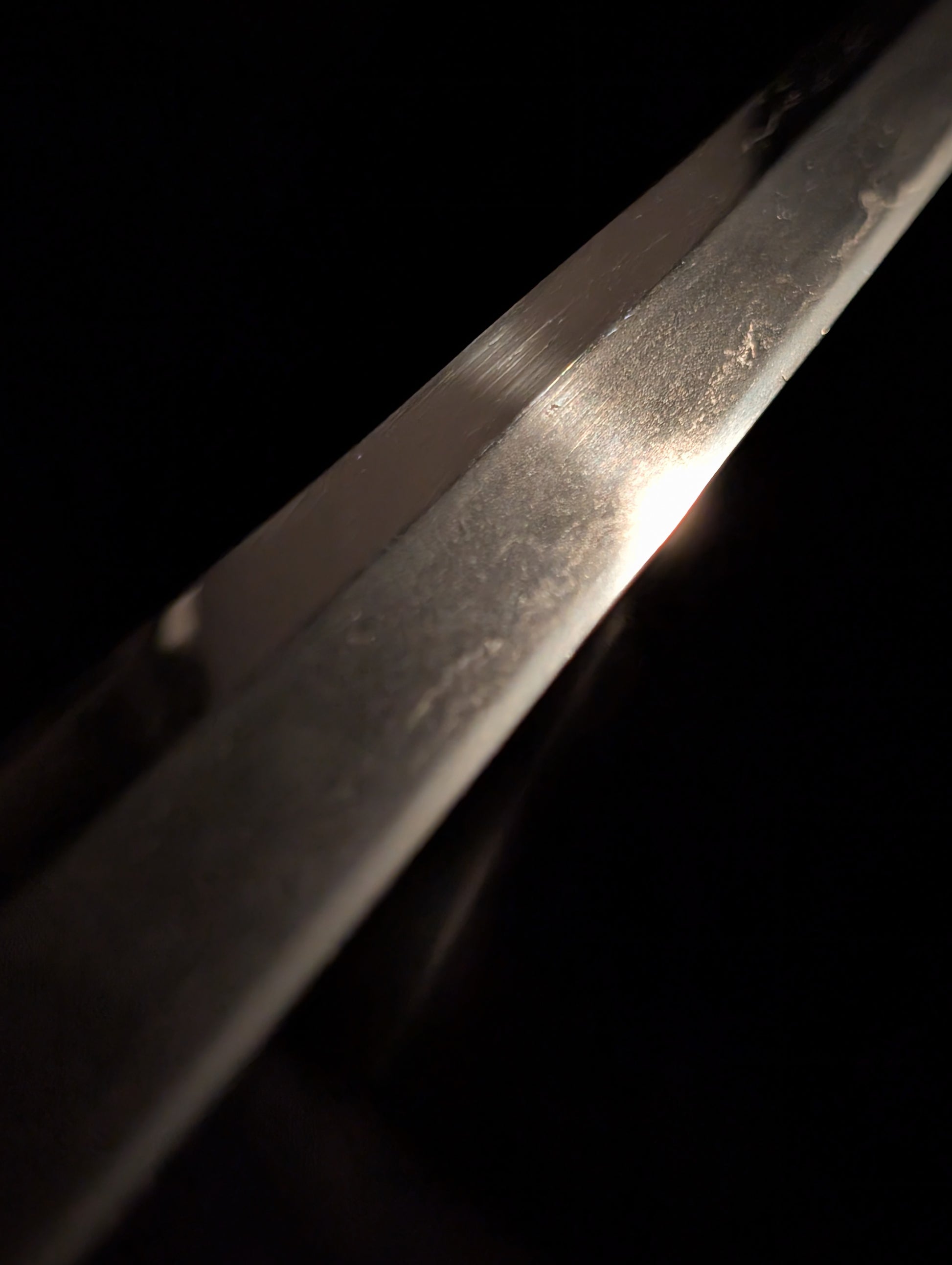 It has a hakobore (cut scar on the edge), as well as several kitae ware that have been revealed with repeated polishings over the centuries. The habaki is too wide for the blade, but fits in the shirasaya.
