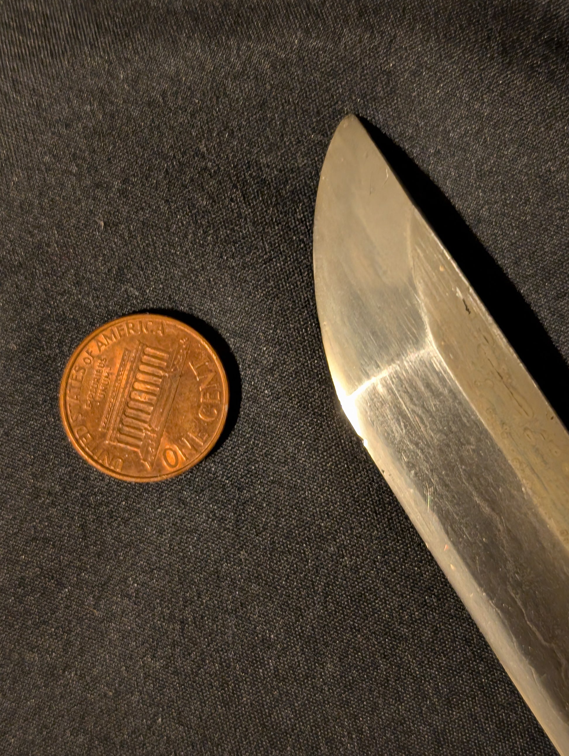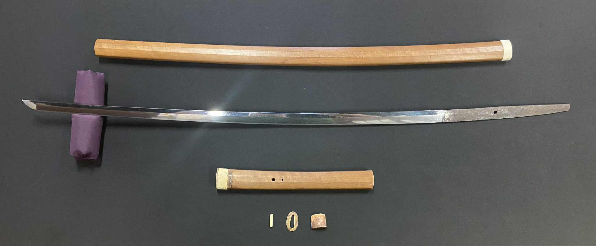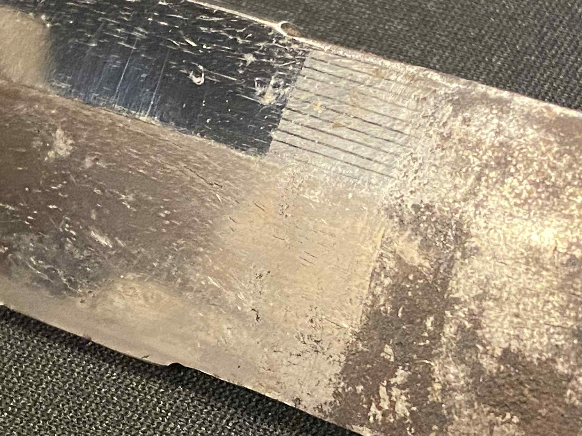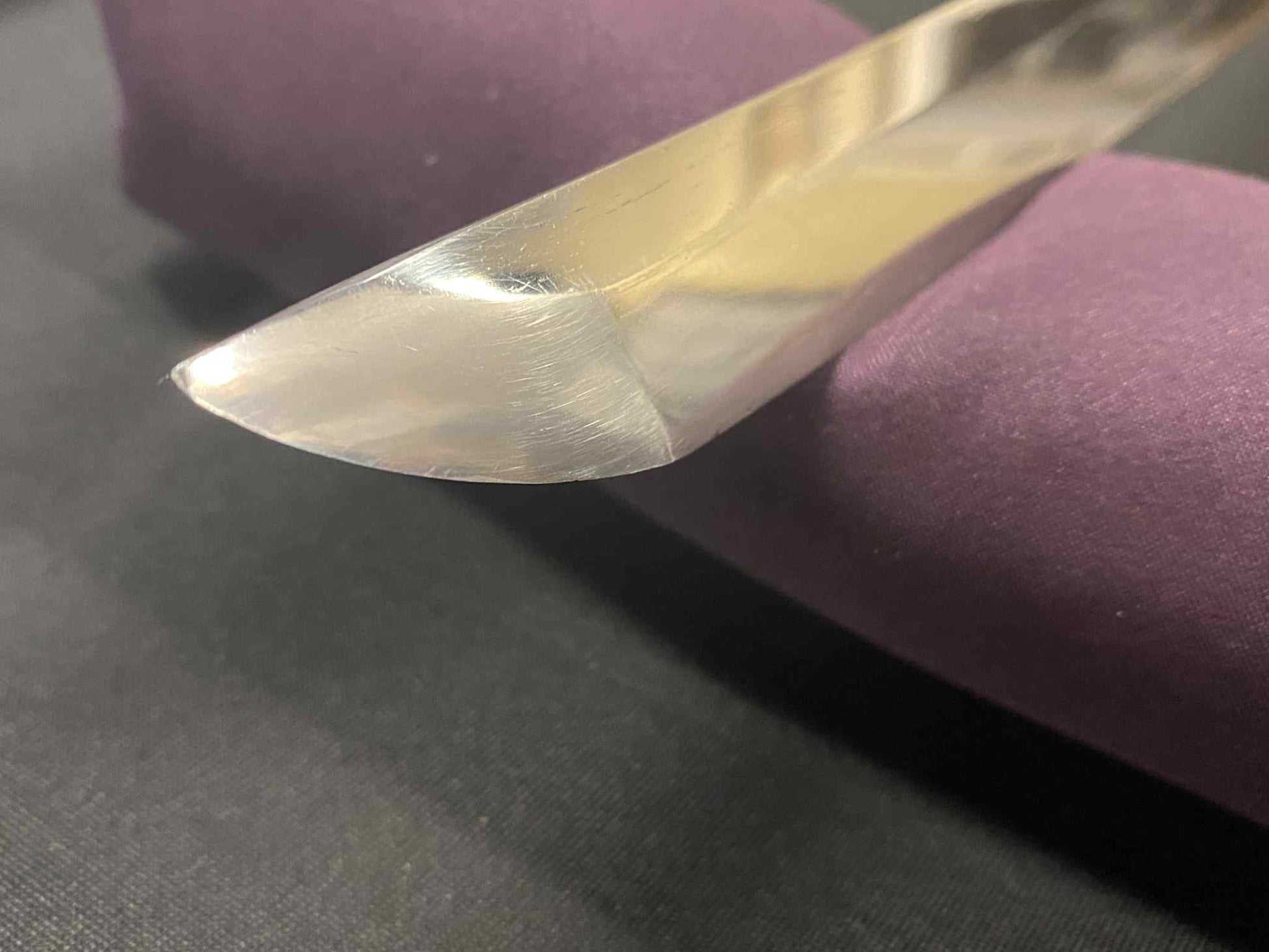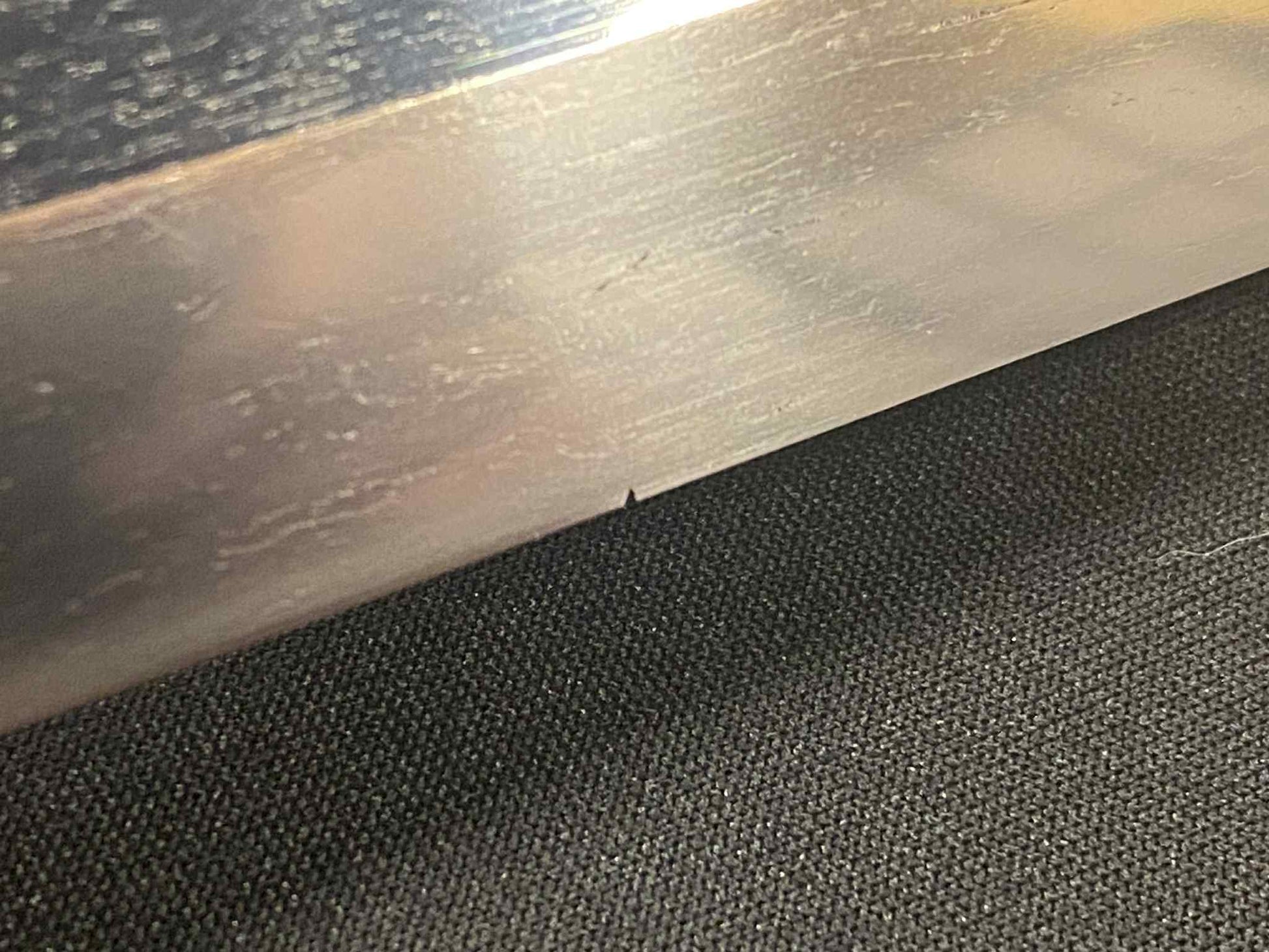 It has a hakobore (cut scar on the edge), as well as several kitae ware that have been revealed with repeated polishings over the centuries. The habaki is too wide for the blade, but fits in the shirasaya.