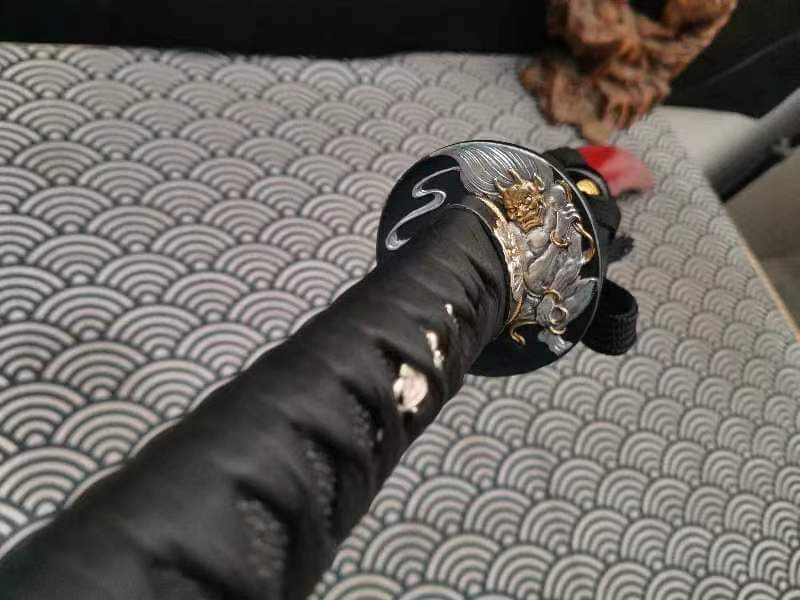 The Fire Oni katana is made from sx105v alloy tool steel with an early termination bohi and mounted in gold and silver highlighted brass fittings.