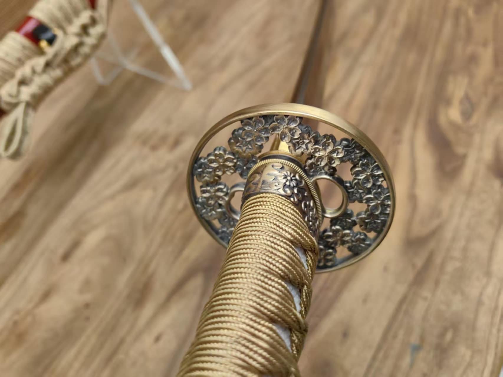 Fittings are brass with gold highlights, and the wrap and sageo is natural silk.