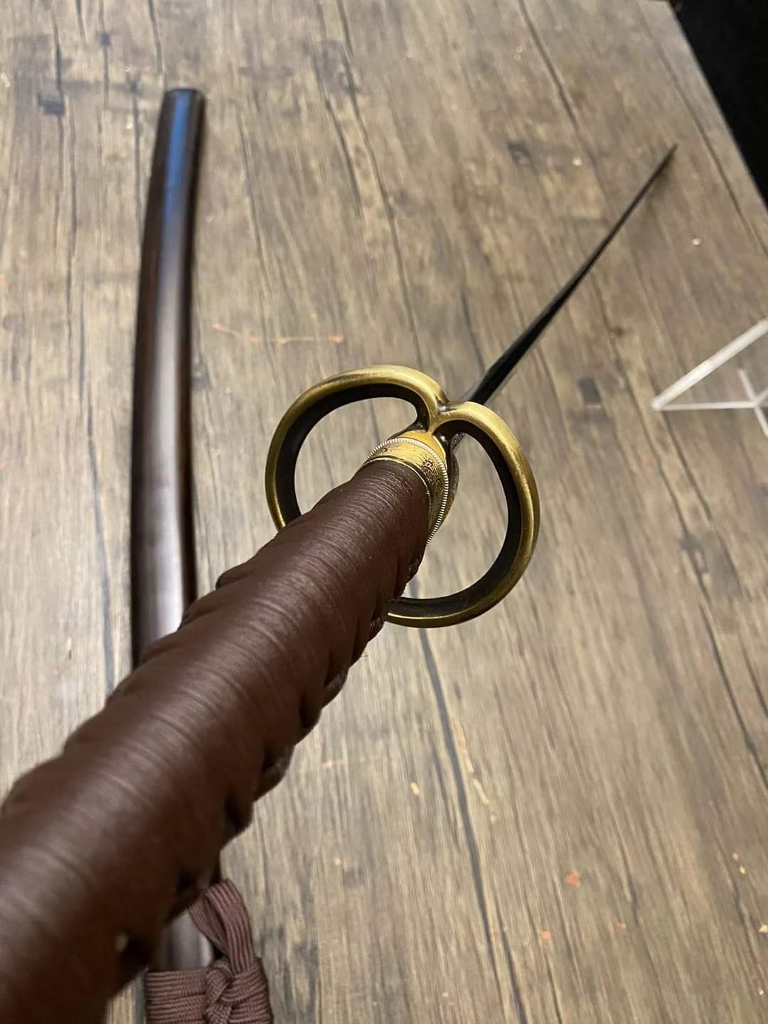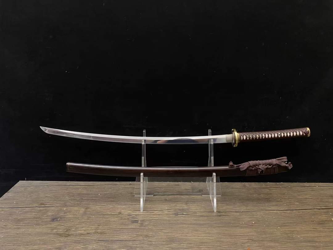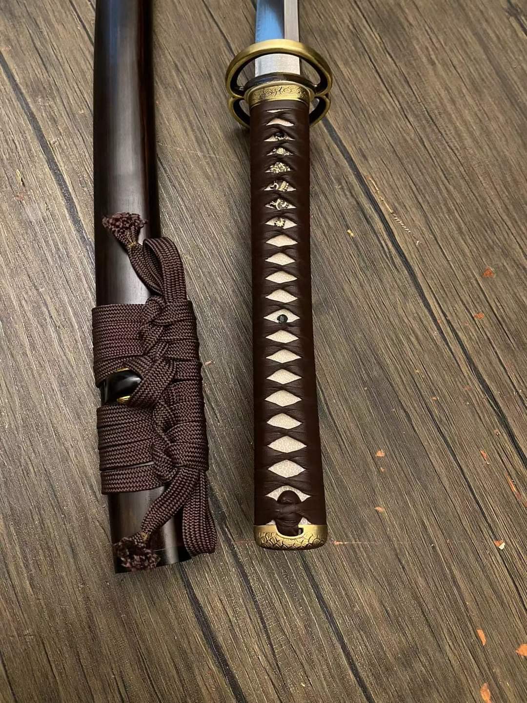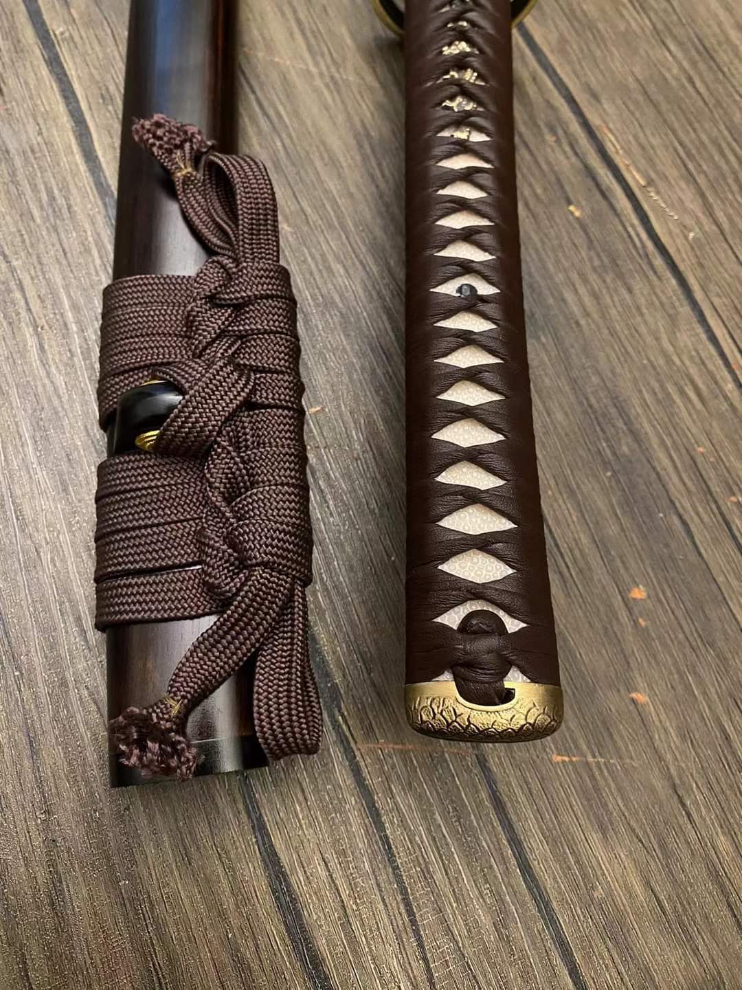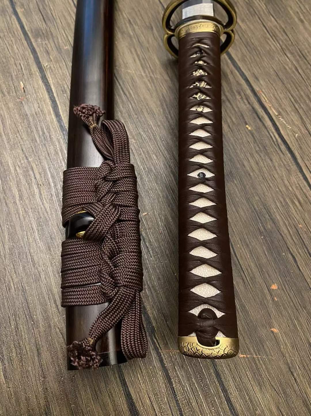 This katana is one of Cloudhammer's new standard lengths It features a rosewood saya and a copper Musashi tsuba. Polymer tsuka core is wrapped with Cloudhammer leather.
