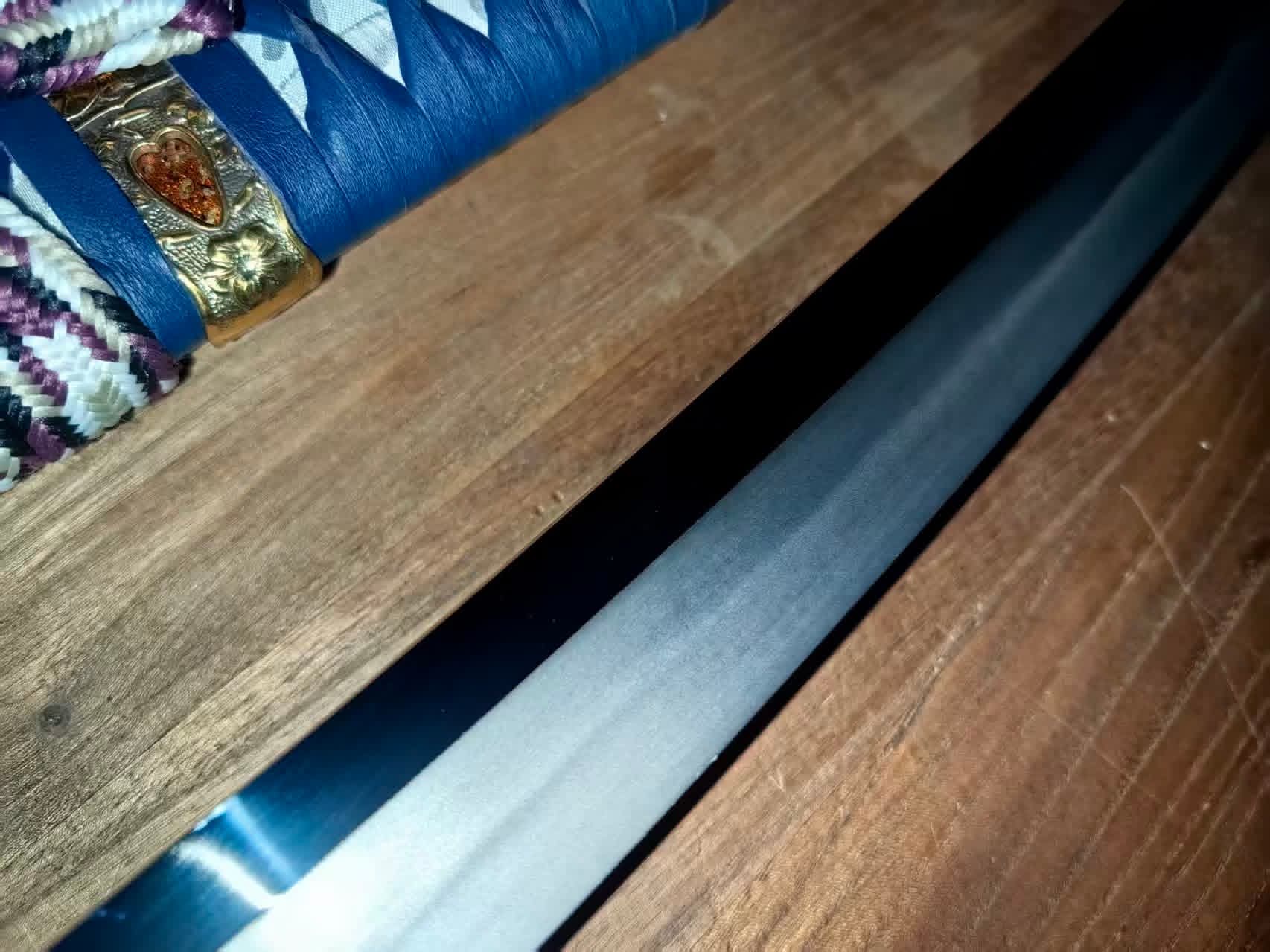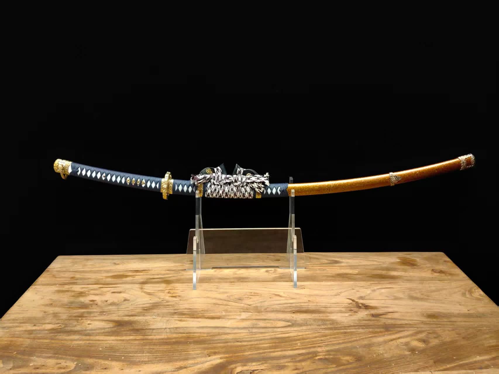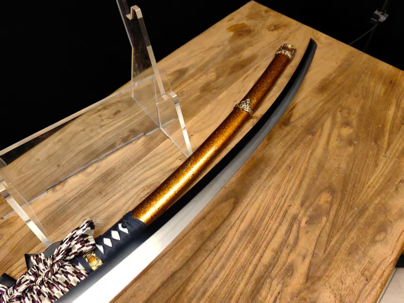 Tachi fittings are highly polished brass in the sakura theme, and the tsuka and saya are wrapped with Cloudhammer's leather.