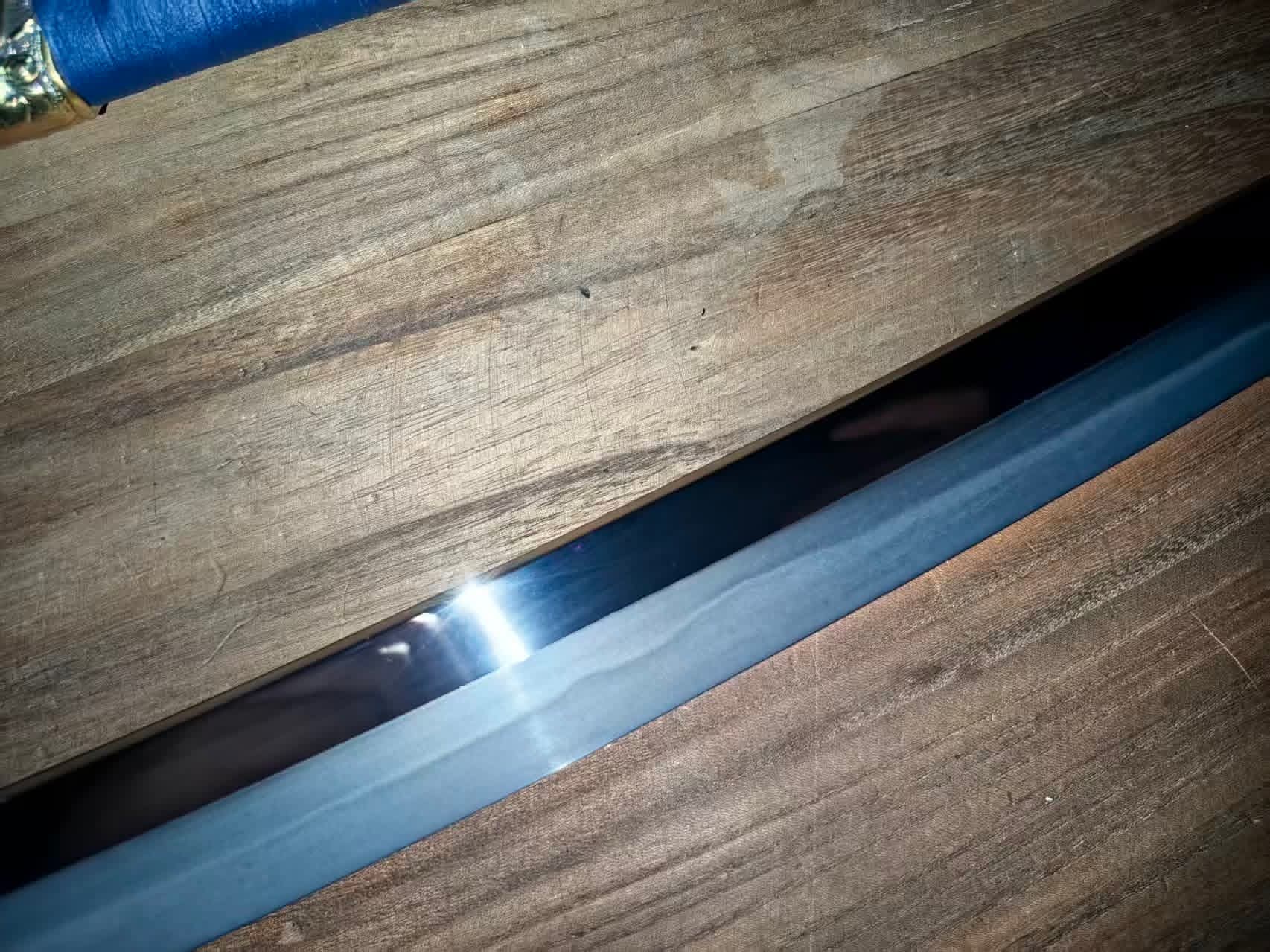 Replicating the length and curve of the Mikazuki Munechika, one of the Five Swords Under Heaven, this Tachi is made from w2 cable steel. It is differentially hardened to create a suguha hamon instead of the unique pattern that gives the Mikazuki it's name.