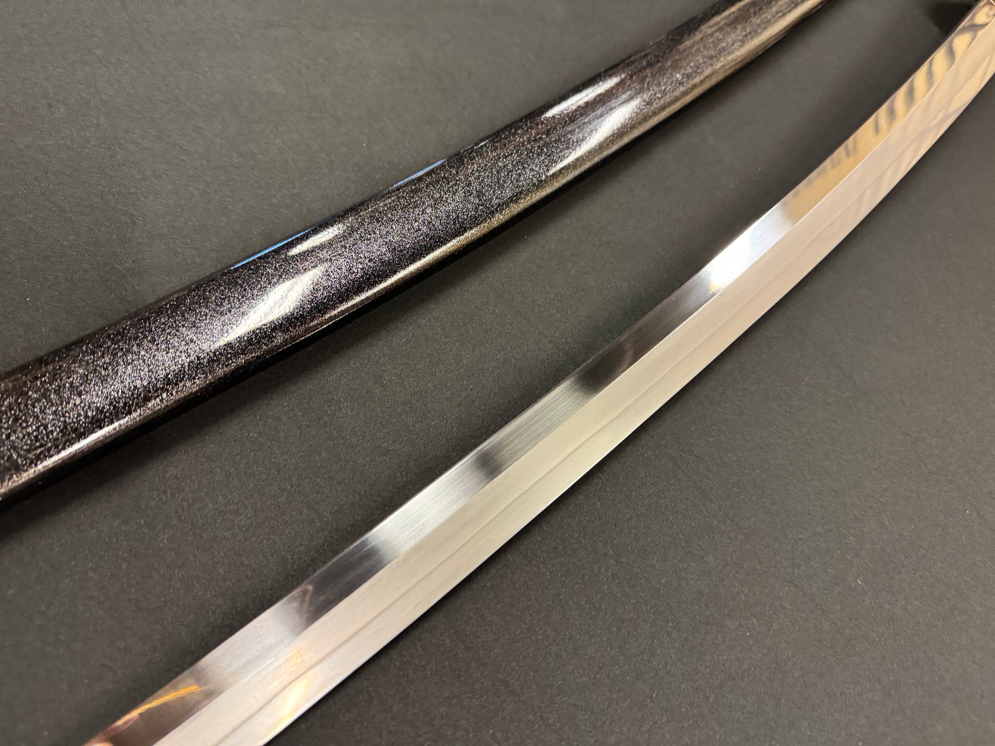 From Cloudhammer Steelworks comes a beast of a sword. The Titan Series has landed at RVA Katana! Featuring a whopping 84 cm (33 in) blade that is 40 mm wide (1.5 in) and forged from Japanese SX105v tool steel, these are truly monster wide cutters! The Titan series all feature Cloudhammer's premium leather handle wrap, new furniture designs, and gorgeous black scabbards with flake under clear lacquer. The blade is differentially hardened, showcasing a beautiful natural Hamon temper line. SX105v tool steel is renown for having excellent edge retention and is designed for cutting both hard and soft targets. If you're looking for a monster cutter, the Titan Series is for you!