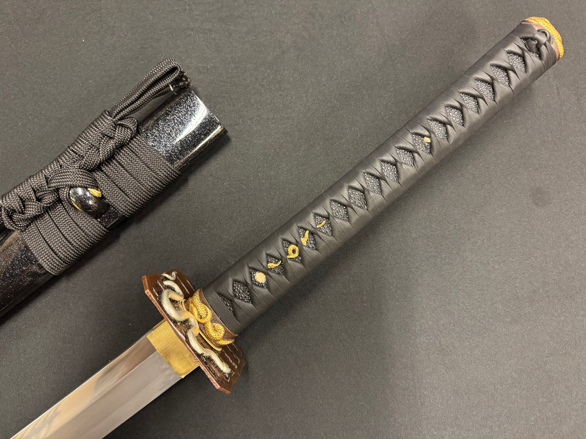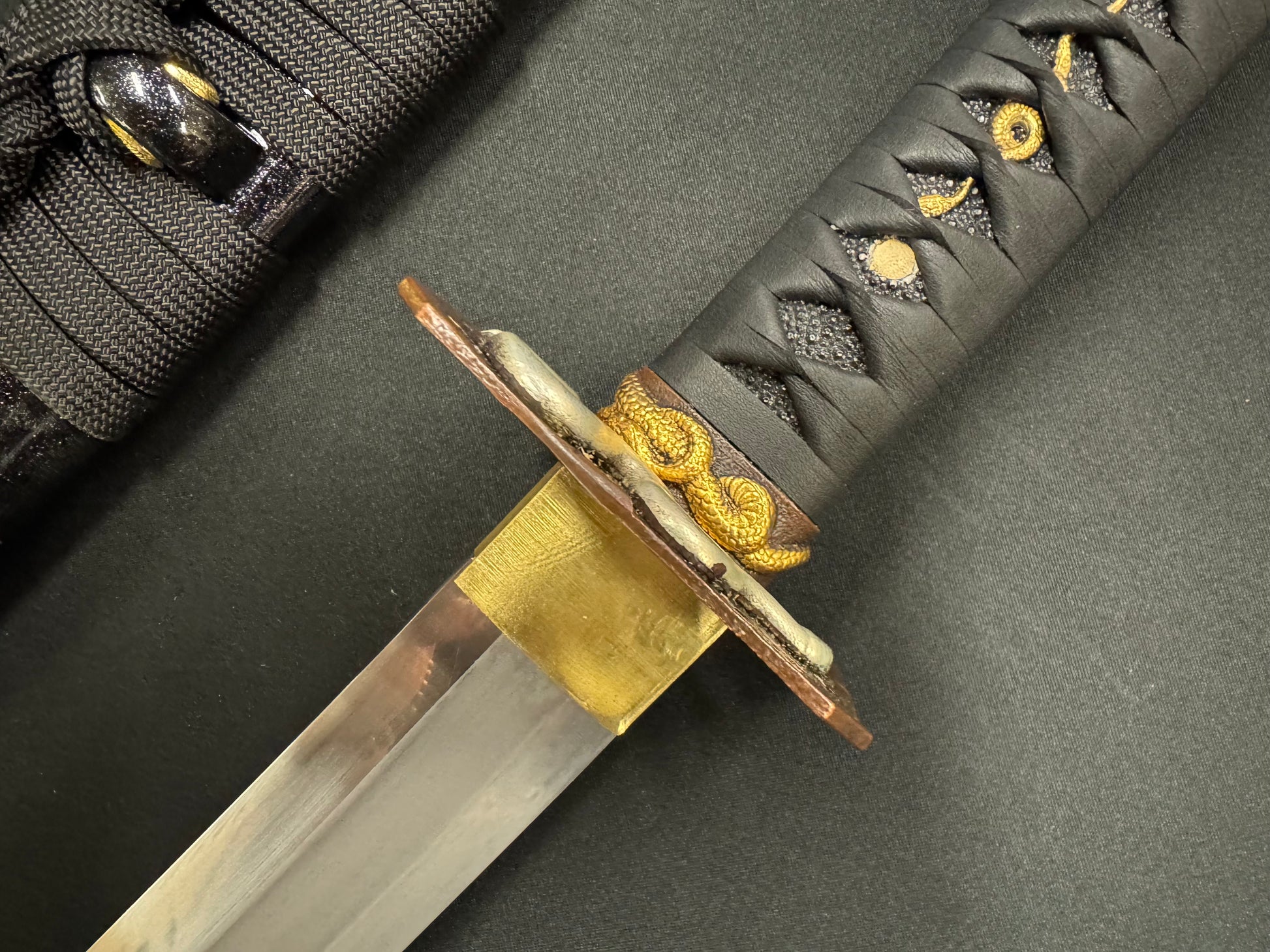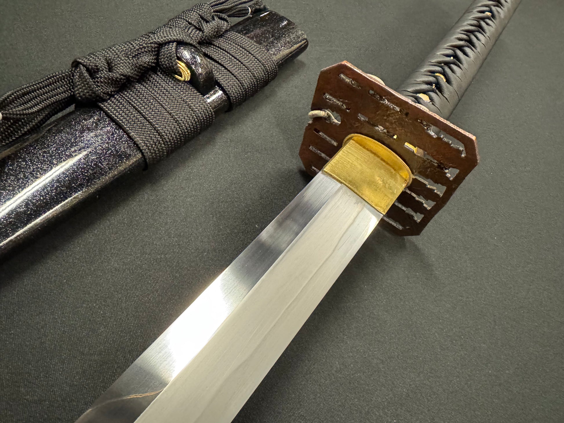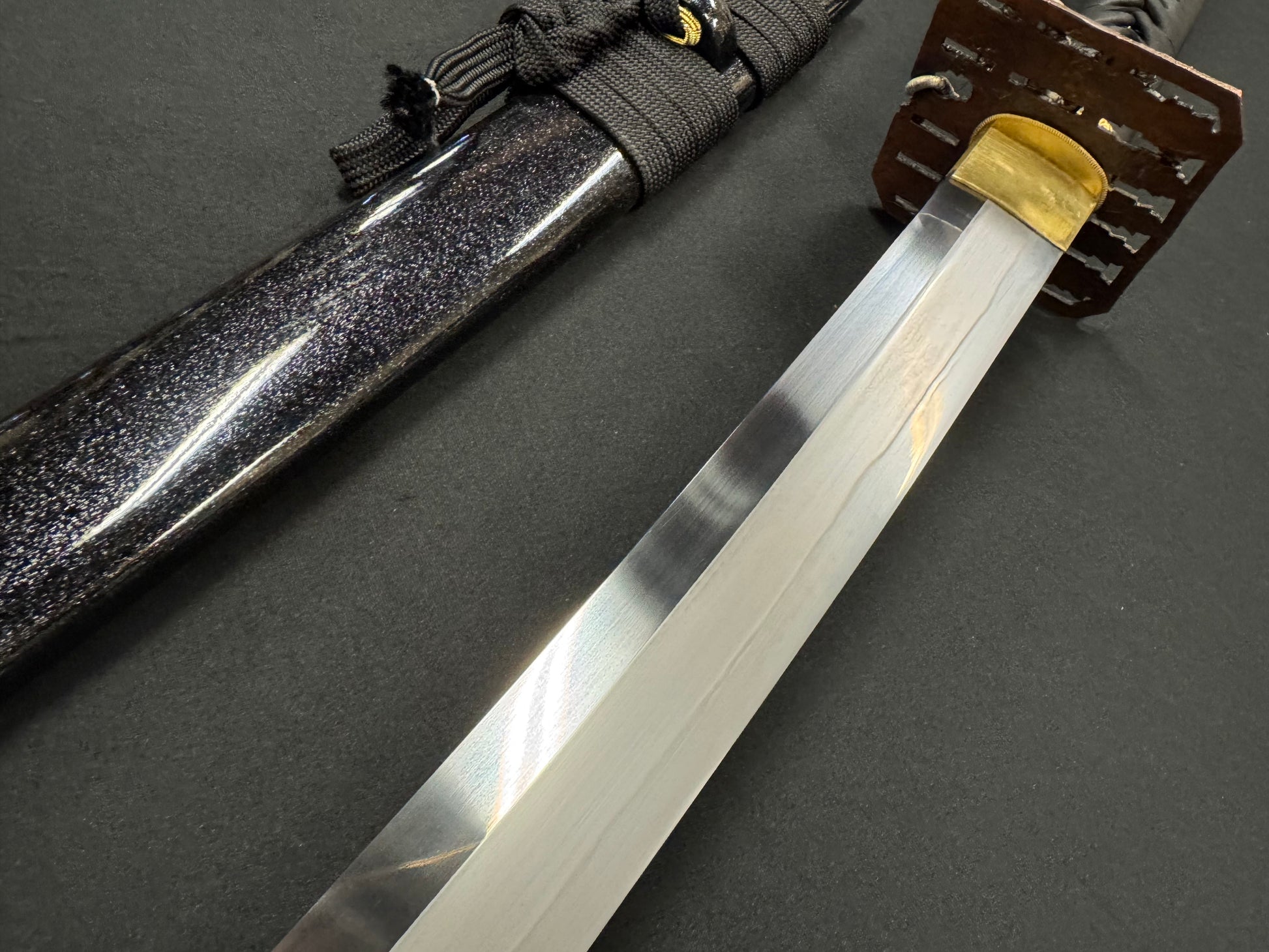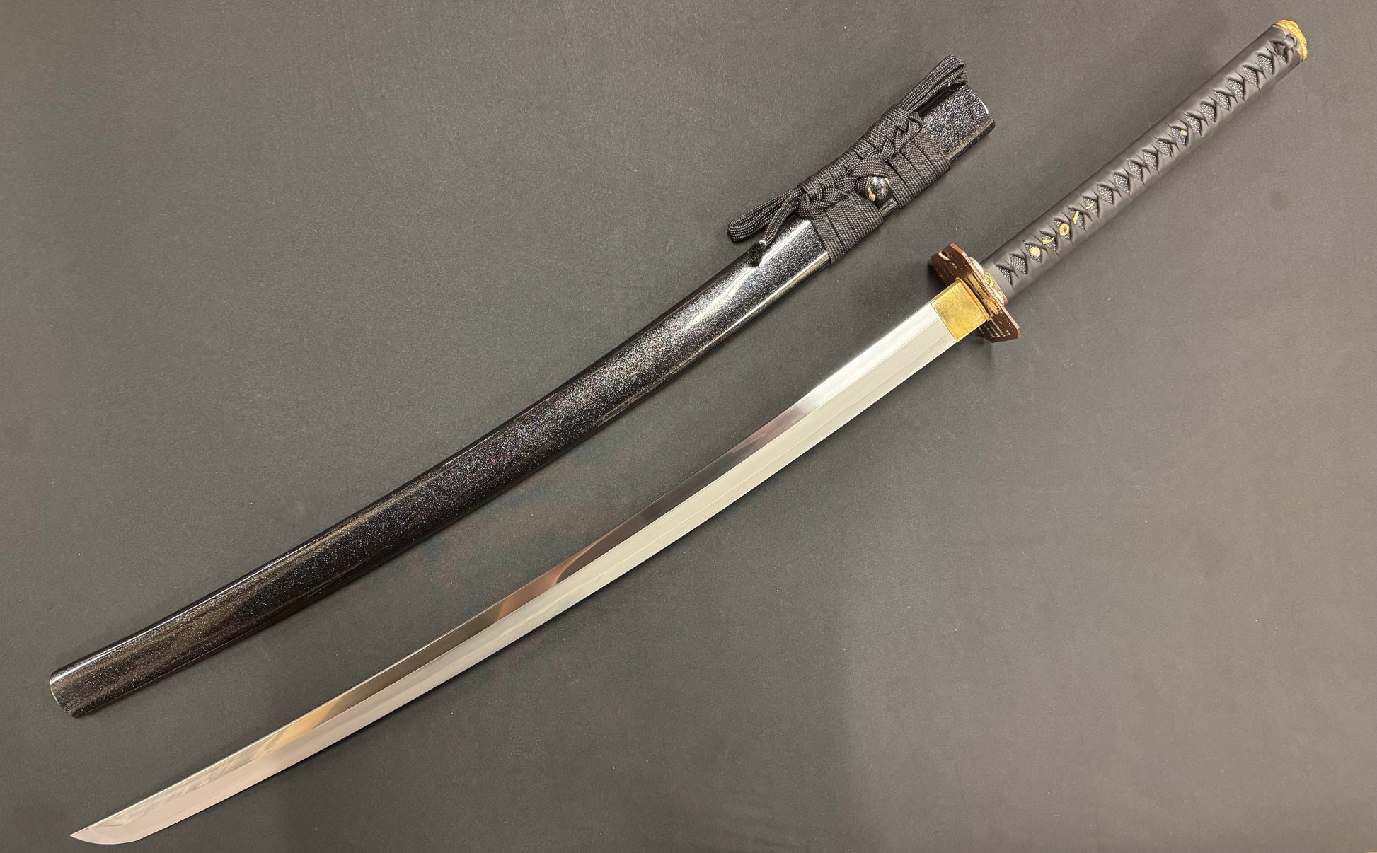 From Cloudhammer Steelworks comes a beast of a sword. The Titan Series has landed at RVA Katana! Featuring a whopping 84 cm (33 in) blade that is 40 mm wide (1.5 in) and forged from Japanese SX105v tool steel, these are truly monster wide cutters! The Titan series all feature Cloudhammer's premium leather handle wrap, new furniture designs, and gorgeous black scabbards with flake under clear lacquer. The blade is differentially hardened, showcasing a beautiful natural Hamon temper line. SX105v tool steel is renown for having excellent edge retention and is designed for cutting both hard and soft targets. If you're looking for a monster cutter, the Titan Series is for you!