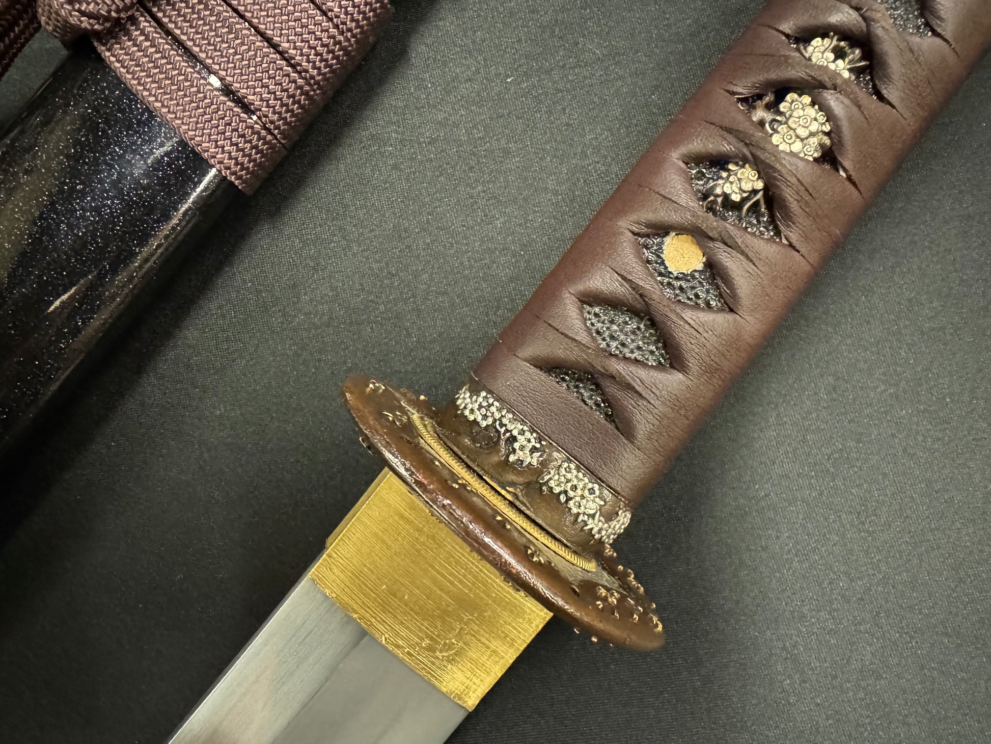 From Cloudhammer Steelworks comes a beast of a sword. The Titan Series has landed at RVA Katana! Featuring a whopping 84 cm (33 in) blade that is 40 mm wide (1.5 in) and forged from Japanese SX105v tool steel, these are truly monster wide cutters! The Titan series all feature Cloudhammer's premium leather handle wrap, new furniture designs, and gorgeous black scabbards with flake under clear lacquer. The blade is differentially hardened, showcasing a beautiful natural Hamon temper line. SX105v tool steel is renown for having excellent edge retention and is designed for cutting both hard and soft targets. If you're looking for a monster cutter, the Titan Series is for you!