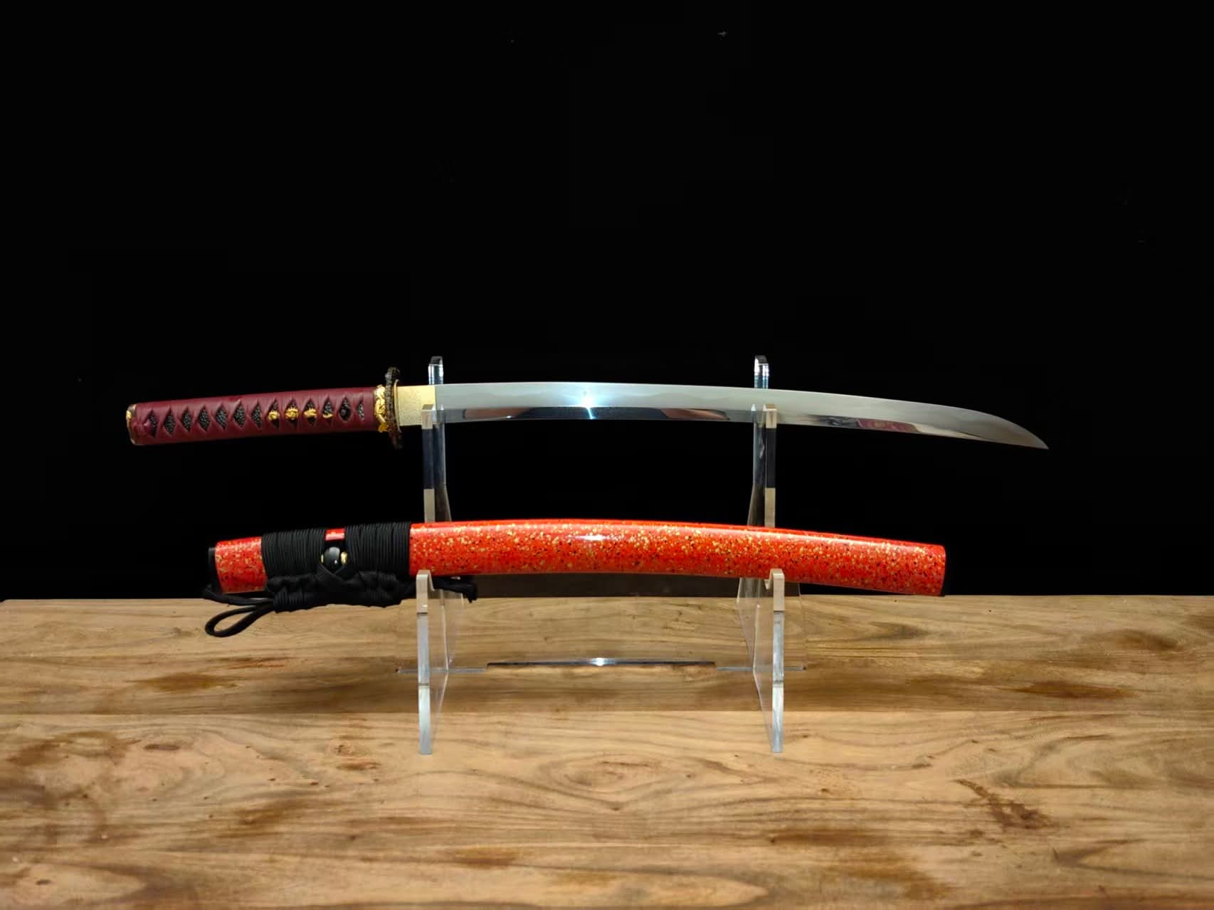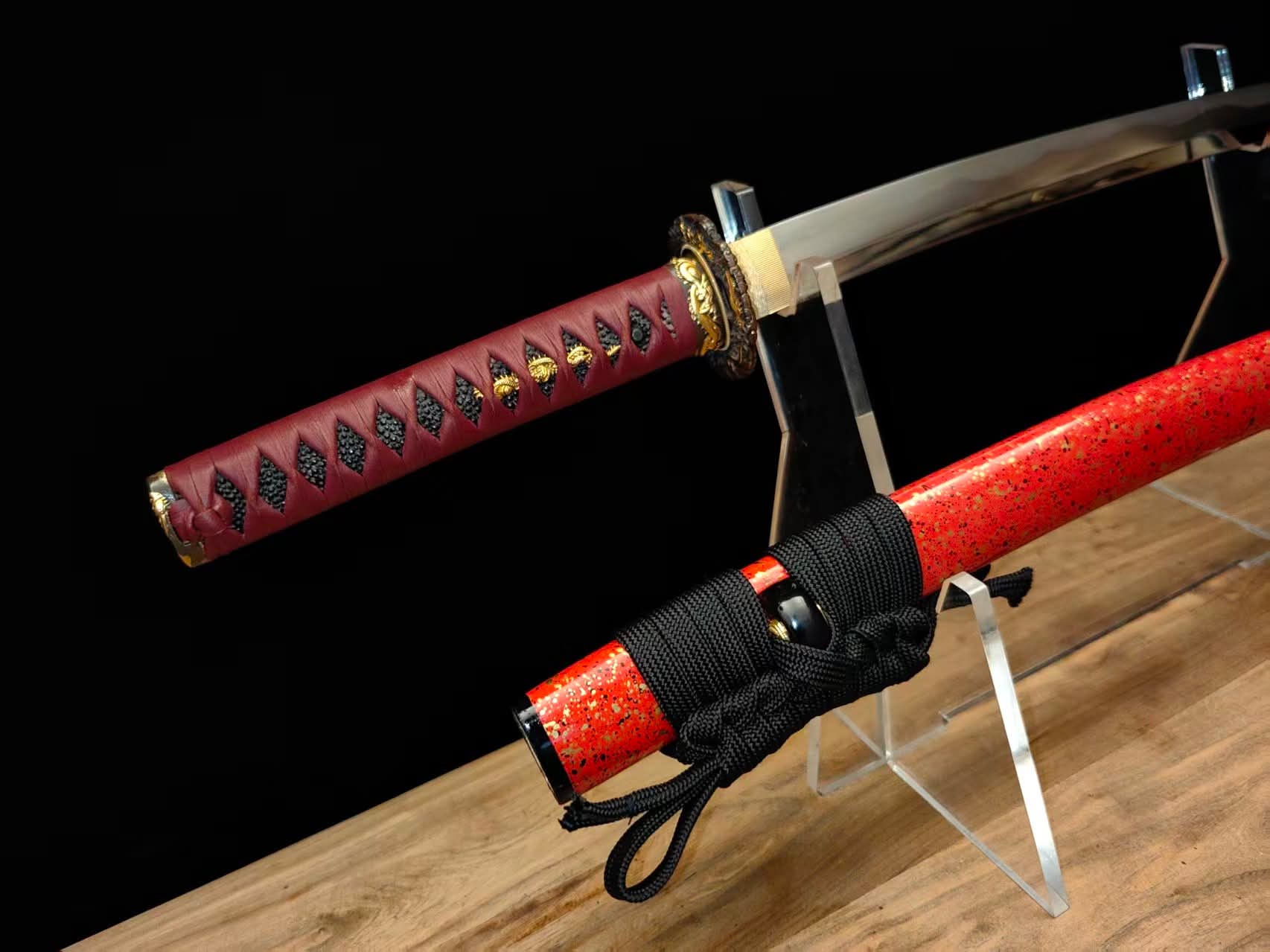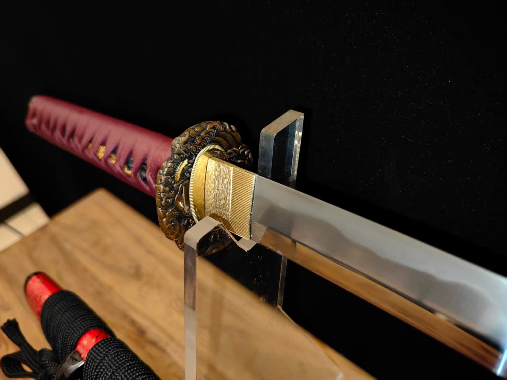 Made of W2 cable steel and polished to bring out alloy banding, the Bloody Dragon is a red leather variant of the Daunting Dragon Osoraku wakizashi.