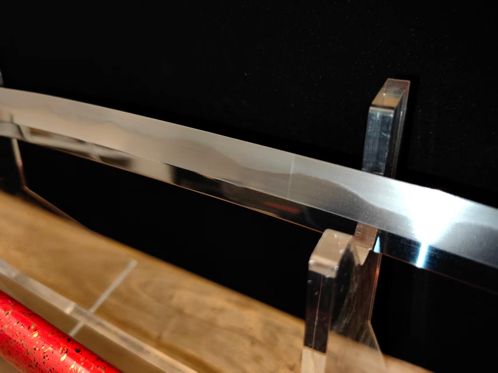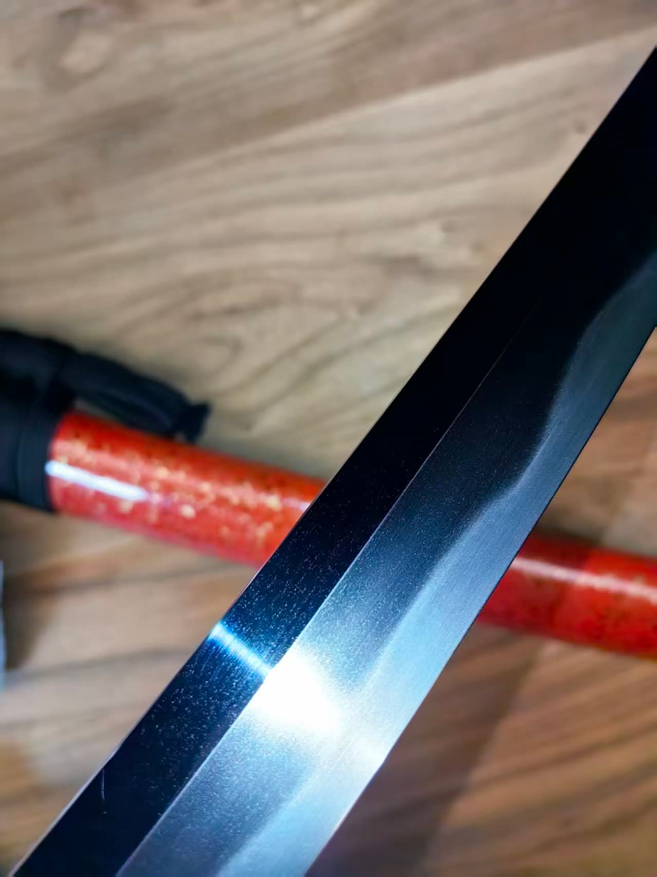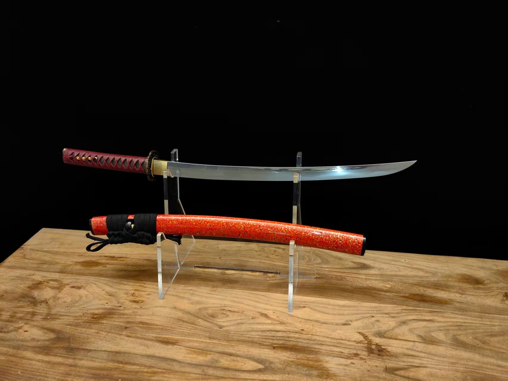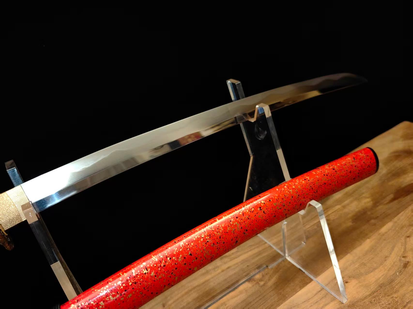 Made of W2 cable steel and polished to bring out alloy banding, the Bloody Dragon is a red leather variant of the Daunting Dragon Osoraku wakizashi.