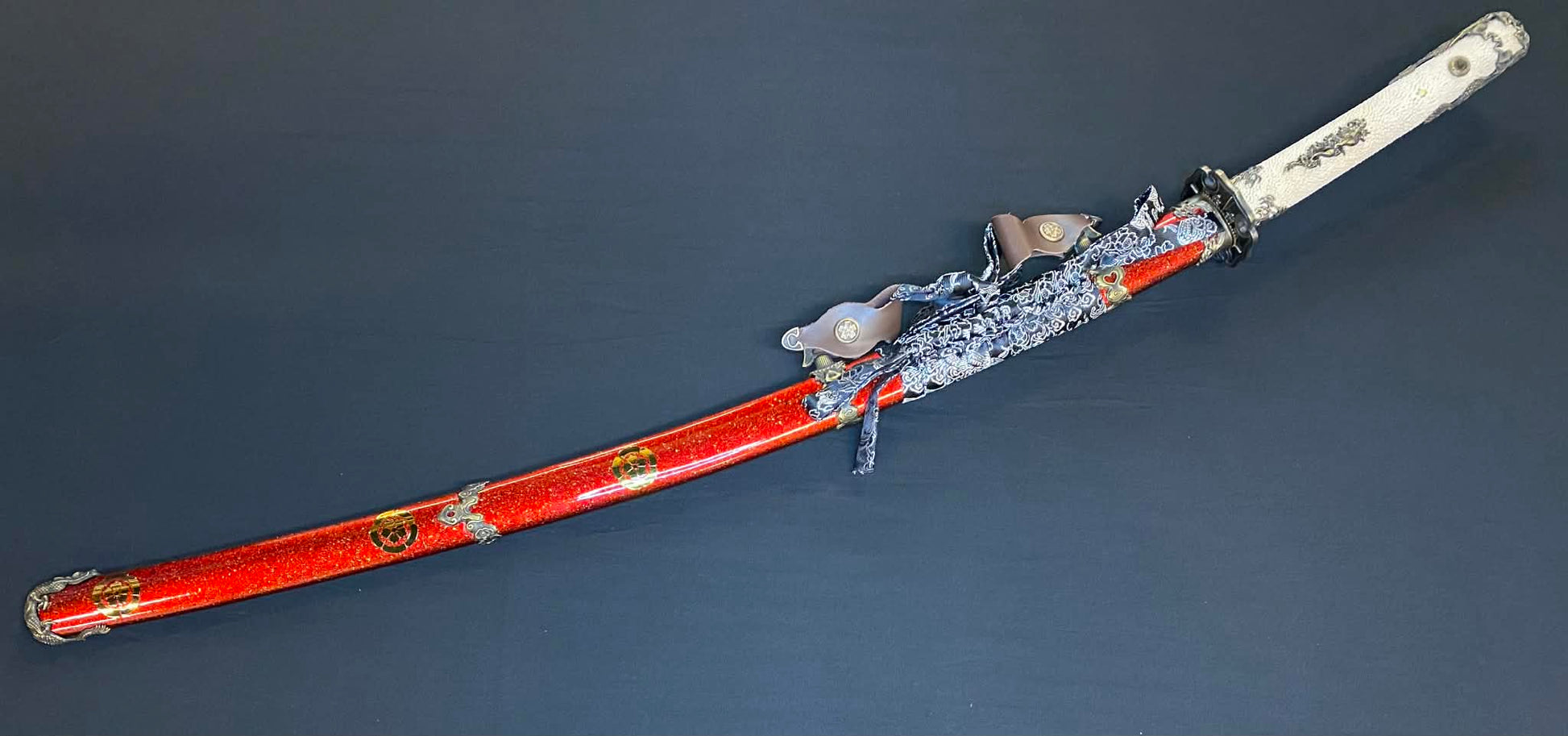 Dragonspring's modern take includes a meticulously heat-treated hitatsura hamon and triangle termination bohi on the blade, and the water dragon tachi fittings, it is sure to impress.