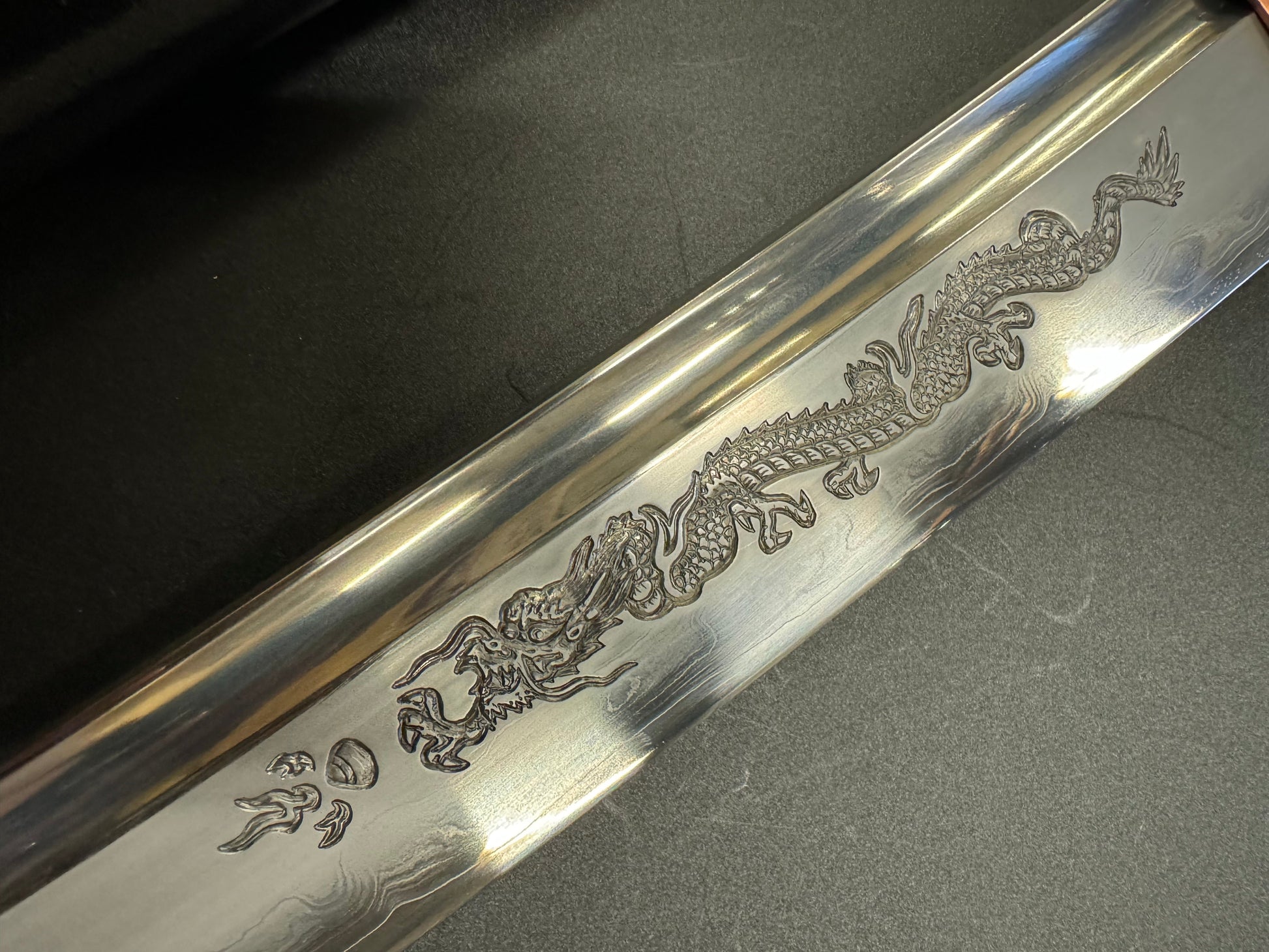 From Legacy Blades comes something quite unique and rare - custom-made Osoraku Wakizashi mounted in classic Aikuchi Koshirae. An Aikuchi-style mount is one that does not feature a Tsuba. The style of Osoraku is a type of Zukuri whereby the Kissaki is more than half of the length of the entire blade. The blade is fashioned in the Honsanmai tradition, a taco shell-like method of forging the combines the lamination of a 1095 steel for the edge which results in higher edge retention. The sides are made from folded steel to giver the blade a beautiful Hada. The blade is then clay-tempered and given a briliant Hazuya polish, which highlights the natural Hamon. The blade has a detailed, hand-engraved dragon Horimono. The hourglass-shaped Tsuka core is made from white hardwood and full wrapped with authentic black lacquered ray skin. The Habaki is made from pure copper and features a Kanji engraving while the Fuchi and Kashira are made of blackened iron. The Saya is made from hardwood with a unique oar-shaped tip. It is finished off with real buffalo horn Koiguchi, Kurigata, and Kojiri reinforcement. A Kaeritsuno hook made from buffalo horn is also part of the overall classical design, making this sword a unique part of any collection.