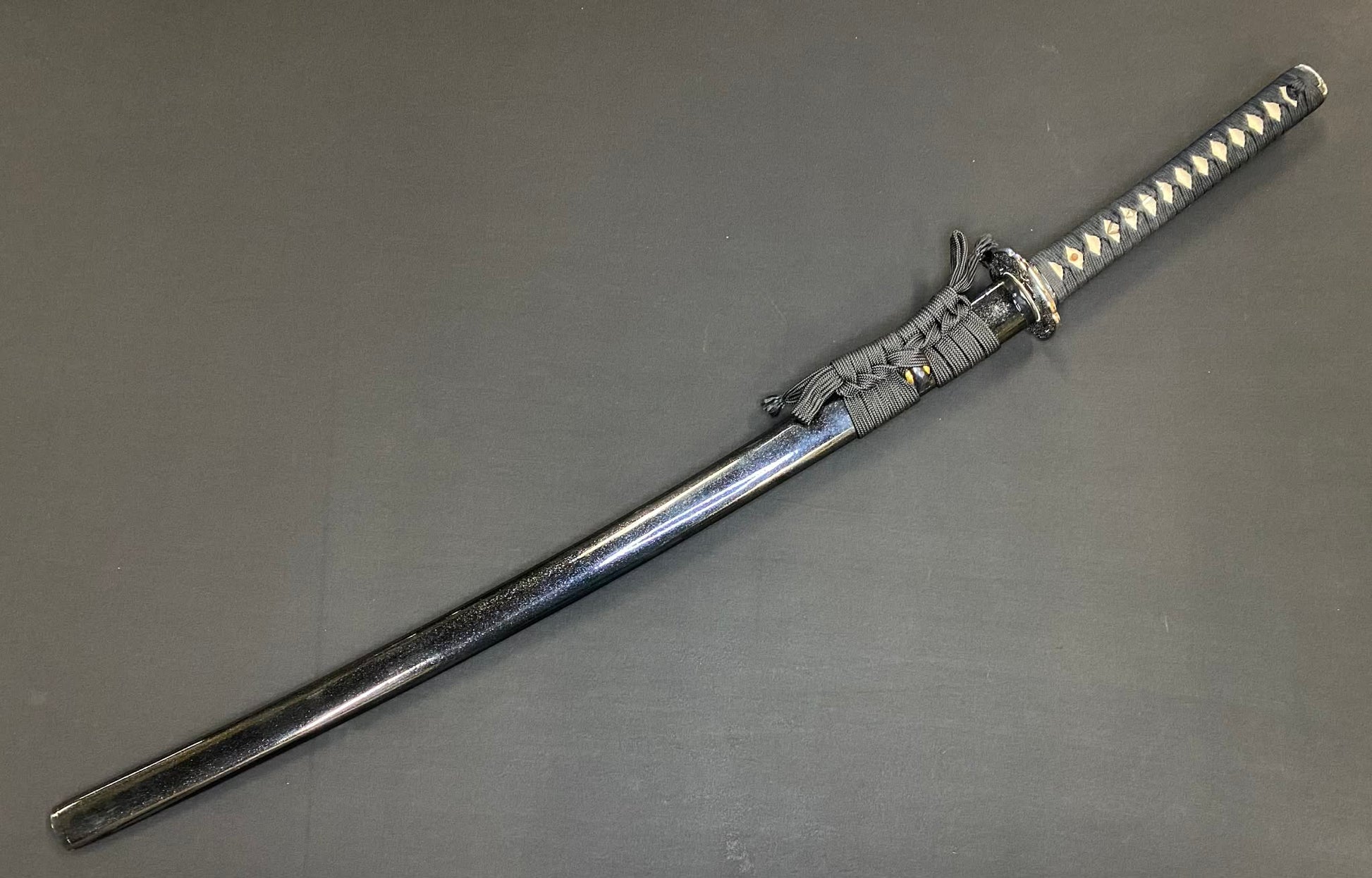 Comes with a sword bag and black lacquered stand in addition to brocade sword box.