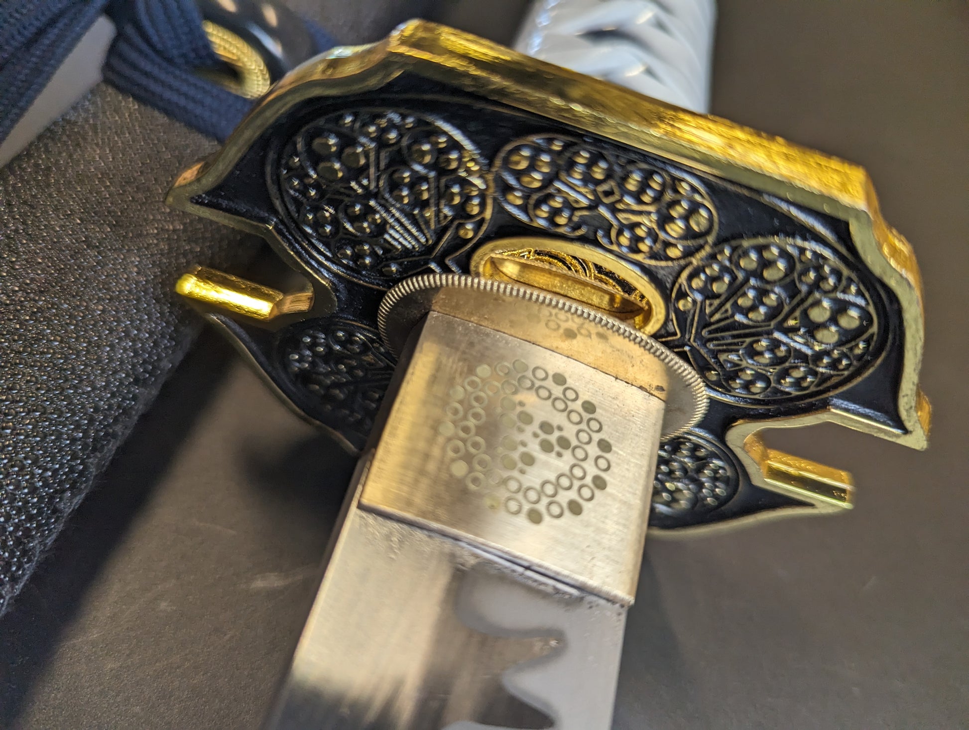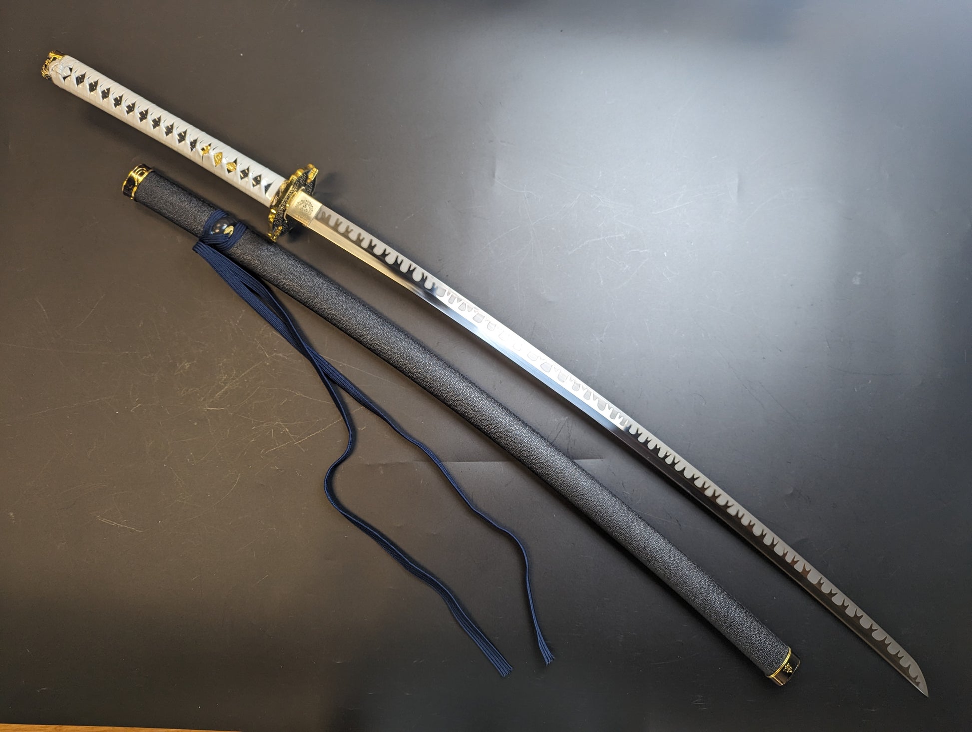 This odachi version is made of durable 65mn High Manganese steel with a beautiful laser etched hamon The parts are brass.