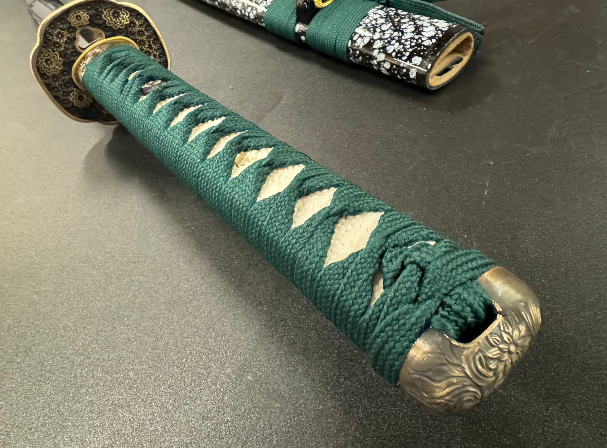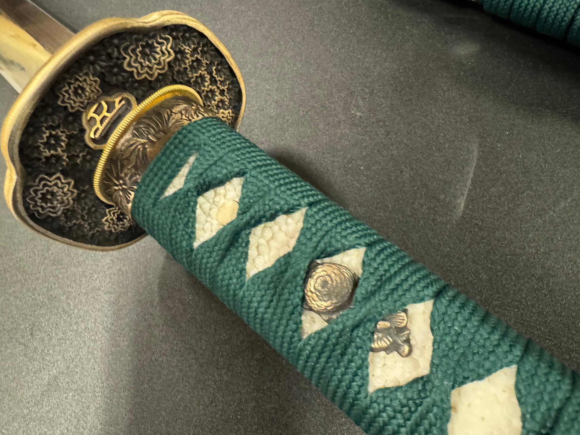 Handle: Hardwood with authentic white ray skin, synthetic silk green Ito