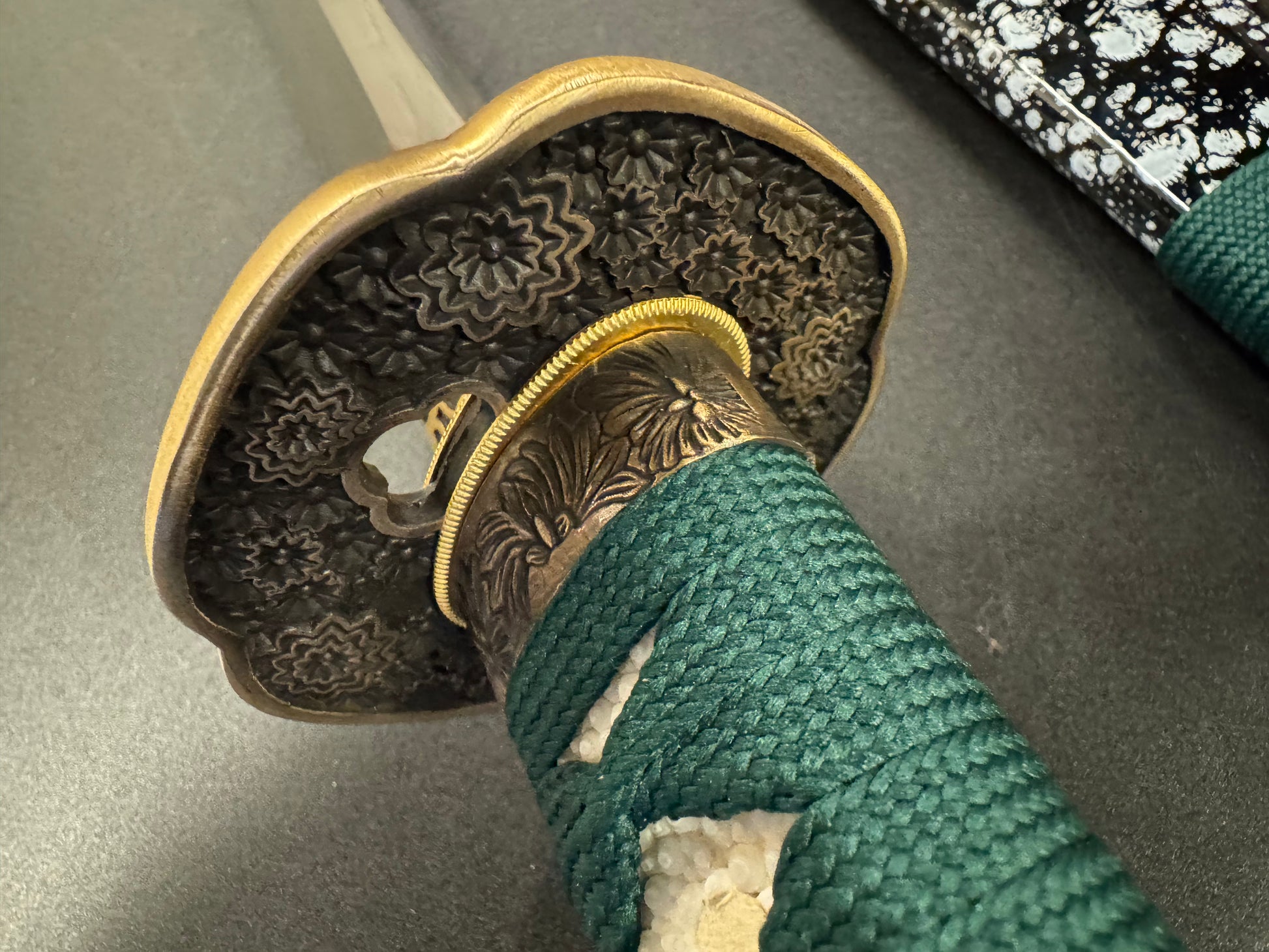 This upgraded model of the popular Thousand Chrysanthemum Katana features a highly polished T10 blade with higher end copper/brass fittings, authentic white ray skin and bolder Saya colors.