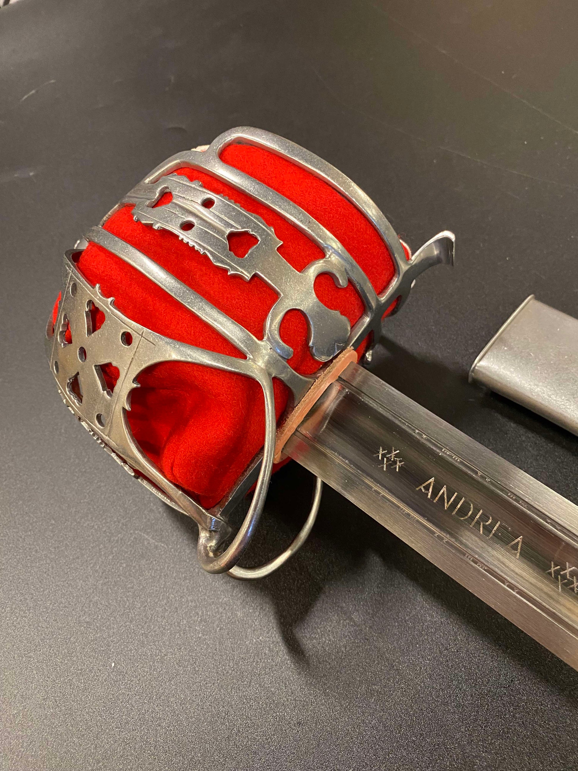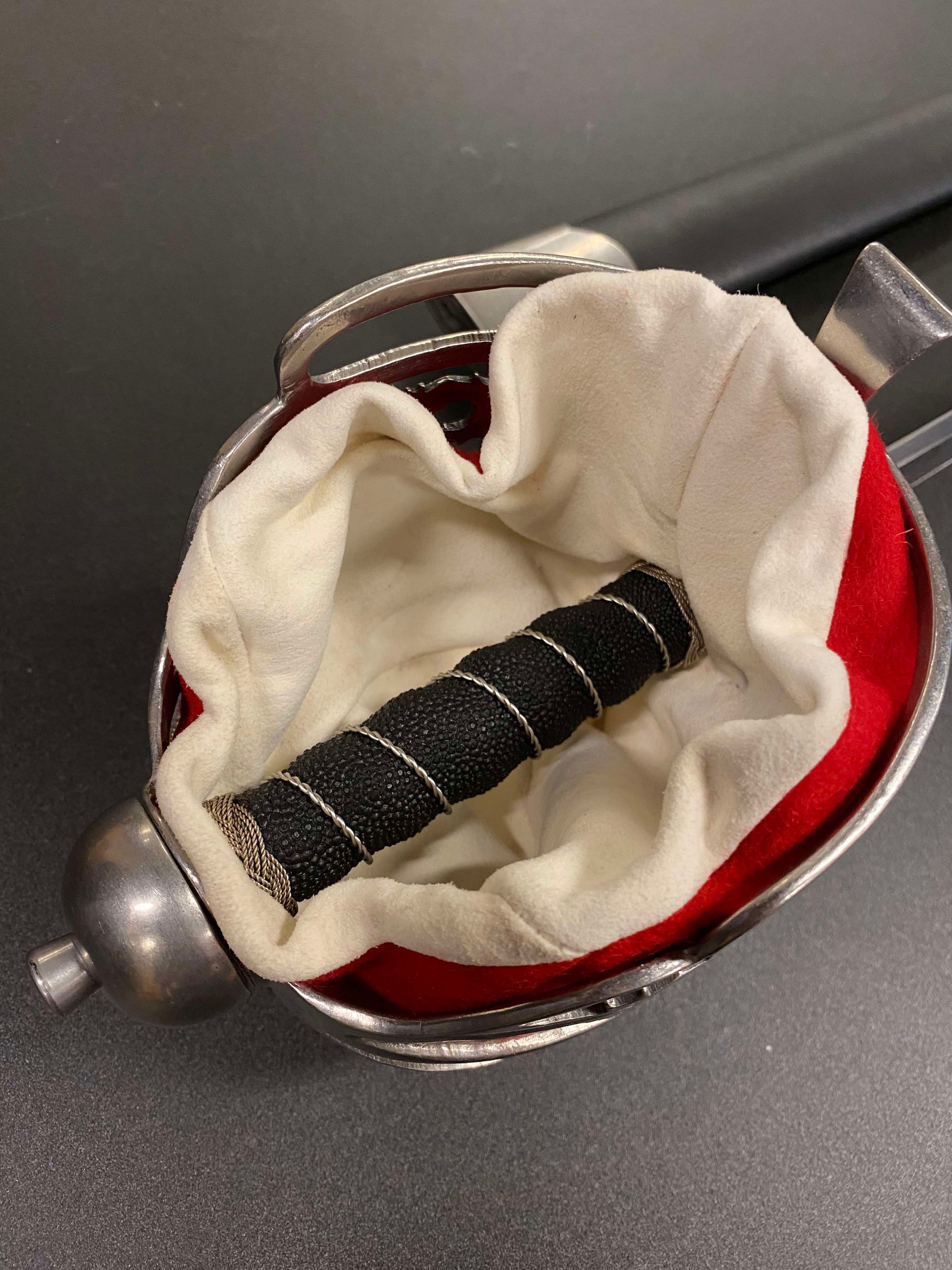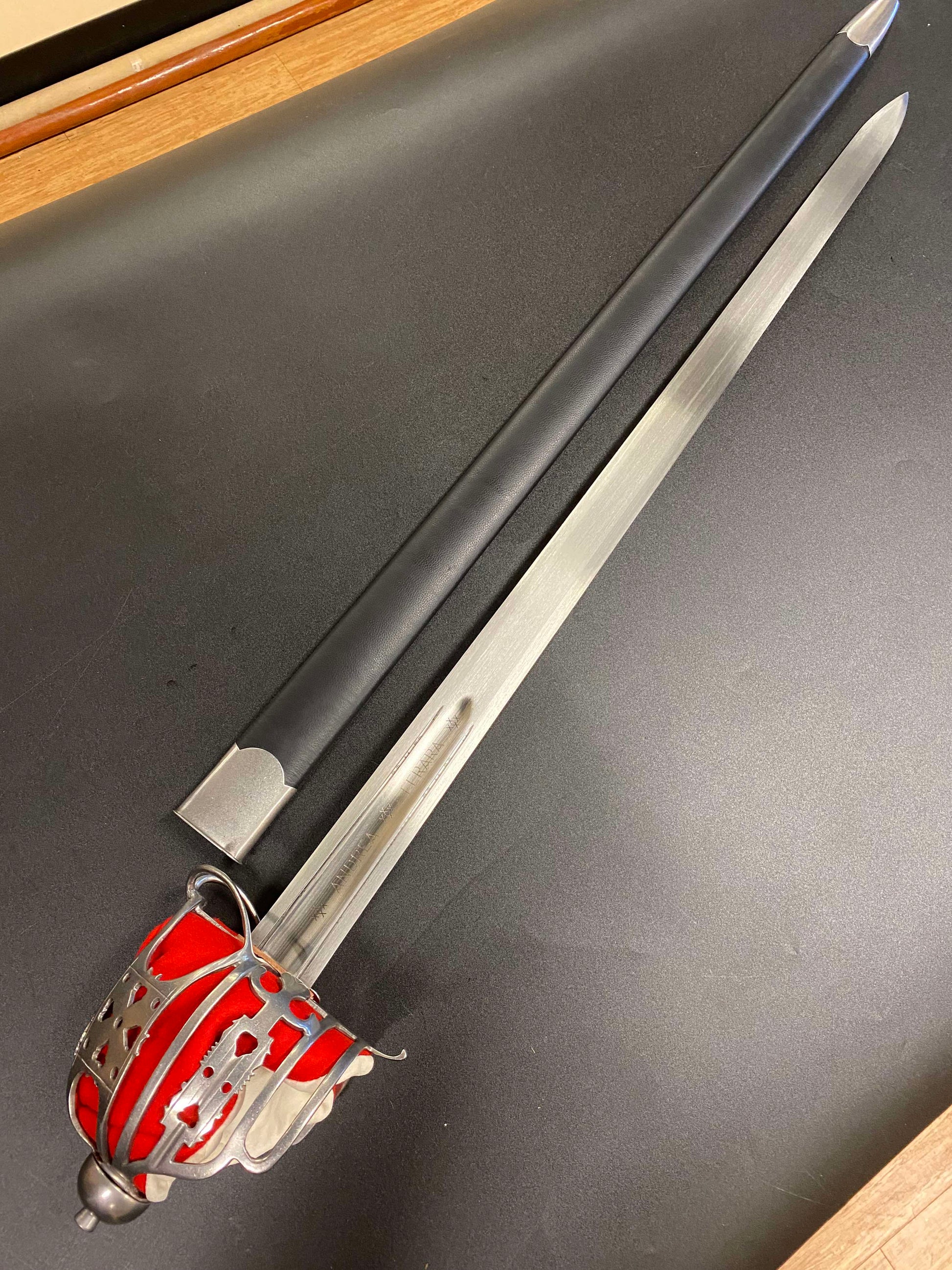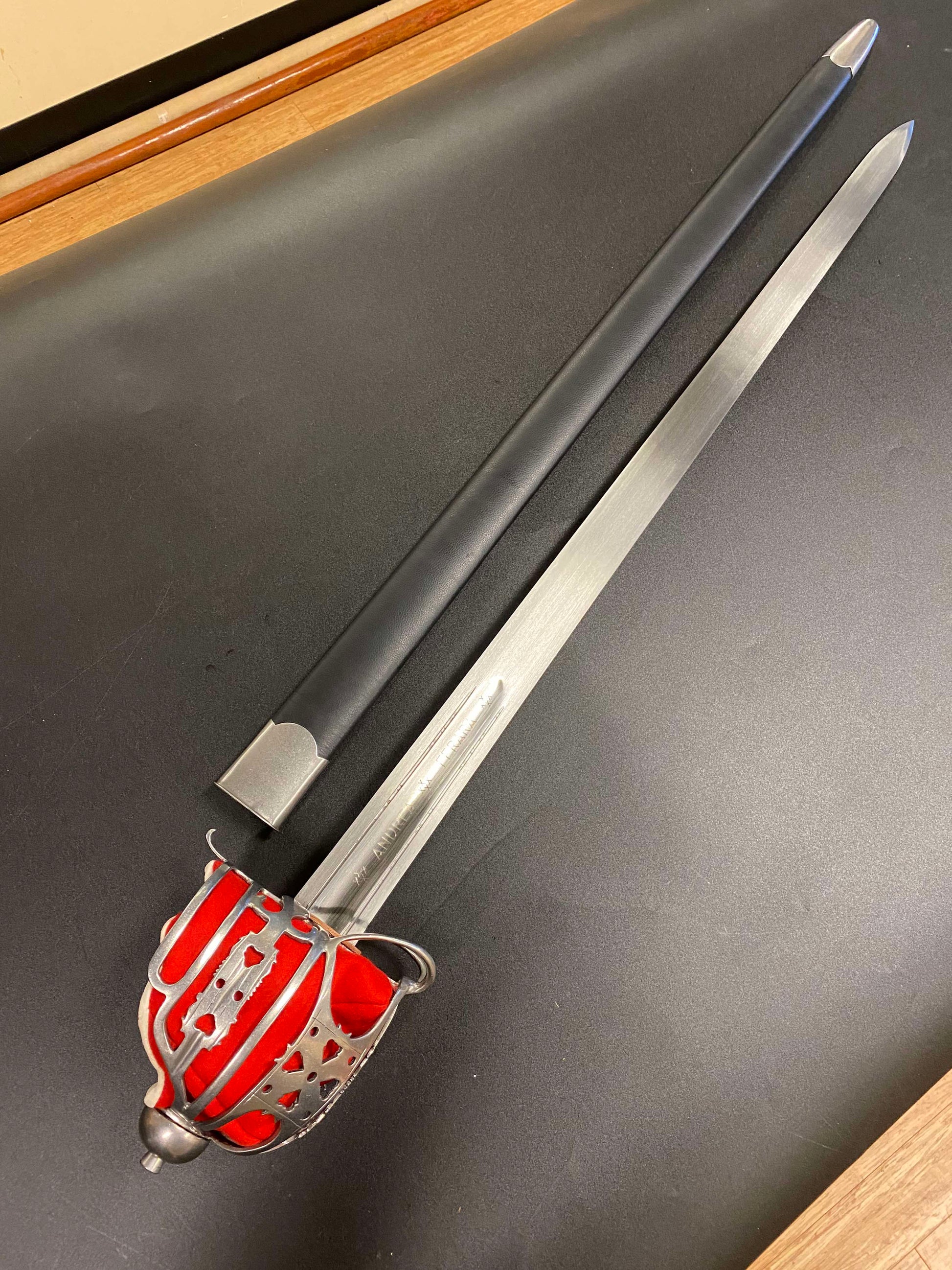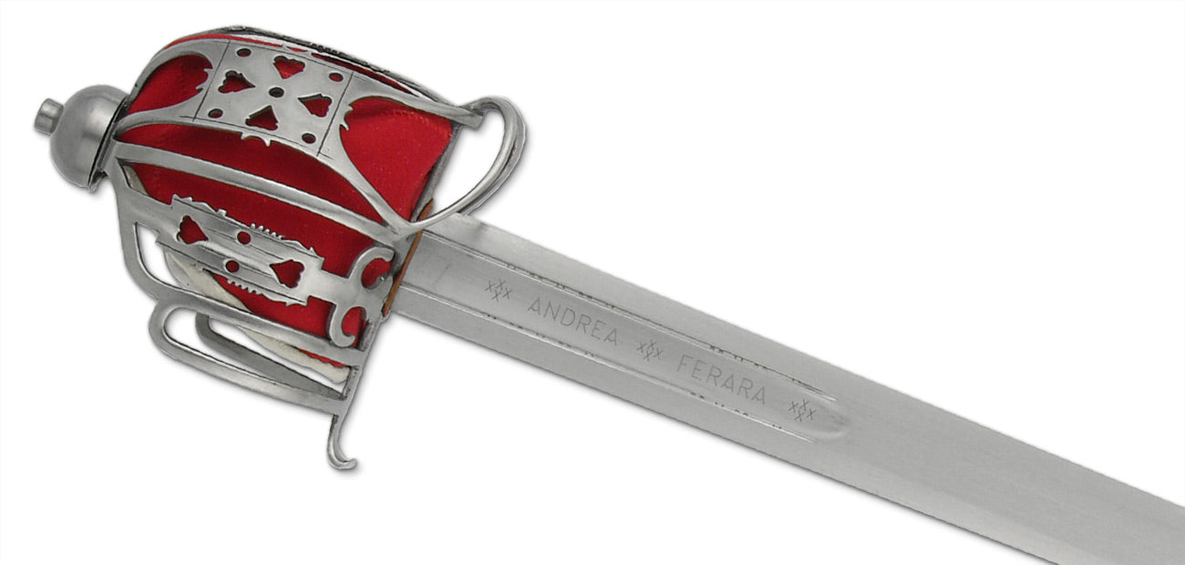 Although Basket-Hilt swords appeared throughout Britain from the mid-sixteenth century on, their association with the seventeenth and eighteenth century Scottish highlander has become legendary. Our Paul Chen Basket-Hilt Broadsword, replicated from an original in the collection of the Royal Armouries in England, carries a typical Glasgow-style hilt from the mid-18th century. It is likely that the blade of the original sword, marked “Andrea Ferara,” was made in Germany a century earlier and re-hilted as basket designs were refined. The hilt is crafted in stainless steel, to minimize maintenance, while the blade is forged in high-carbon steel. The grip is covered with wire-wrapped genuine rayskin and the basket liner, like the original, is crafted in fabric-covered sueded leather. The scabbard is leather-covered.