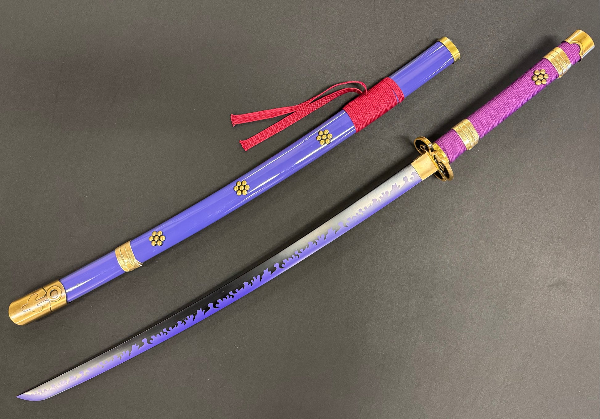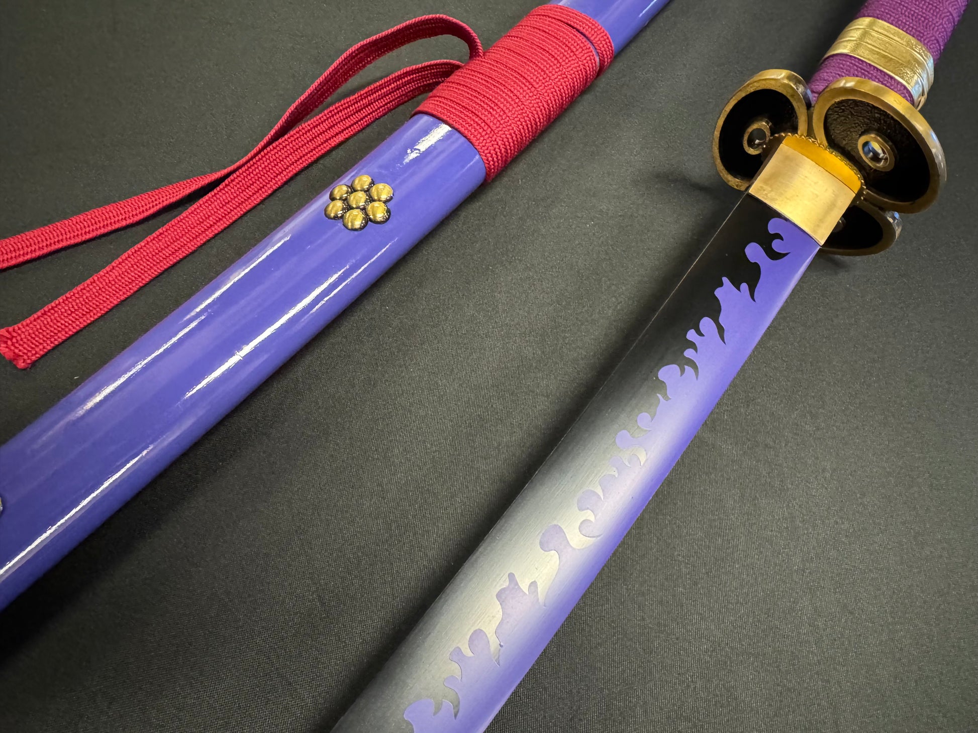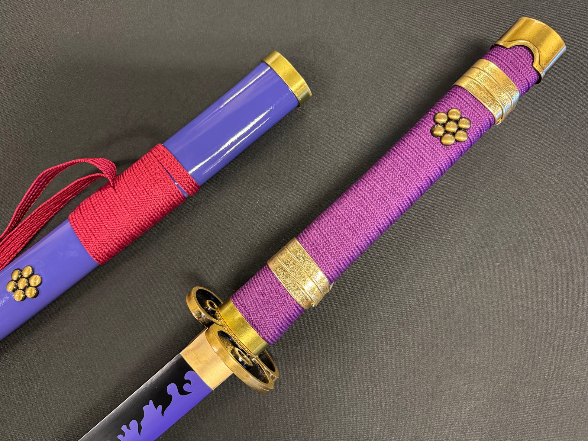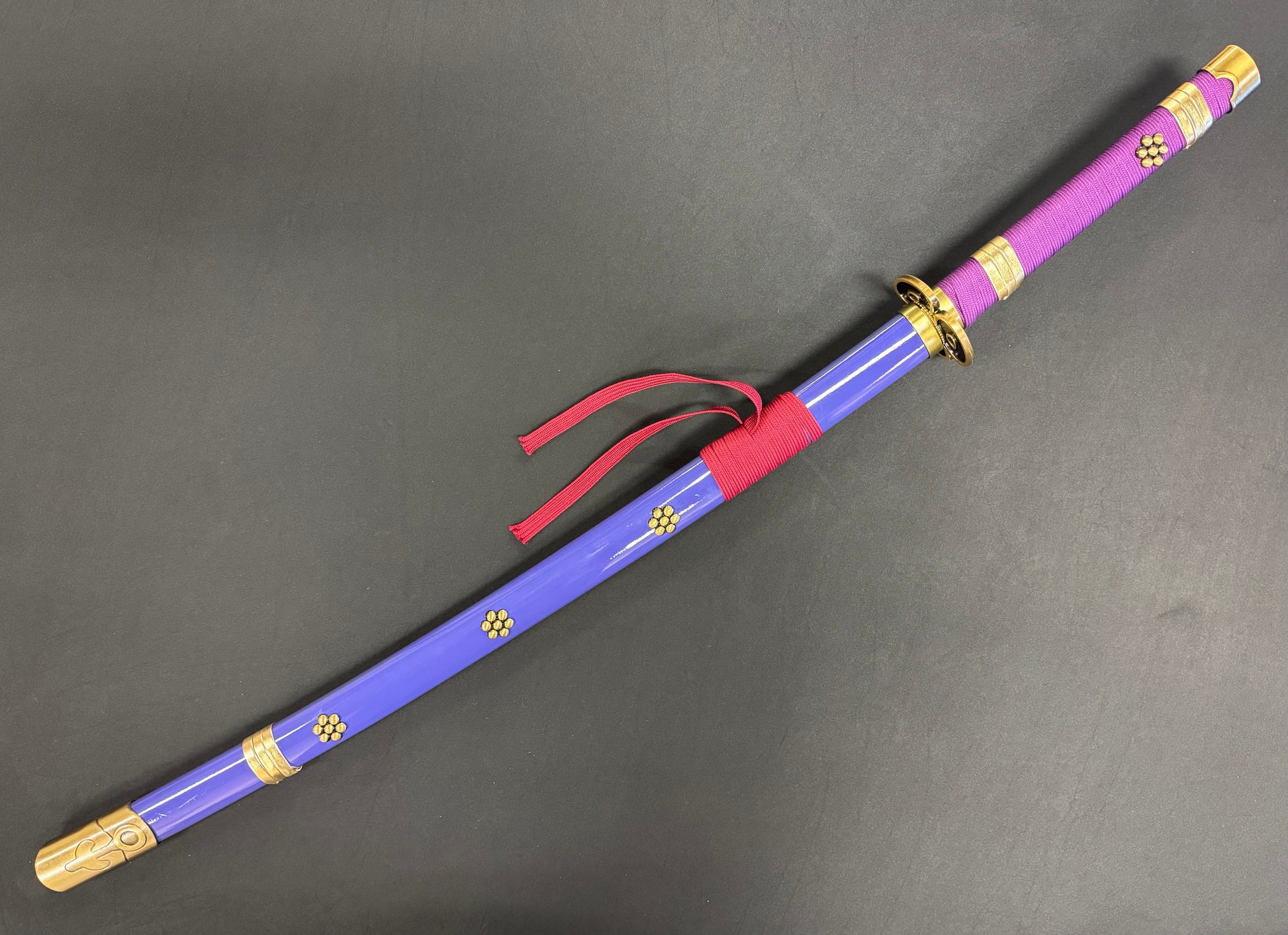 From the hit Anime series One Piece comes this well-crafted and forged Katana, the Enma! In the hit series, the Enma is one of the 21 Great Grade swords, carried by Roronoa Zoro as one of his three personal blades. Enma is seen to be a moderately curved Shobu Zukuri-style katana with a purple and gold color scheme, trefoil shaped Tsuba guard, and other accents faithful to the series. A must have for collectors! This is a fully functional Katana.