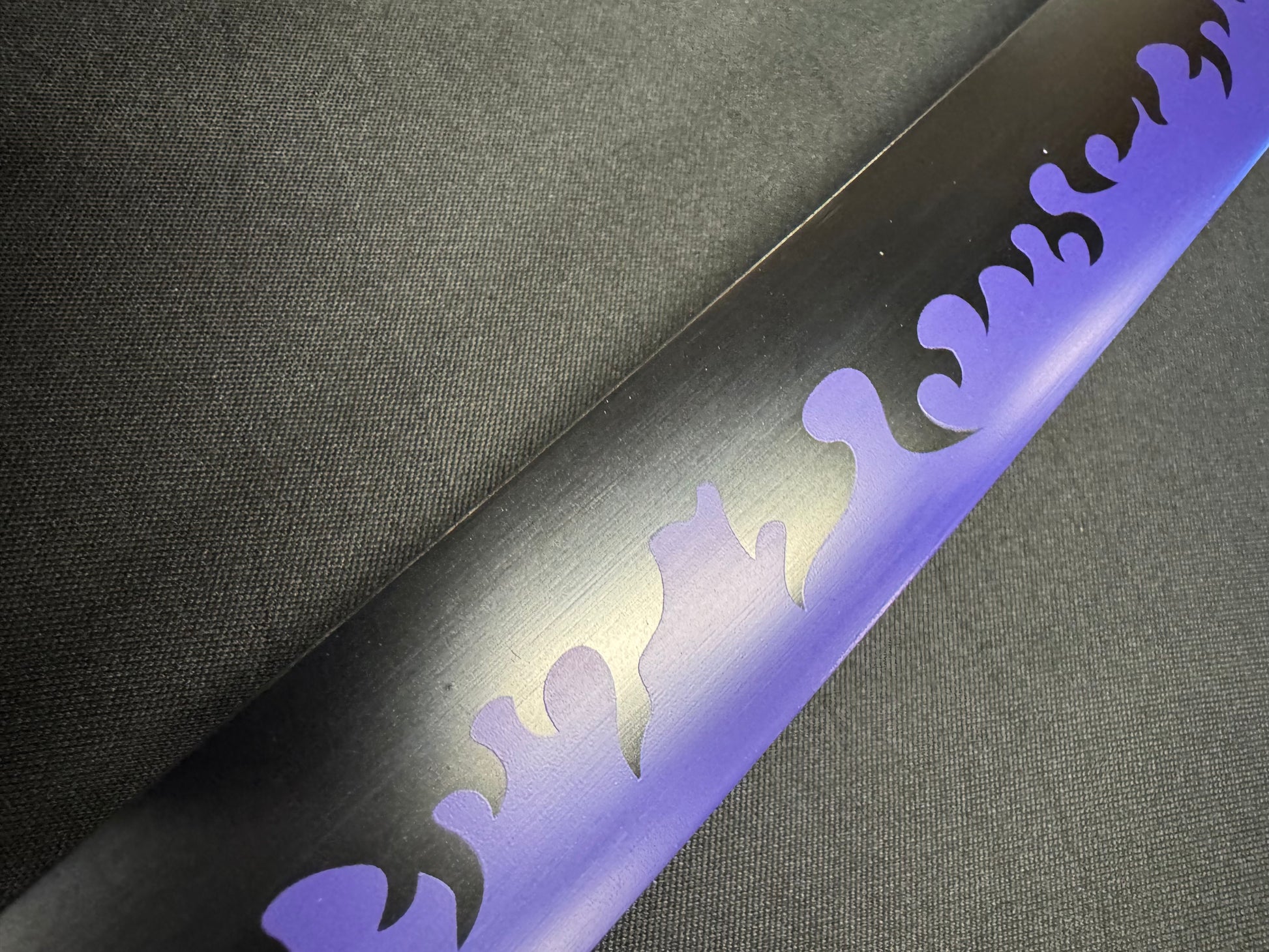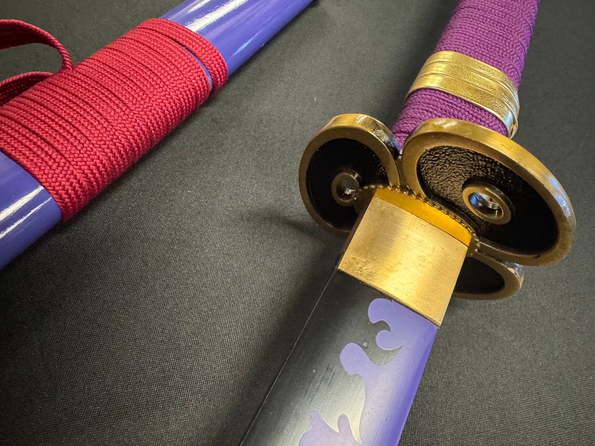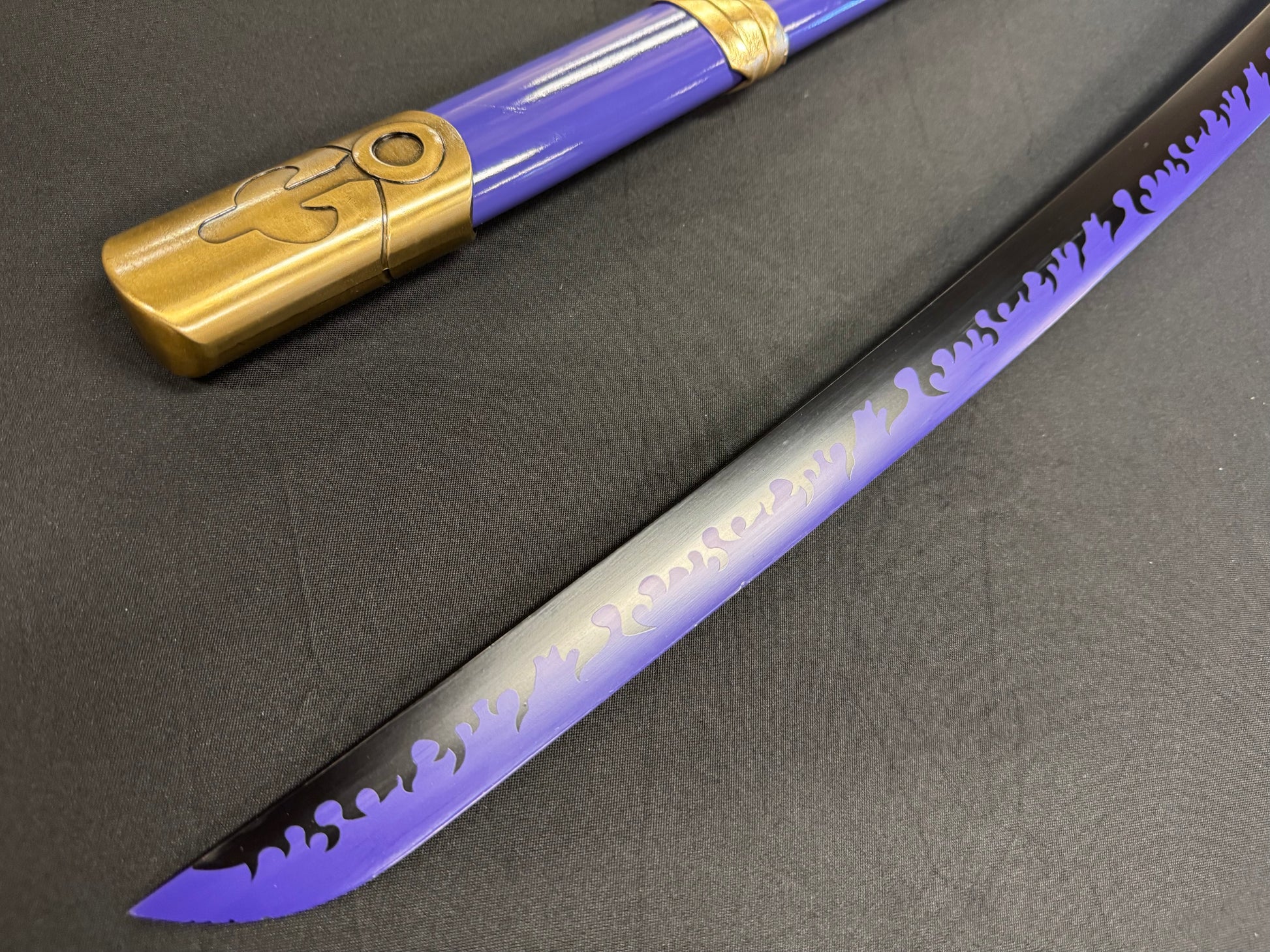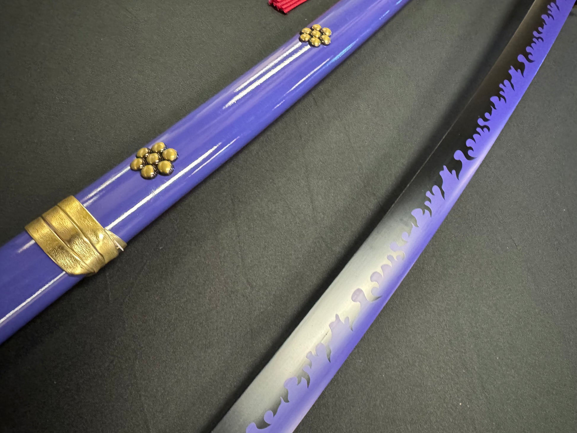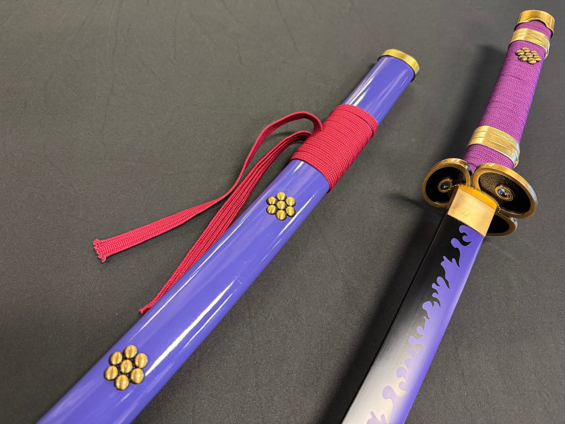 From the hit Anime series One Piece comes this well-crafted and forged Katana, the Enma! In the hit series, the Enma is one of the 21 Great Grade swords, carried by Roronoa Zoro as one of his three personal blades. Enma is seen to be a moderately curved Shobu Zukuri-style katana with a purple and gold color scheme, trefoil shaped Tsuba guard, and other accents faithful to the series. A must have for collectors! This is a fully functional Katana.