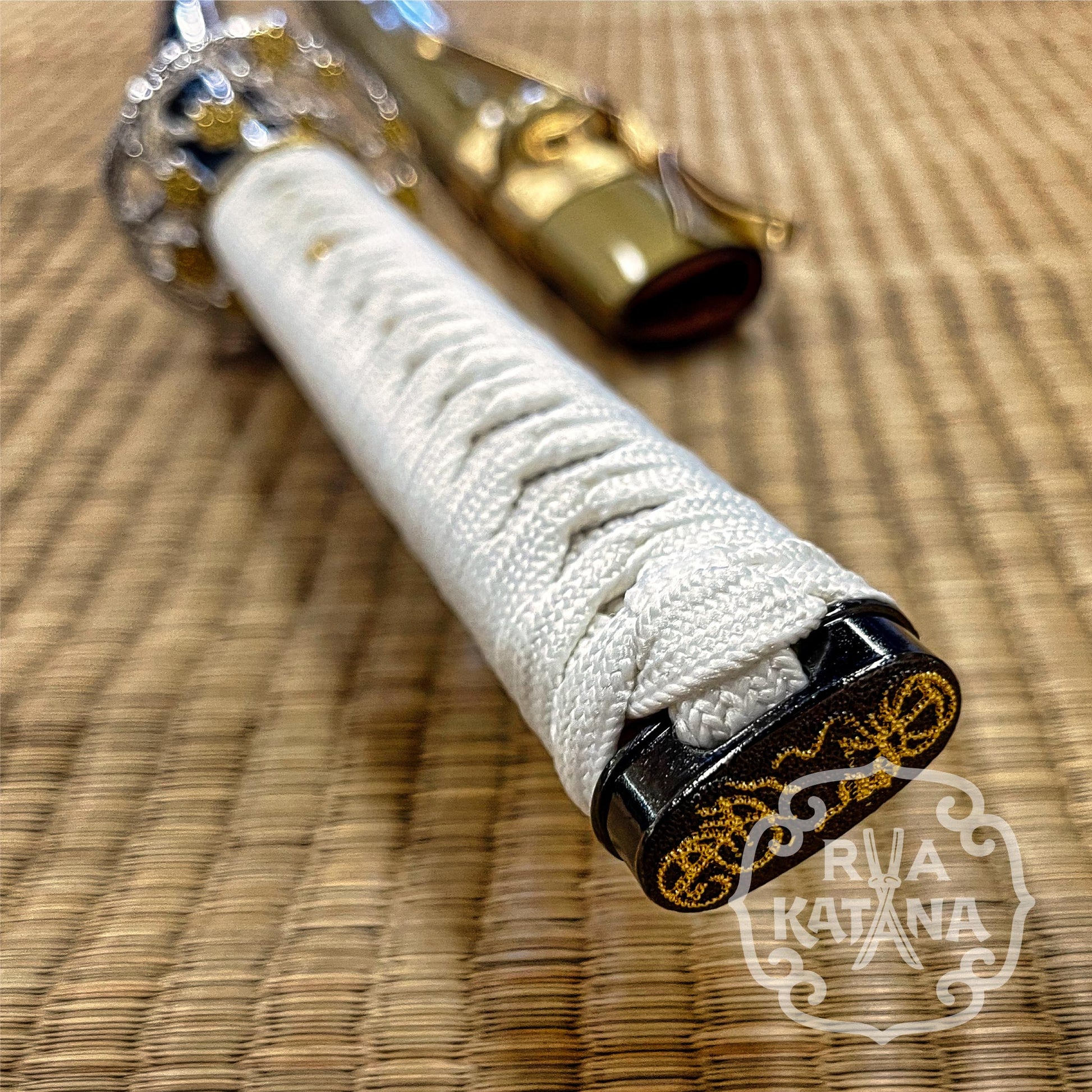Purity, sincerity, innocence, fortune, and prosperity. The colors that adorn the Gold Plum instill these principles, and much more. It features a gorgeous handle wrapped in white cotton, adorned with golden dragon Menuki and finished off with a matching themed Fuchi and Kashira in brilliant two-color finish. The Tsuba compliments the overall design with a silver and gold finish with plum flowers. The gold lacquered Saya features a Sageo