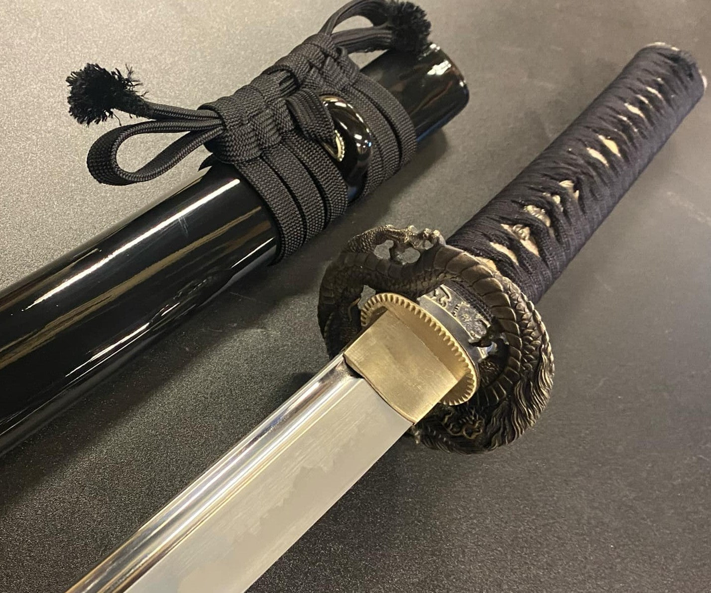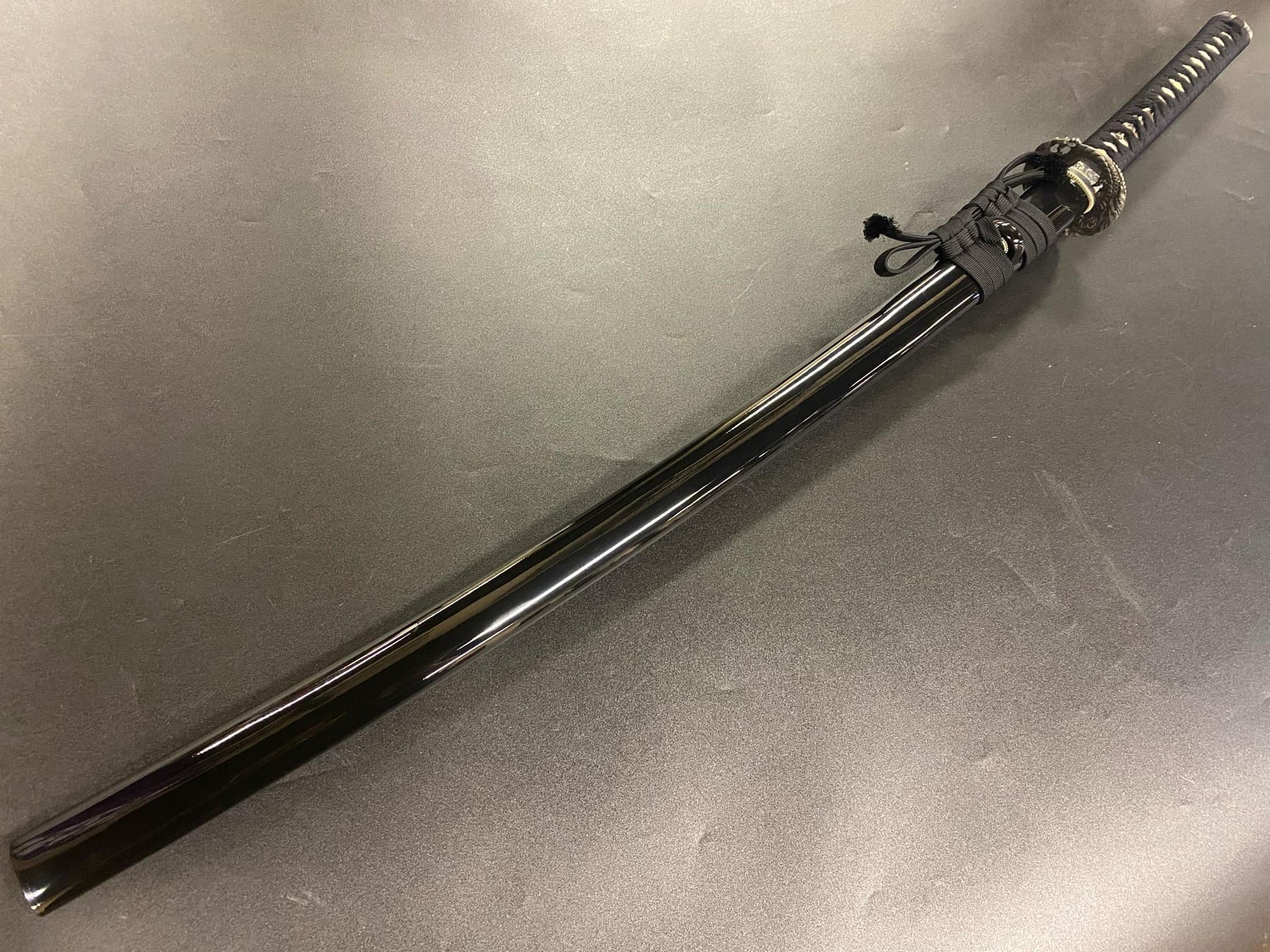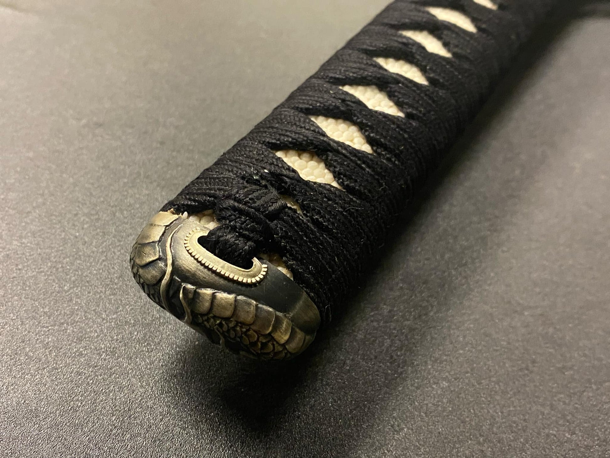 The 39 ¼” forged T10 blade features a wispy hamon and bo-hi. The silver Ryujin themed tsuba, fuchi and kashira are contrasted by the lacquered black saya, sageo and tsuka-ito over white same. This black and silver motif will be produced in limited quantities.