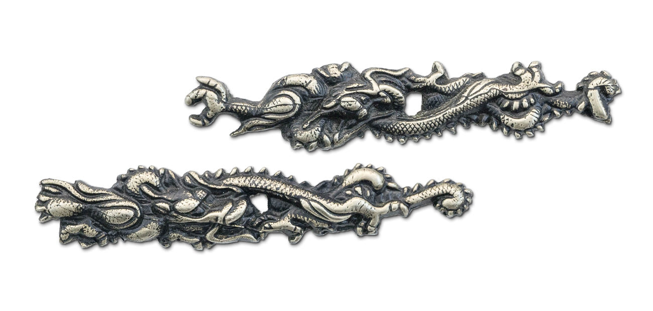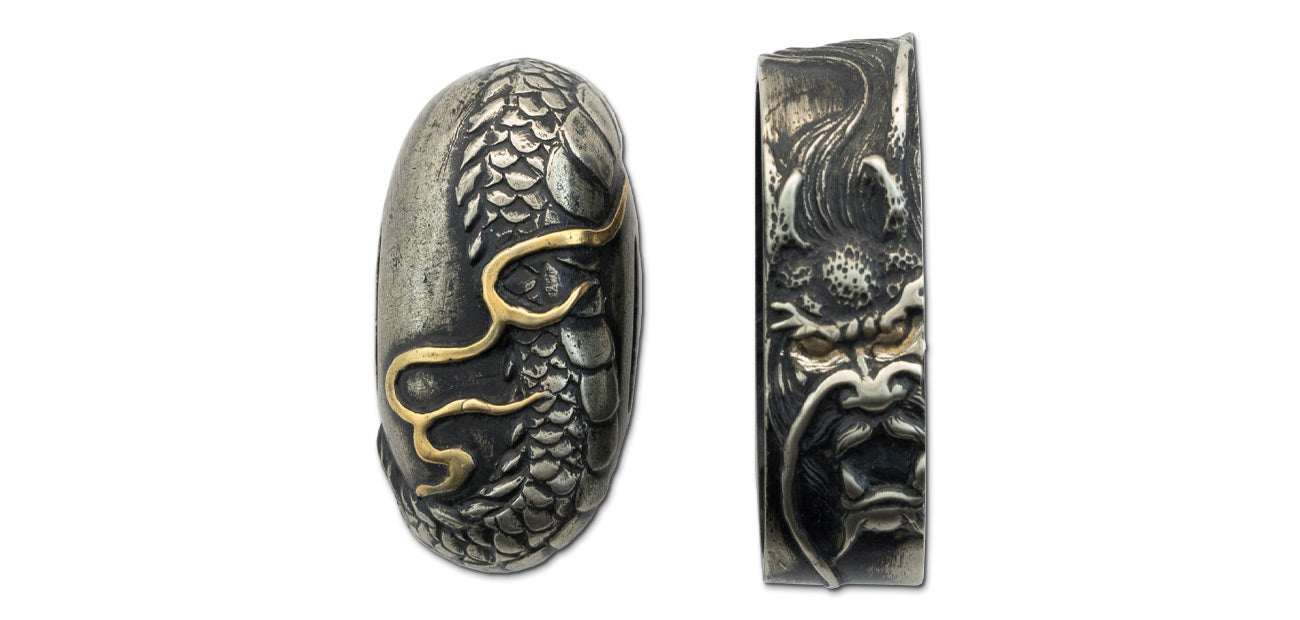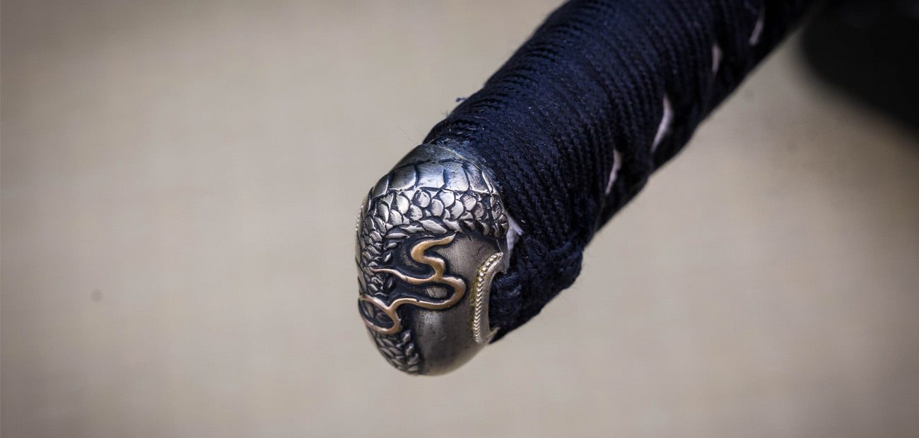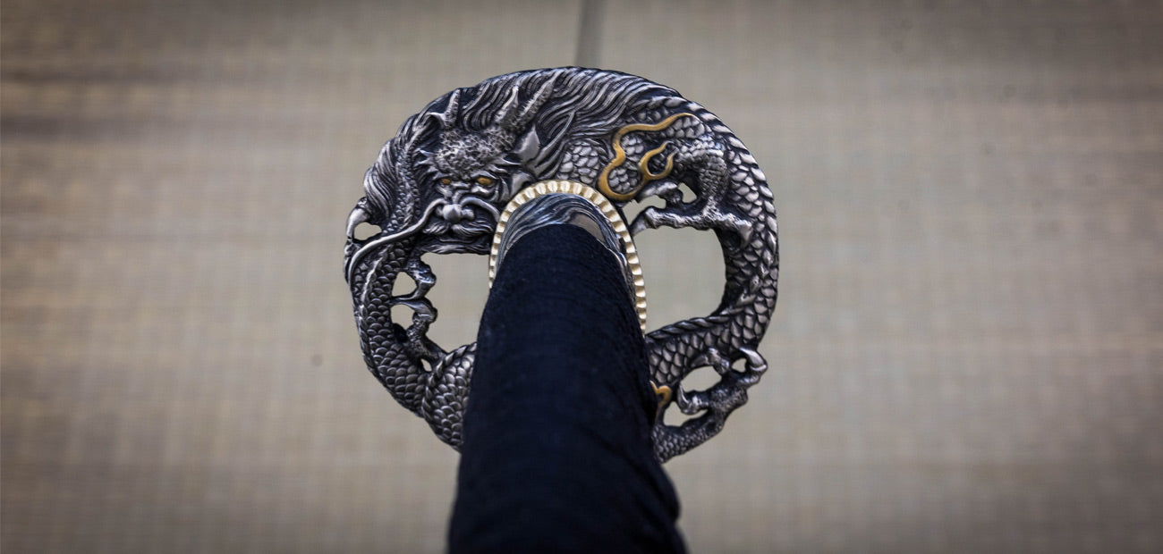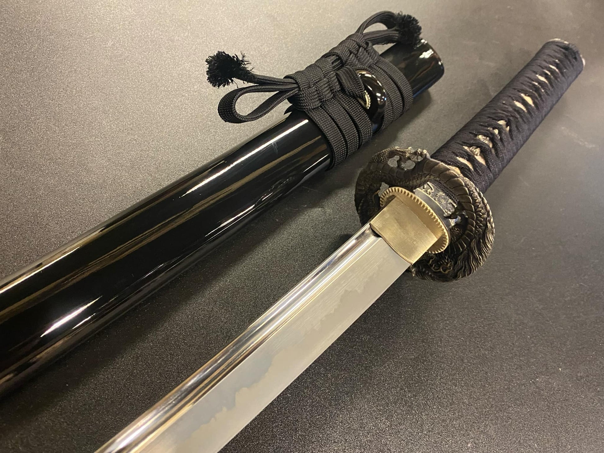 The 39 ¼” forged T10 blade features a wispy hamon and bo-hi. The silver Ryujin themed tsuba, fuchi and kashira are contrasted by the lacquered black saya, sageo and tsuka-ito over white same. This black and silver motif will be produced in limited quantities.