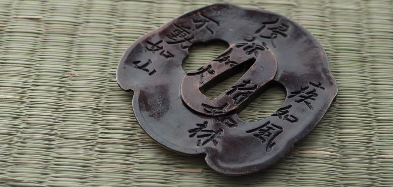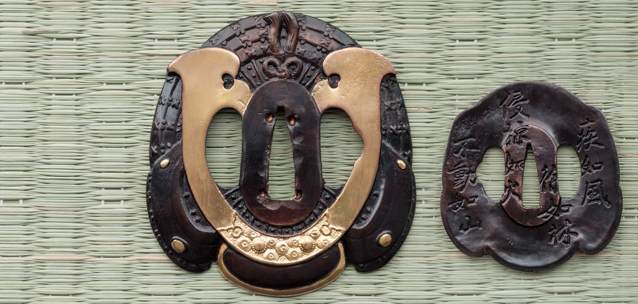 Most prominent on the tsuba (guard) features the kabuto of Oda Nobunaga and on the fuchi-kashira (pommel) the kabuto of his most bitter rival, Takeda Shingen. The fuchi (collar) bears a war fan and battle flag to commemorate his victory in 1560 at Dengakuhazama where he raised his battle flags over the rise of a hill to fool Imagawa's forces to think he was encamped there, while he and a handful of men snuck around for a sneak attack which afterward changed the course of Japan’s history.