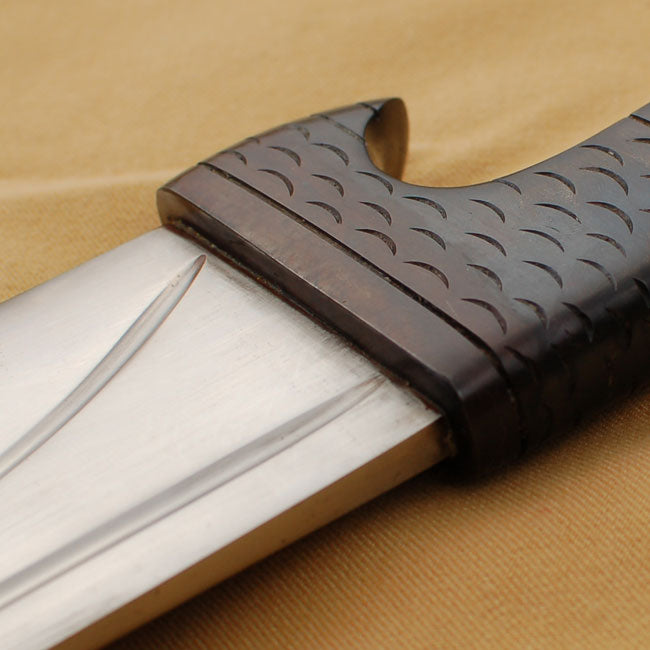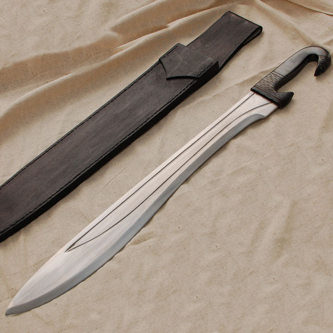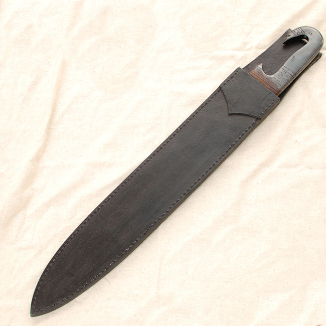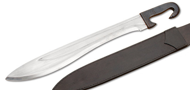 The Legacy Arms / Generation 2 Falcata features a mild steel blackened grip and a single edge blade of 5160 steel that is curved and broader towards the point. Used by the Celt-Iberians of Roman times, it was described as one of the most devastating swords the Romans ever faced. The Falcata comes with a full length top grain black leather scabbard.