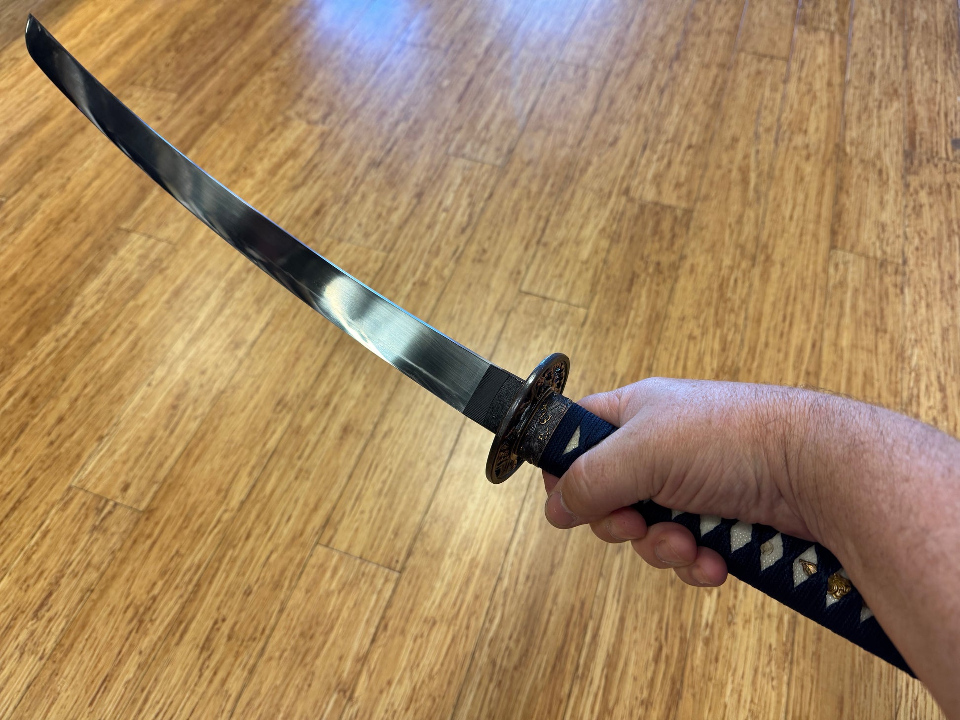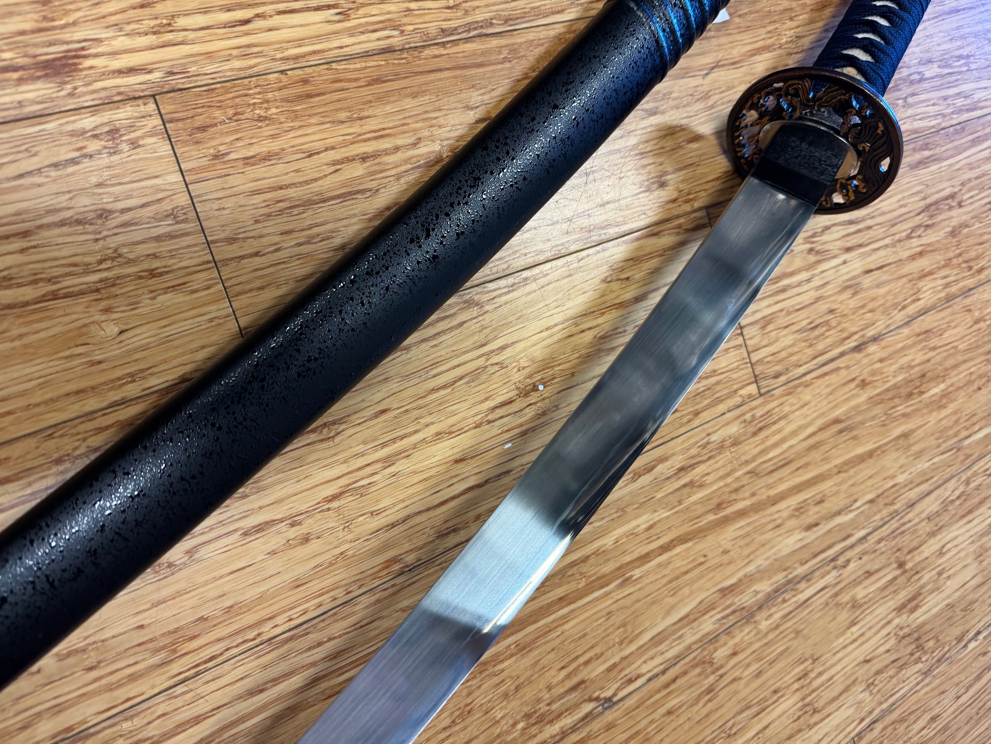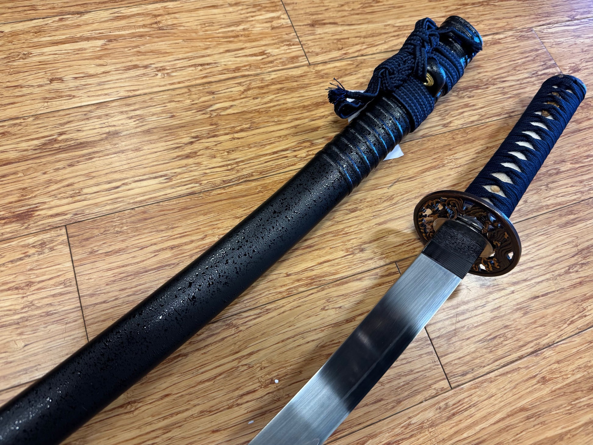 Handle material: Hardwood with genuine black ray skin, blue synthetic silk Ito.