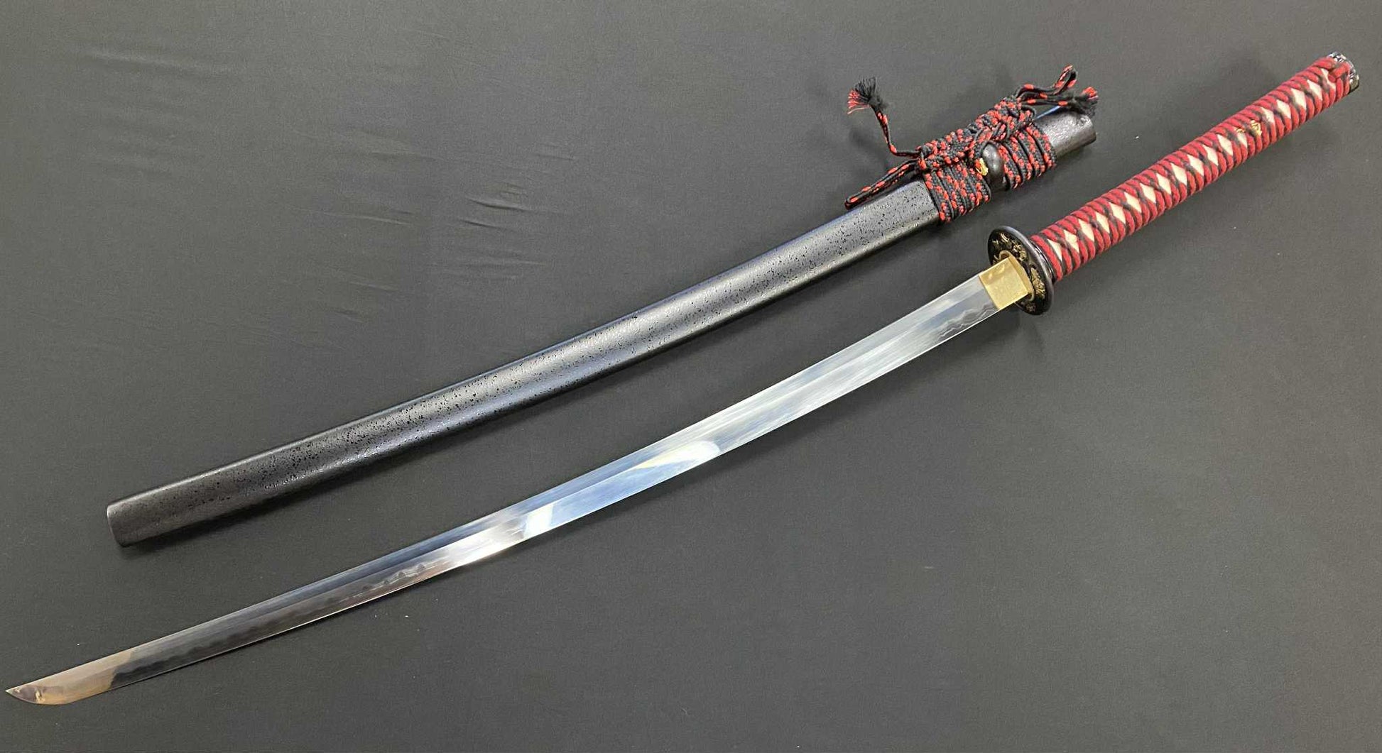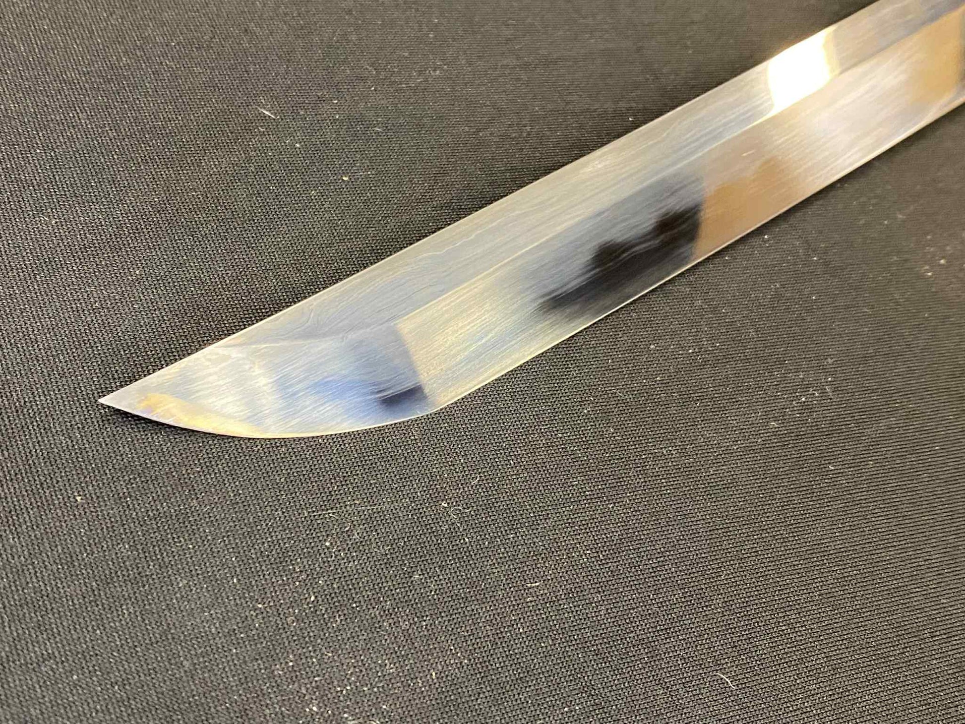 The edge is made of 1095 high carbon steel and the sides made of folded 1060 steel. The blade is differentially-hardened with a beautiful, natural hamon and hada. It has a bohi running from the habaki to the kissaki, making the blade lighter. The tsuka is made of hardwood with white, rayskin panels and wrapped with black, synthetic silk ito. The tsuba, fuchi, kashira and menuki are made of glossy, black, zinc alloys while the habaki and seppa are made of brass.