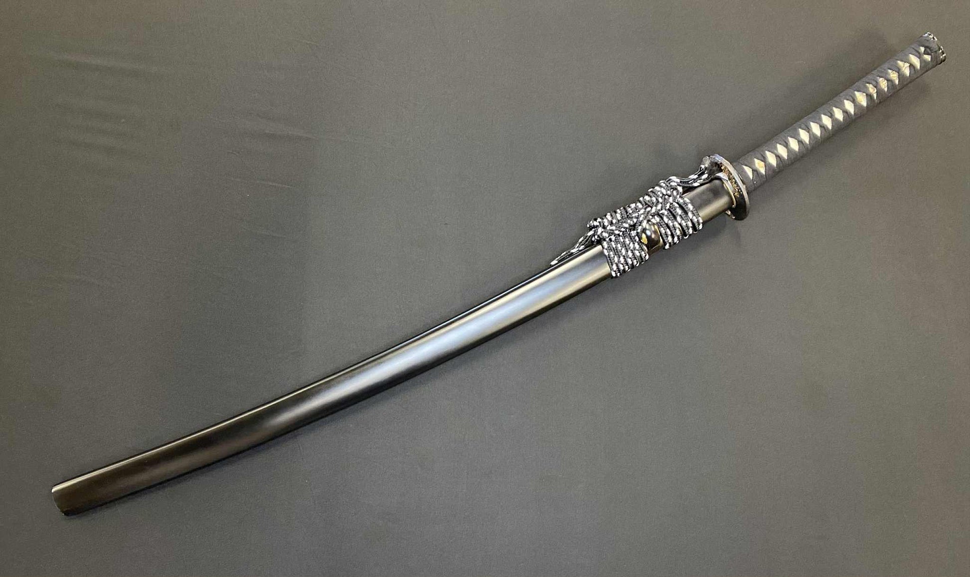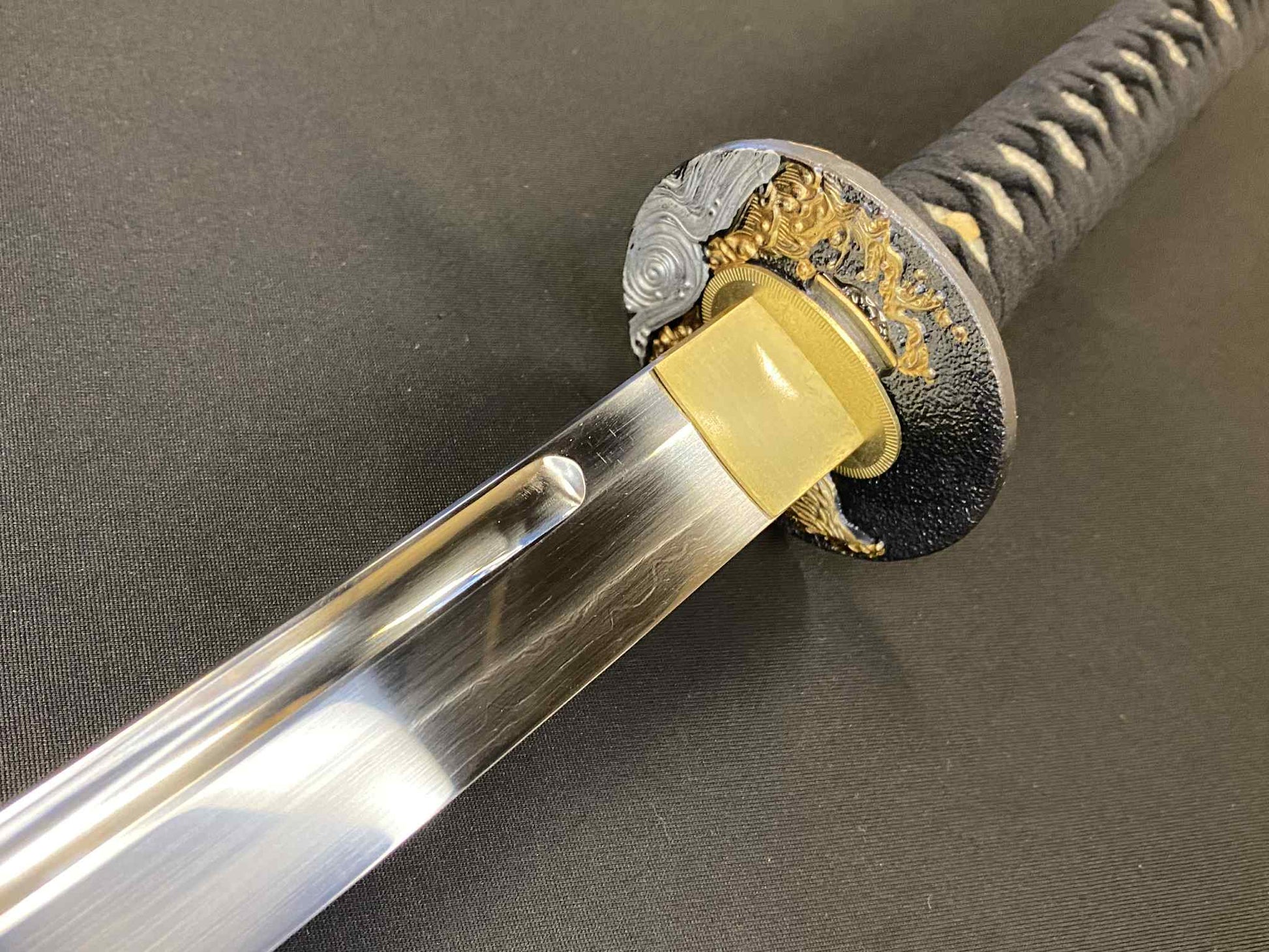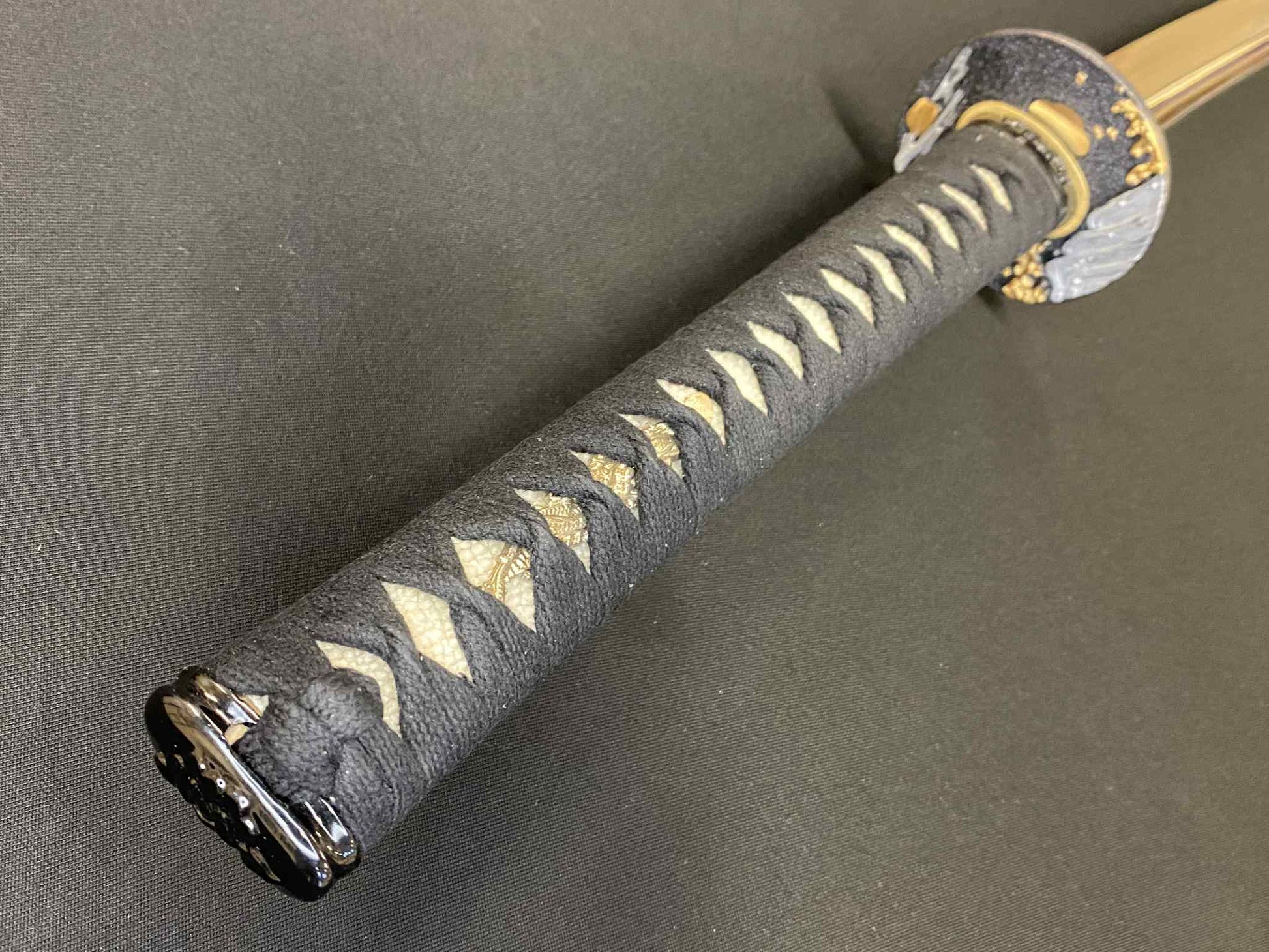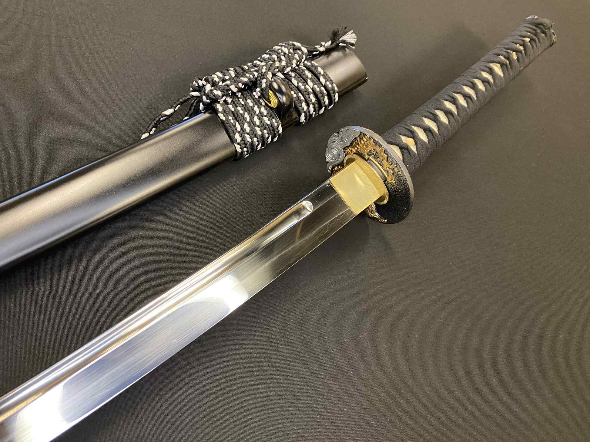 The edge is made of 1095 high carbon steel and the sides made of folded 1060 steel. The blade is differentially-hardened with a beautiful, natural hamon and hada. It has a bohi running from the habaki to the kissaki, making the blade lighter. The tsuka is made of hardwood with white, rayskin panels and wrapped with black, synthetic silk ito. The tsuba, fuchi, kashira and menuki are made of glossy, black, zinc alloys while the habaki and seppa are made of brass.