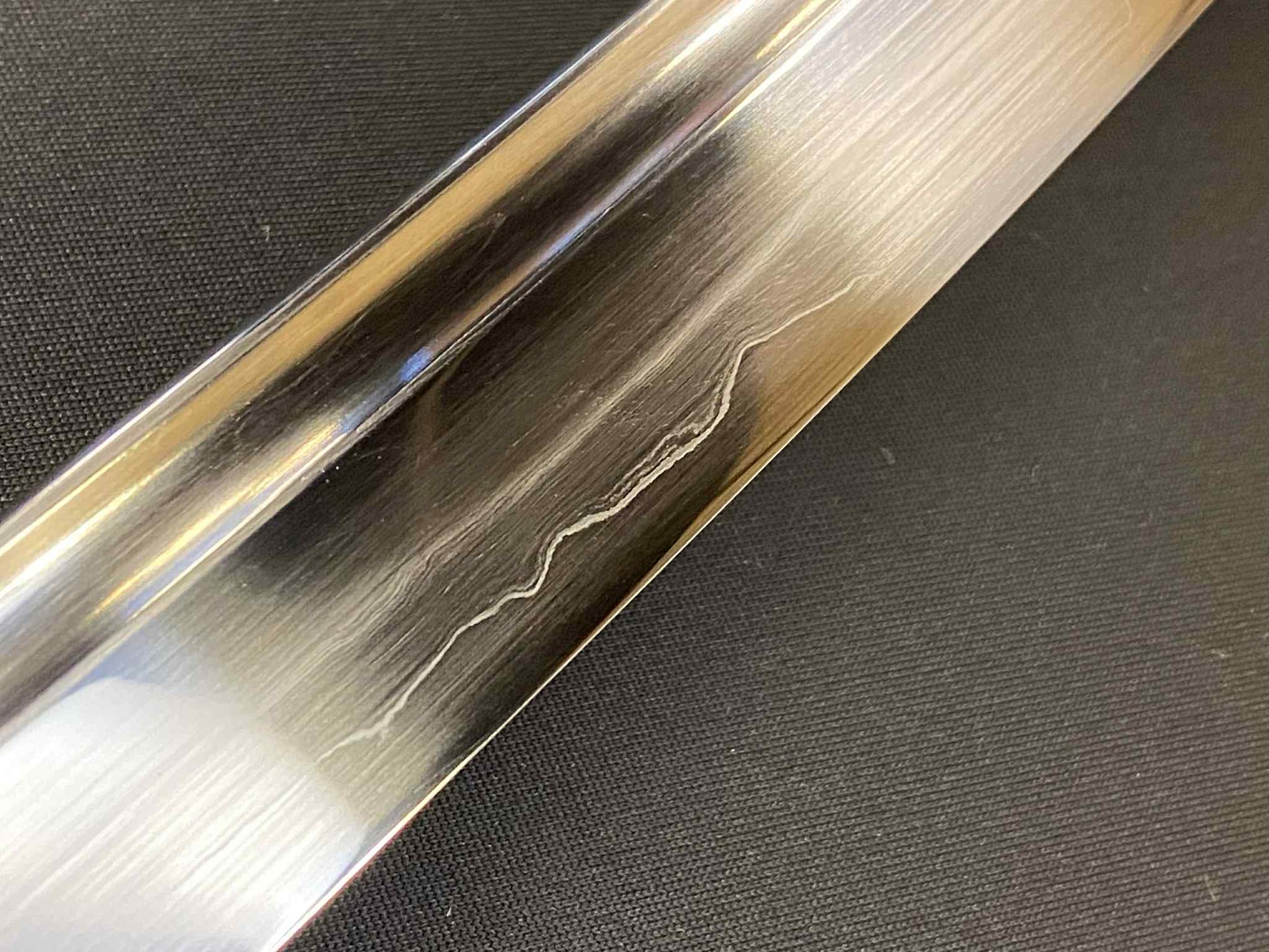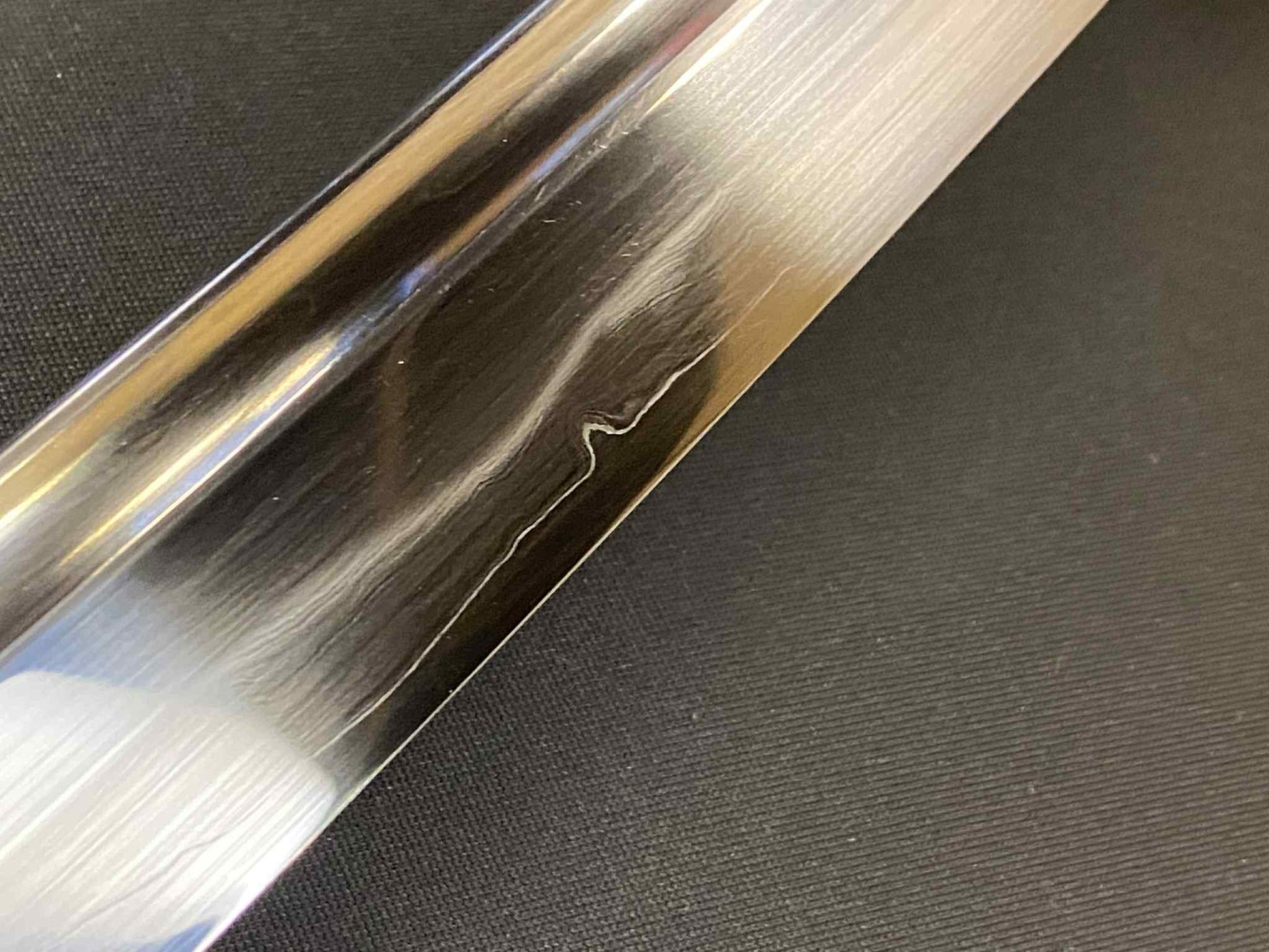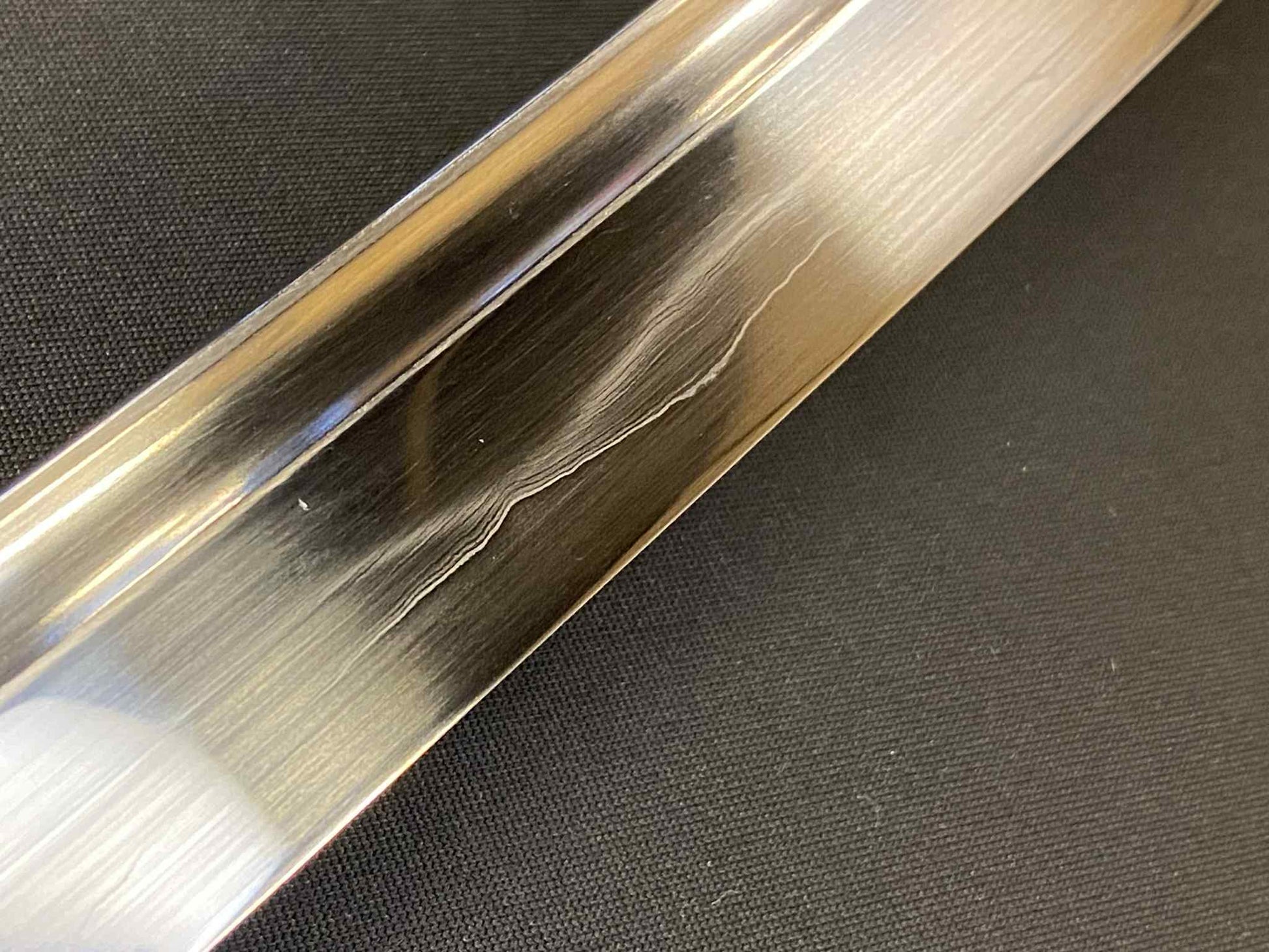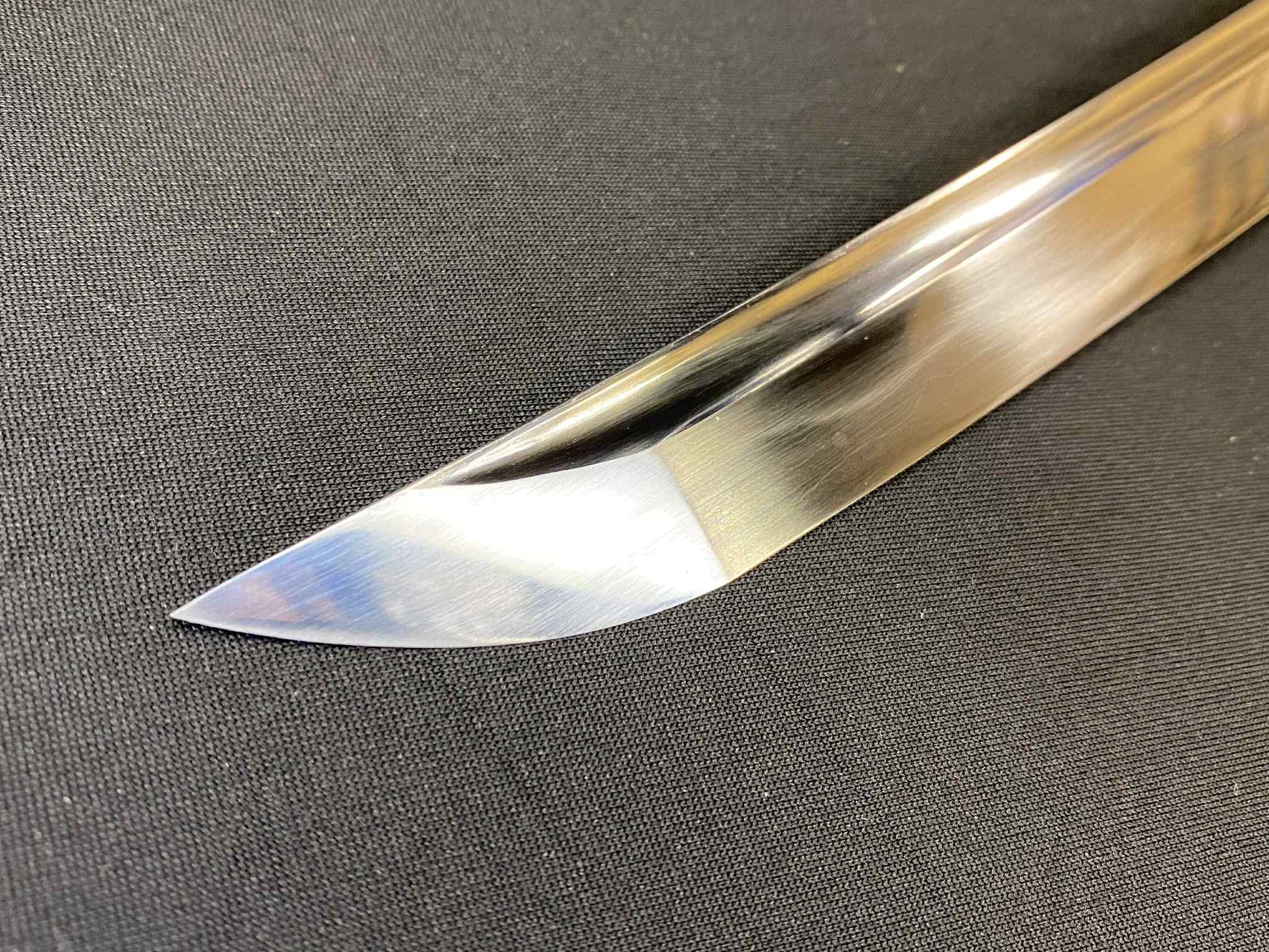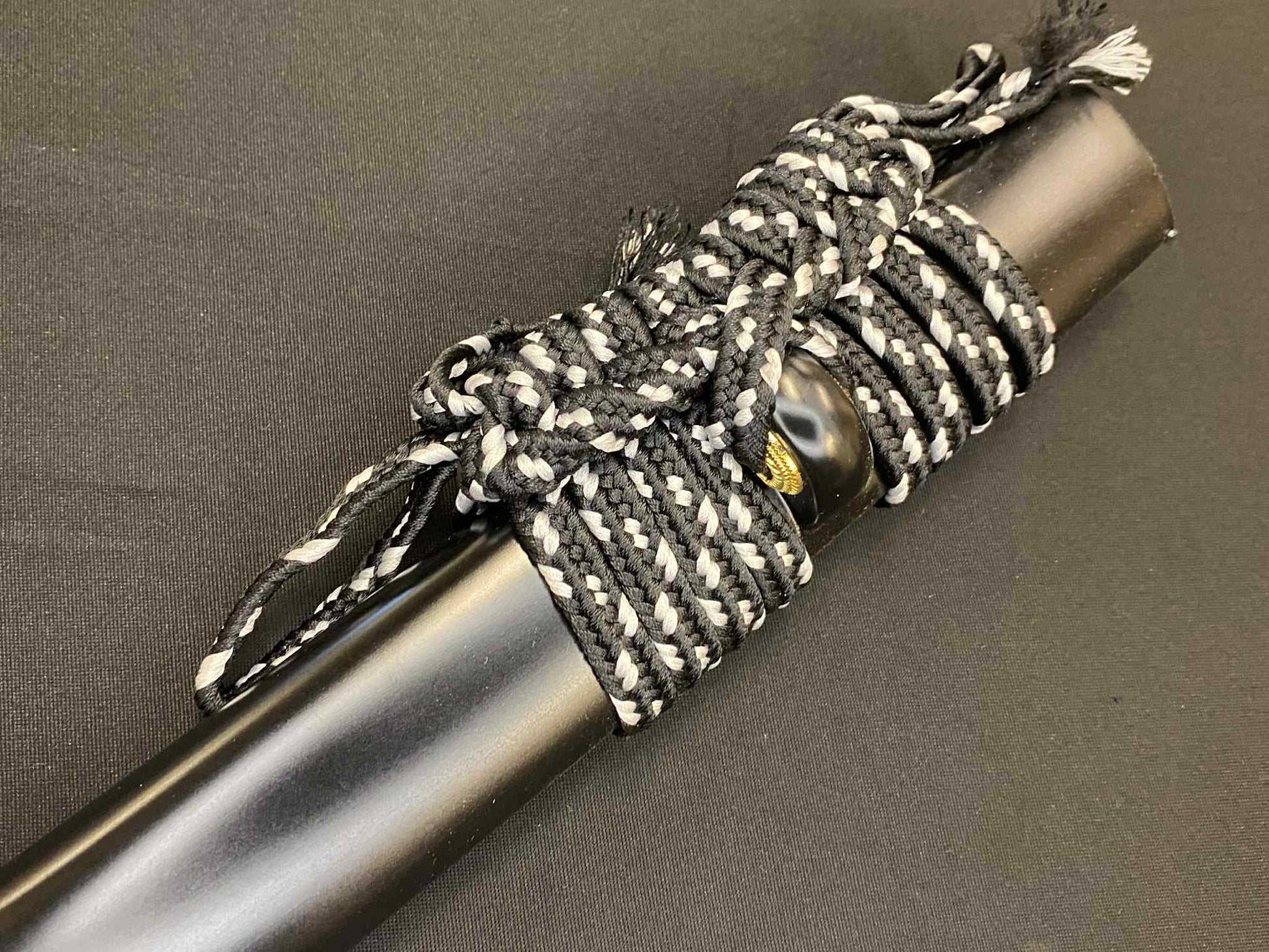 The edge is made of 1095 high carbon steel and the sides made of folded 1060 steel. The blade is differentially-hardened with a beautiful, natural hamon and hada. It has a bohi running from the habaki to the kissaki, making the blade lighter. The tsuka is made of hardwood with white, rayskin panels and wrapped with black, synthetic silk ito. The tsuba, fuchi, kashira and menuki are made of glossy, black, zinc alloys while the habaki and seppa are made of brass.