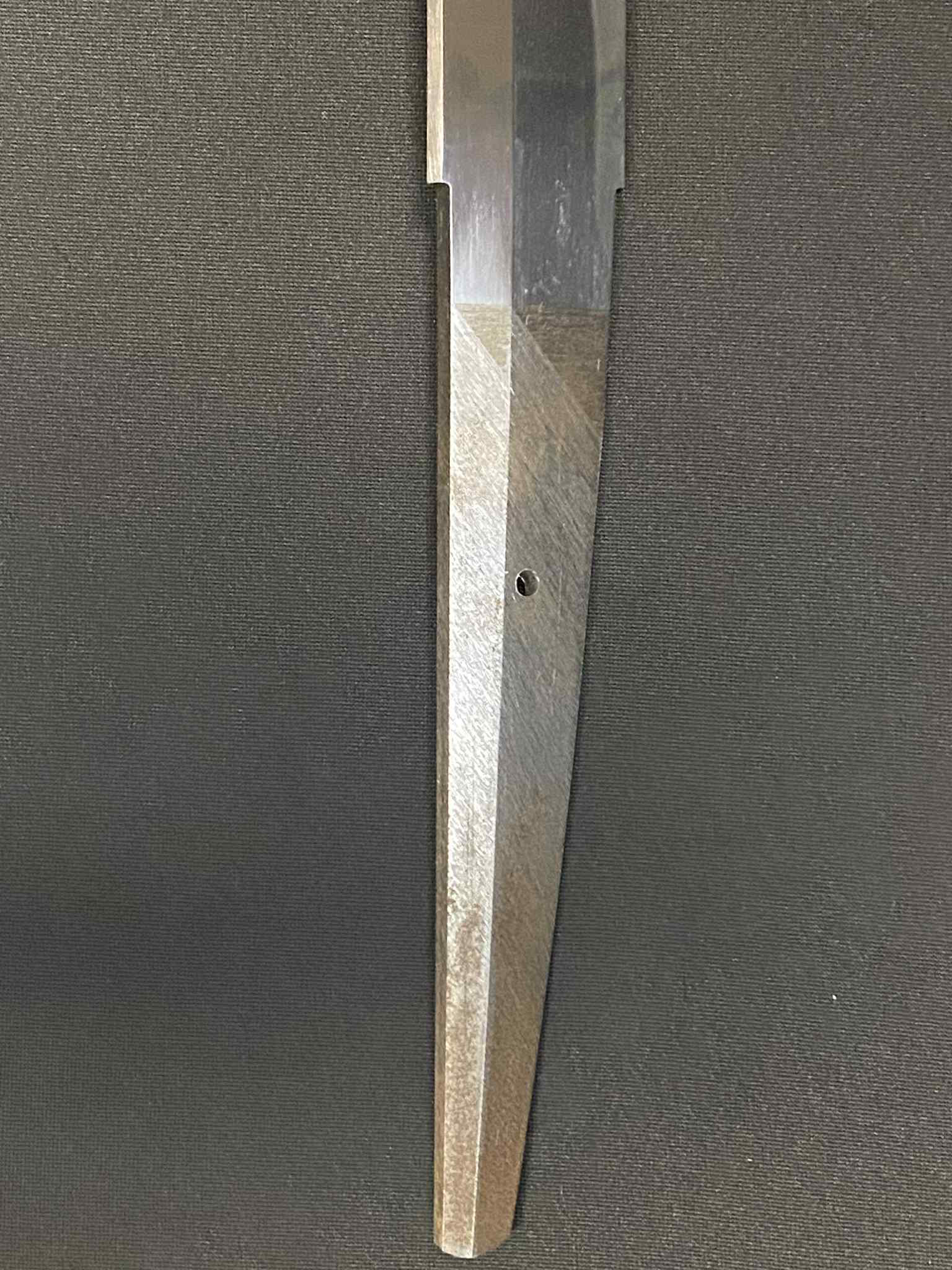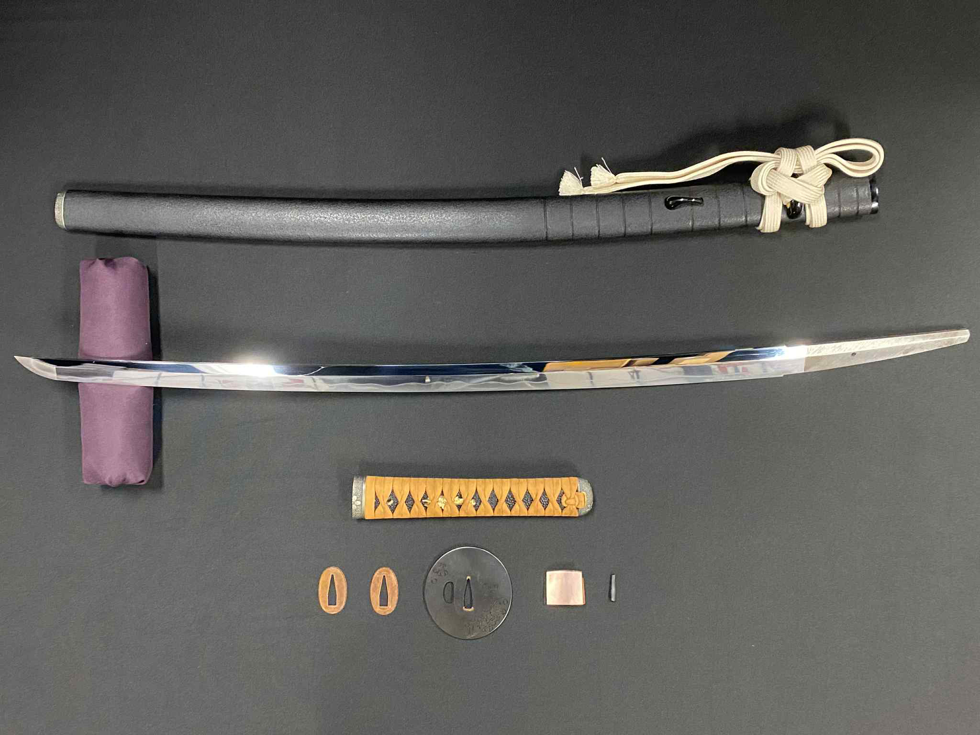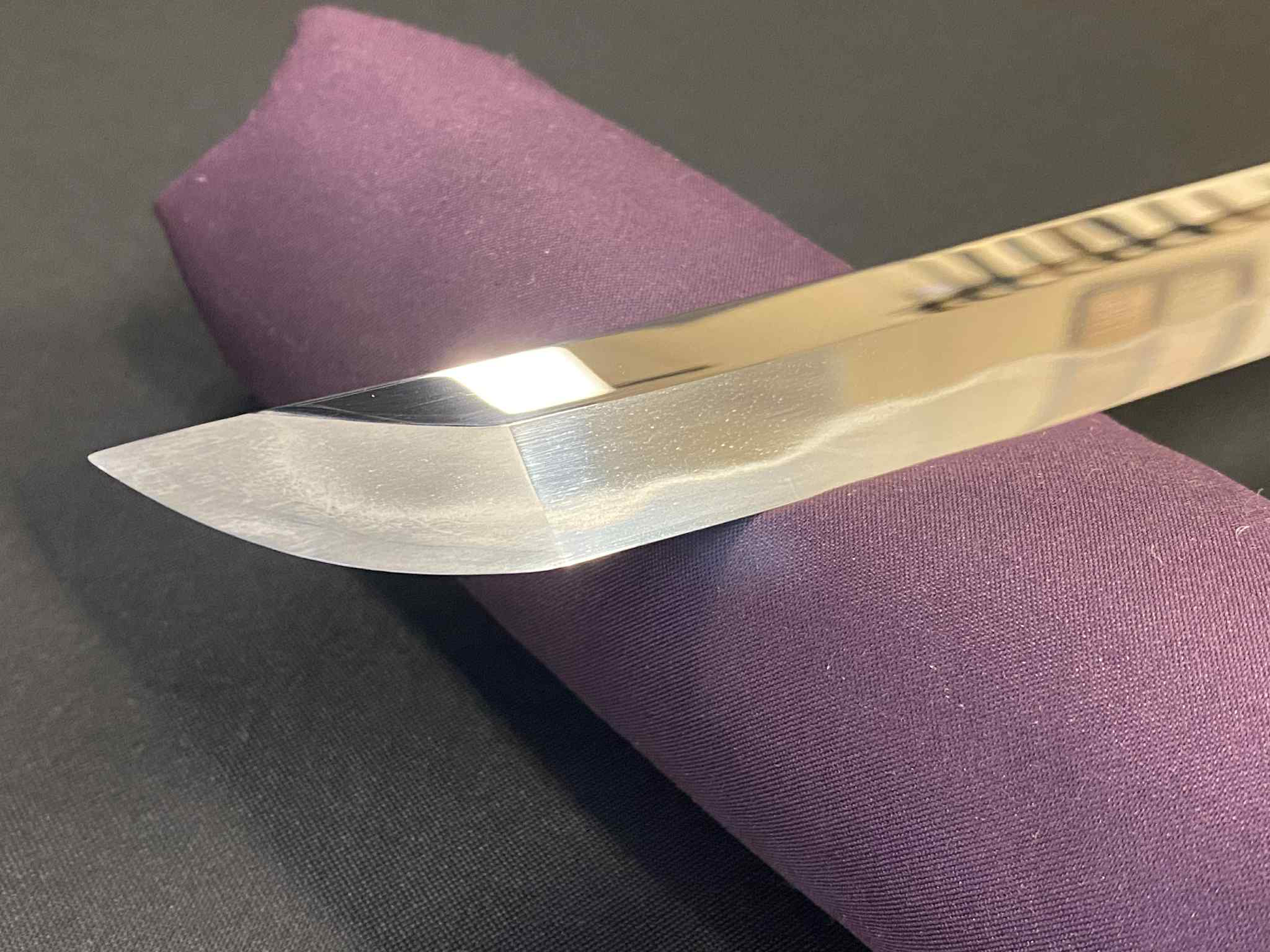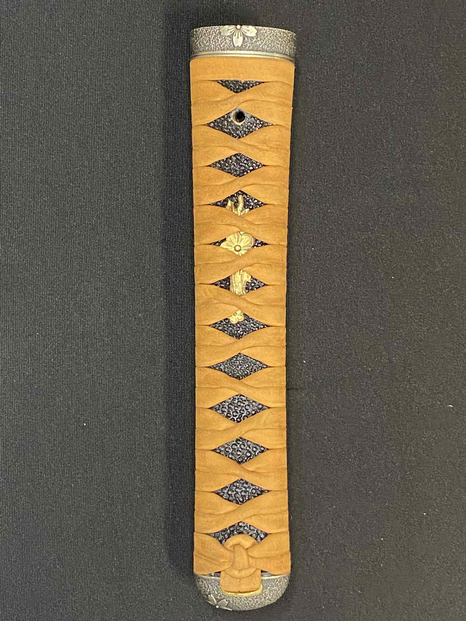 From the master smith at Phoenix Armory comes another one-of-one masterpiece, in the profile of a long Wakizashi. Forged and folded from Orishigane in the Tamahagane traditional method (blade smith-smelted steel), the blade features a beautiful polish that brings out the Notare Hamon in exquisite detail. The hardwood handle features authentic ray skin underneath tan nubuck leather Tsukamaki, making for a comfortable piece to wield and admire. The iron furniture compliments this piece with a flower theme. The Saya features a matte black finish featuring a rib design and also includes a buffalo horn Kaeritsuno. The Saya is completed with an iron Kojiri in the motif matching the flowers theme. A genuine white silk Sageo is included.