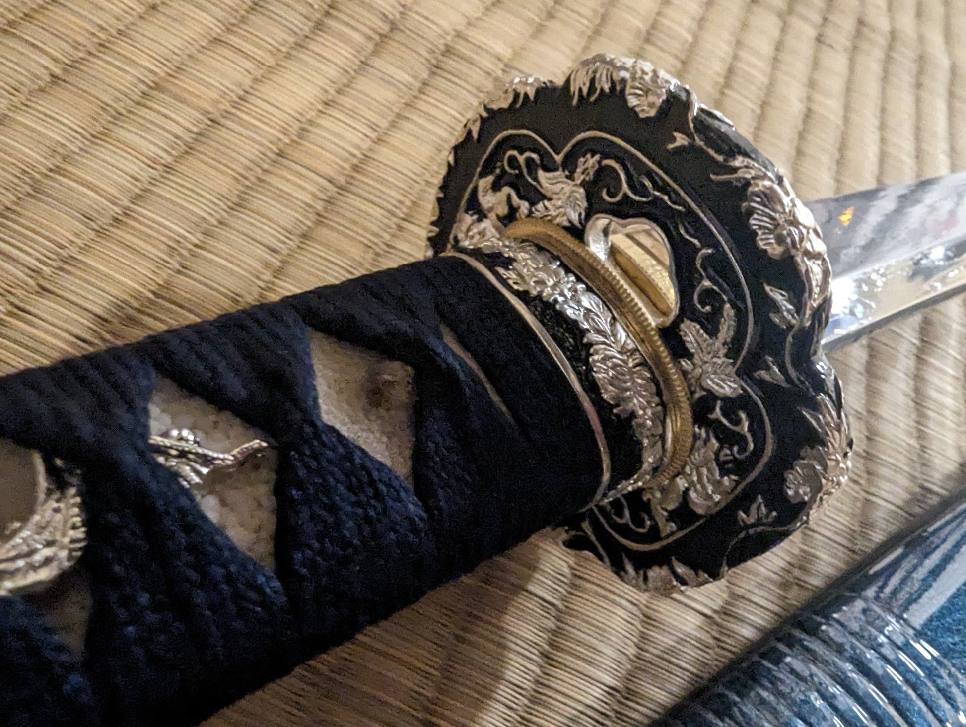 Blacked brass tsuba with silver springtime higlights