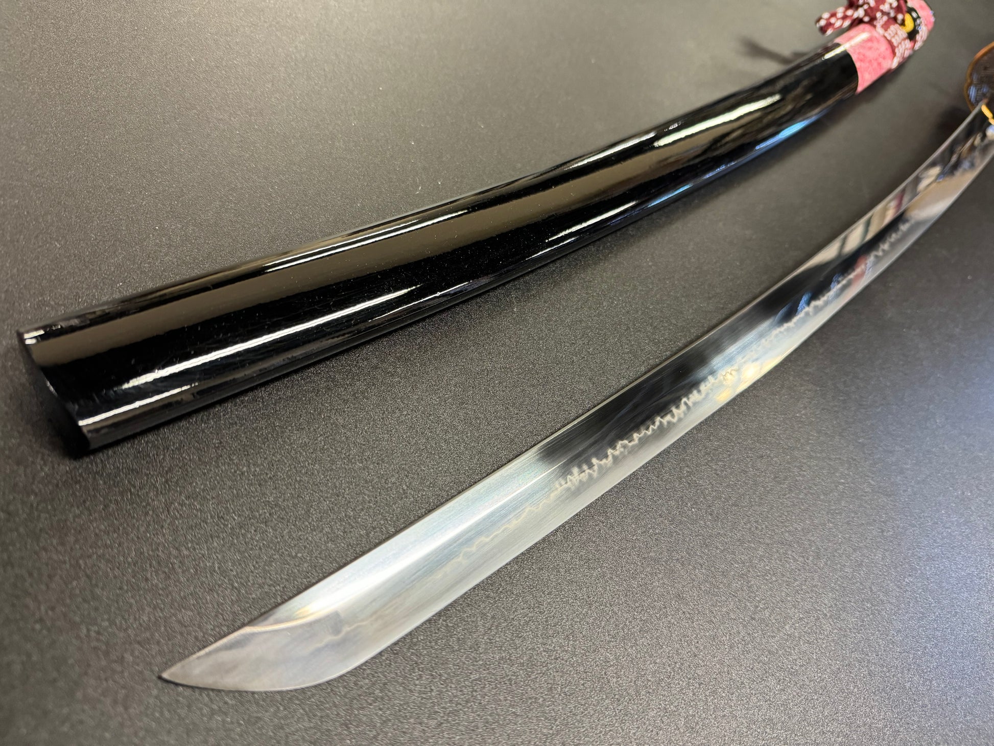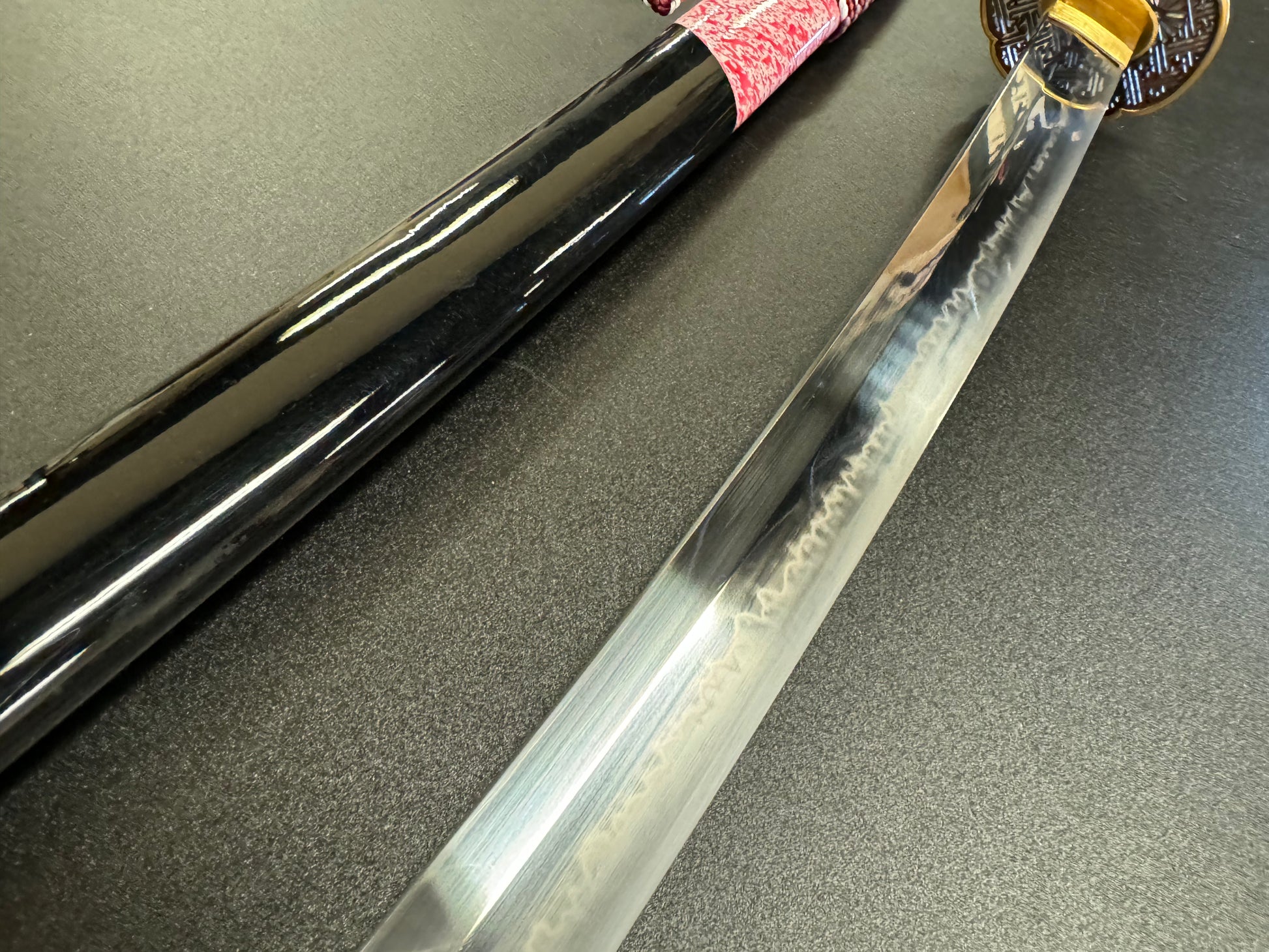 From Moritaka comes this stunning Manji-themed Katana. The blade is forged from T10 tool steel with a stunning natural Hamon and a beautiful hand polish. The brass furniture features a latticed Manji theme throughout.
