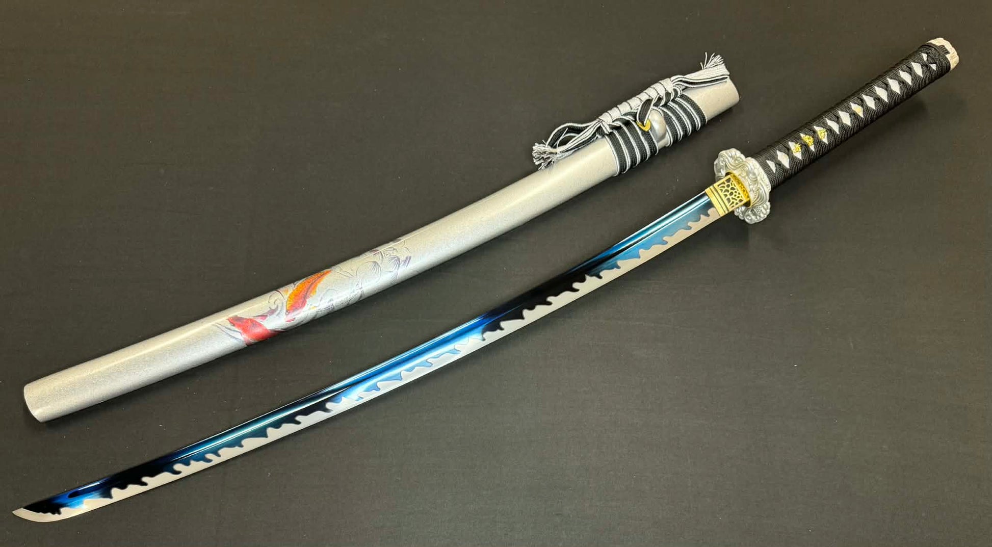 Clean, cold, and deadly in motion—the Ice Carp is forged for practitioners who value speed, resilience, and striking aesthetics. Crafted from tough high-manganese 65Mn steel, this full-tang katana is sharp and ready to cut, delivering reliable performance with every swing. Alloy fittings feature a flowing carp motif, symbolizing strength and perseverance, while black synthetic silk tsukamaki over white imitation samegawa creates a bold, icy contrast. Finished with a blue and white sageo and a saya adorned in an intricate carp pattern, the Ice Carp is a visually stunning, battle-ready blade—perfect for the serious martial artist or collector seeking something truly distinctive. ❄️🐟