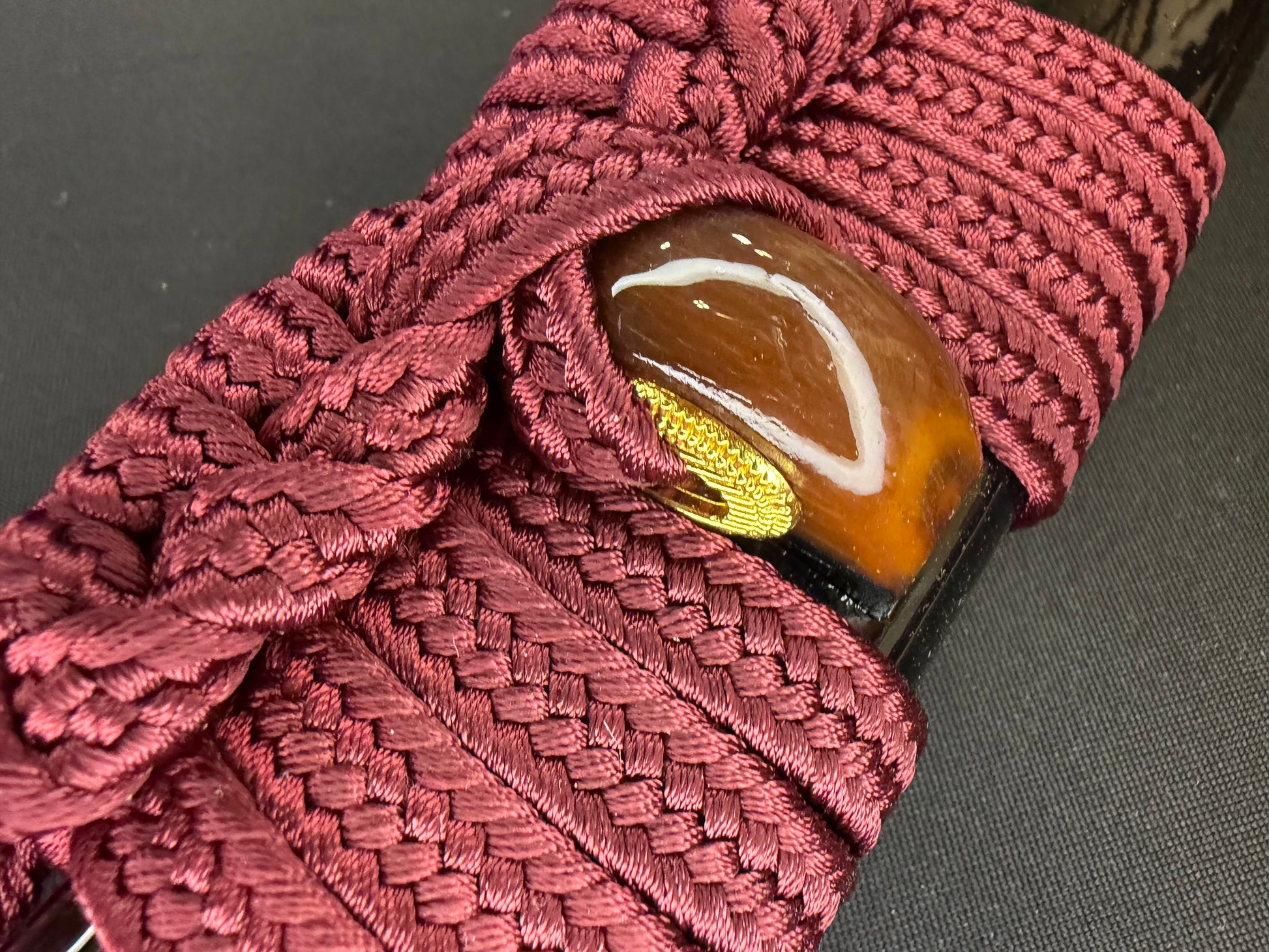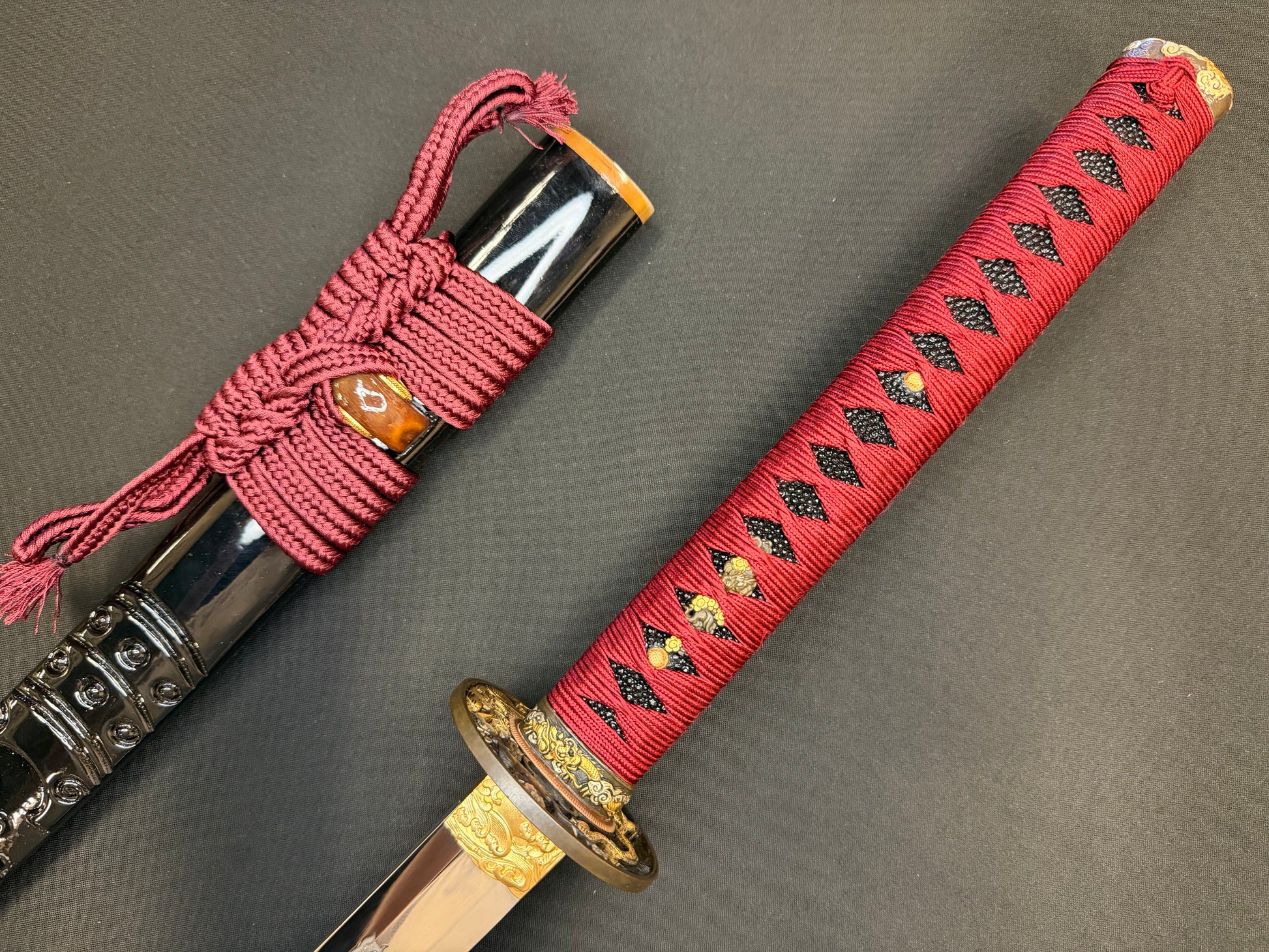 The best blade smiths at Phoenix Armory strike again with another unique one-of-one Katana - the Bloodclaw. This beast of a sword is forged from Orishigane (smith-smelted steel) in the Tamahagane tradition. It features full tang construction with a gorgeous polish, bringing out an exquisite Suguha Hamon line. Adding to the piece is a dragon Horimono carving in the blade. The hardwood handle features authentic black-dyed ray skin under real Japanese silk Tsuka Ito in a deep red color. The furniture follows, crafted from plated brass in a dragon motif. The Saya features an intricate dragon carving, along with ox horn Kojiri, Kurikata, and Koiguchi with red Sageo. A beautifully-crafted Katana suitable for any serious collector.